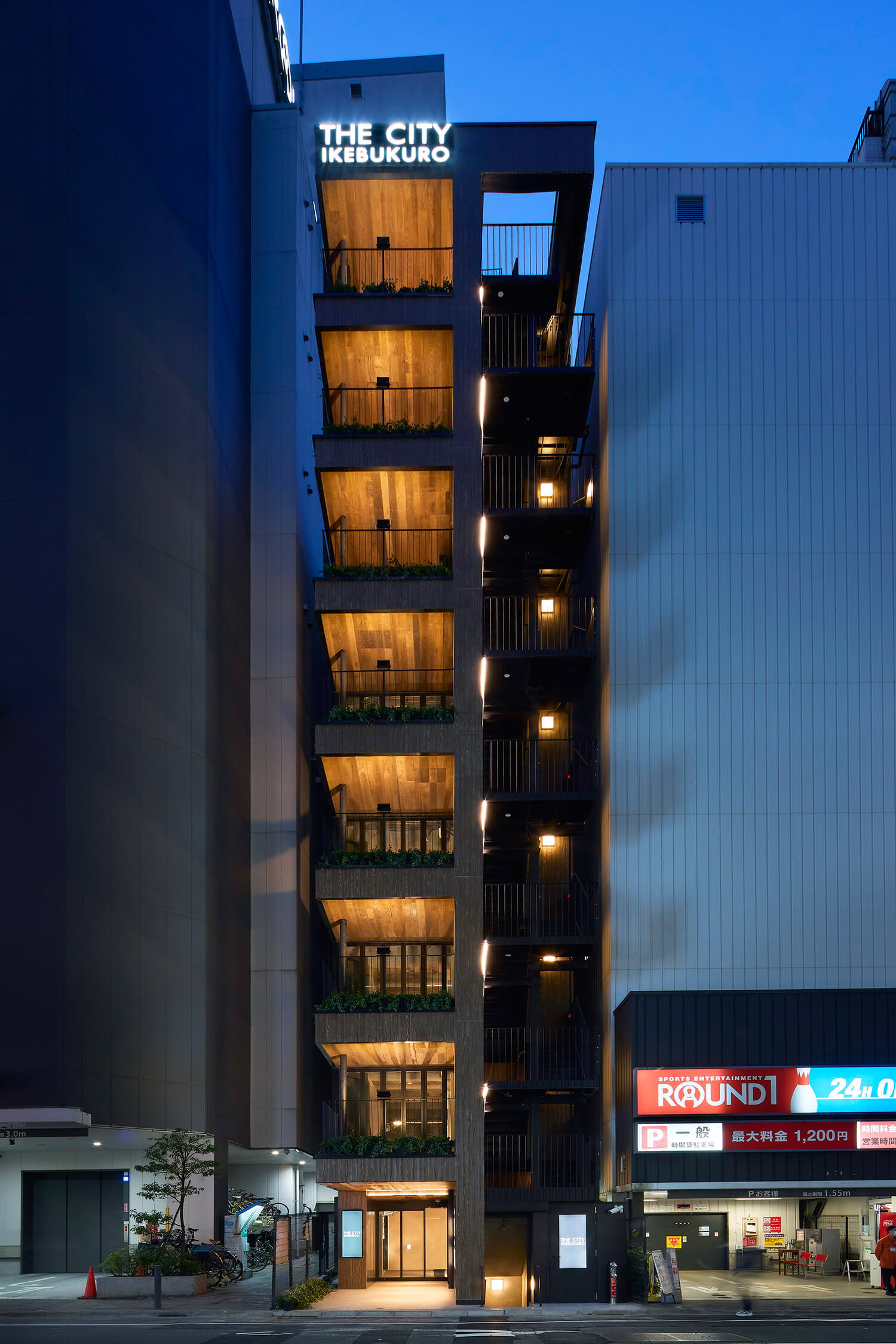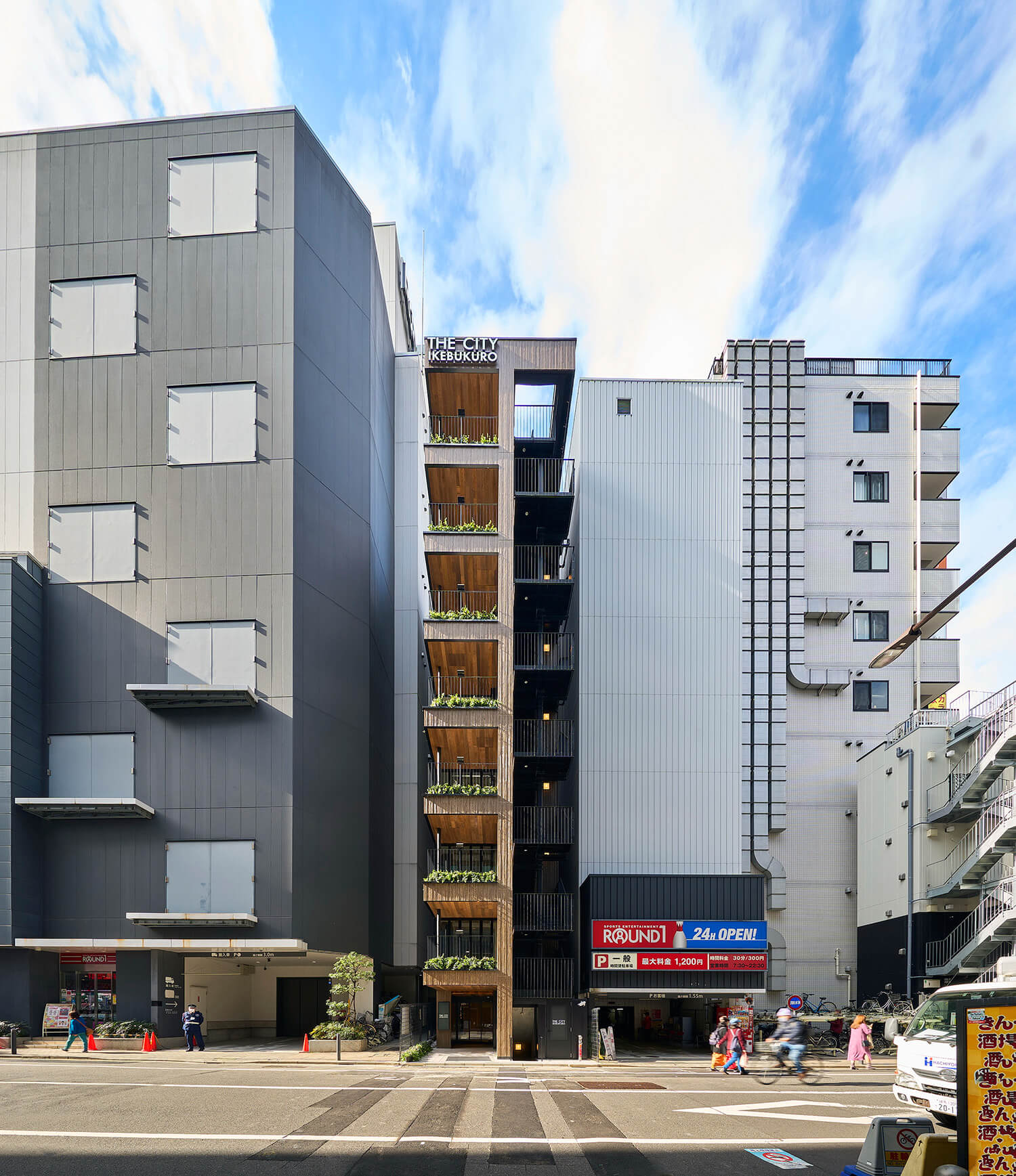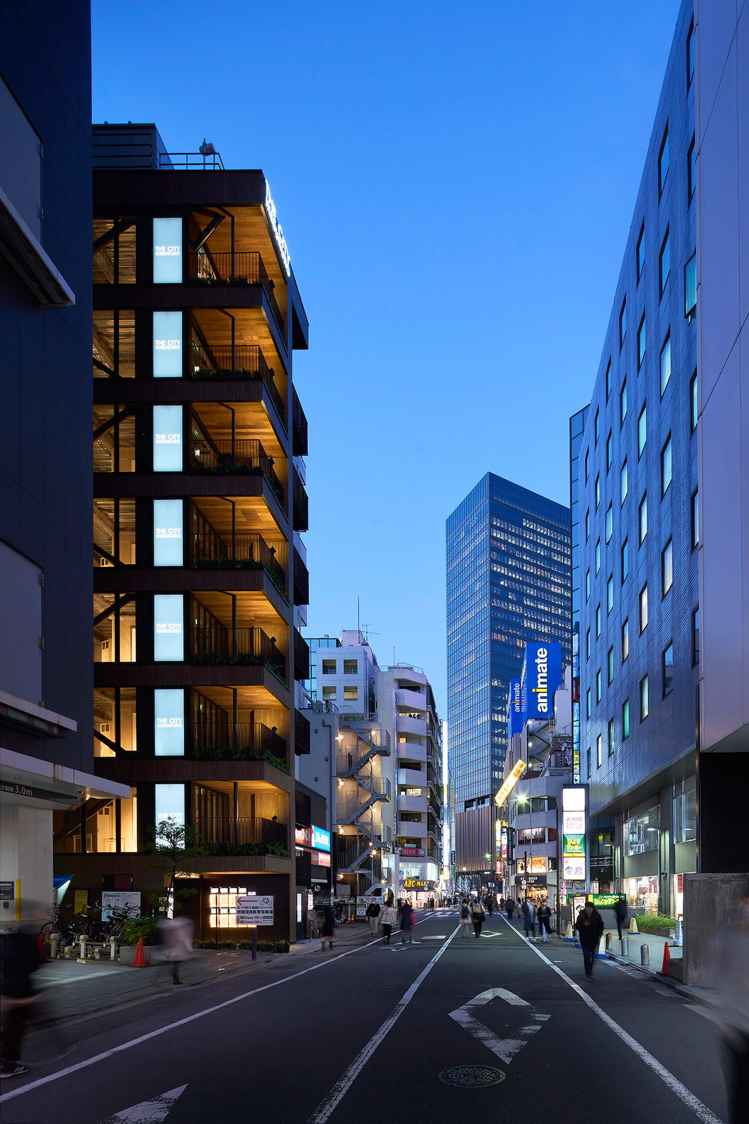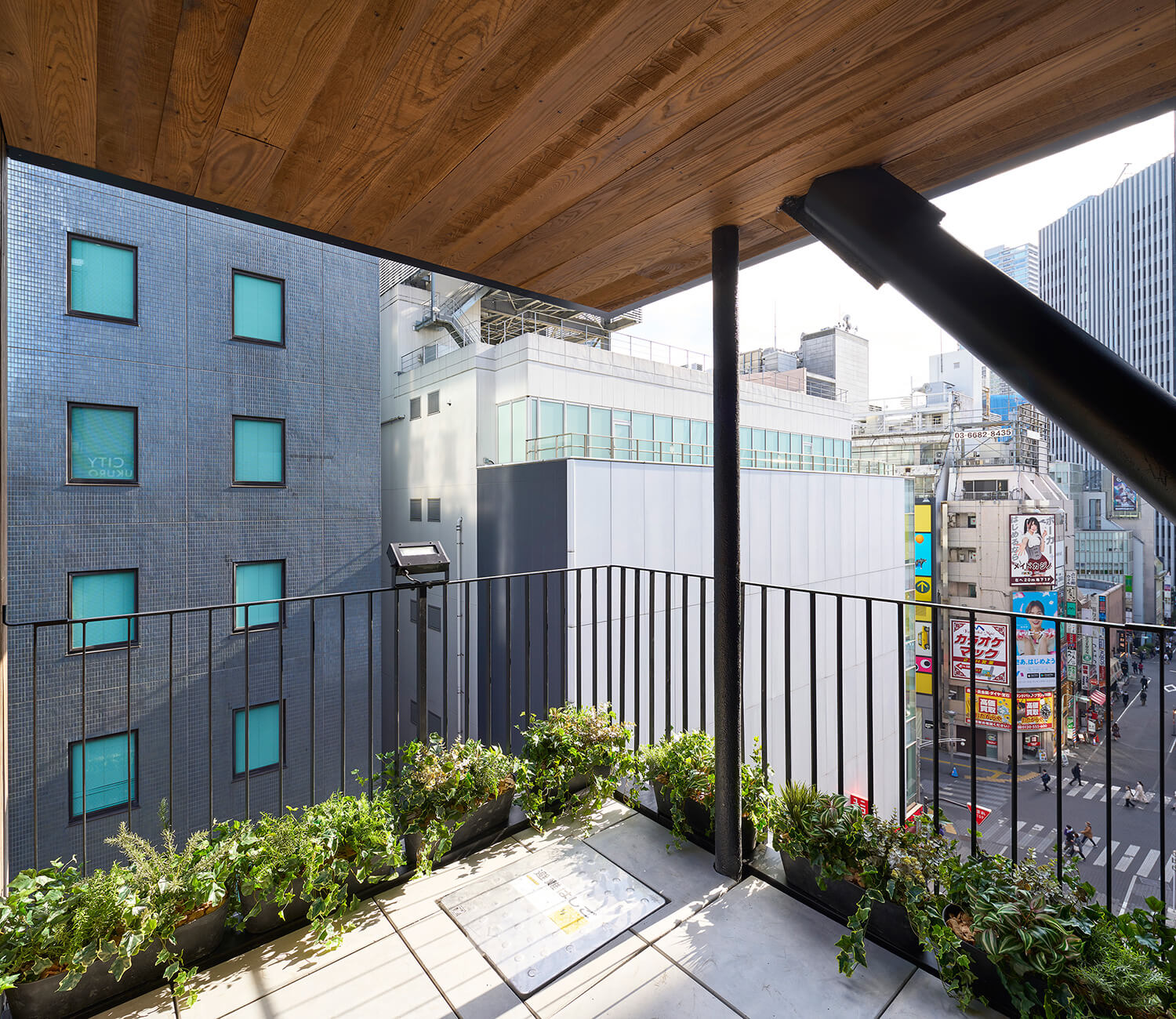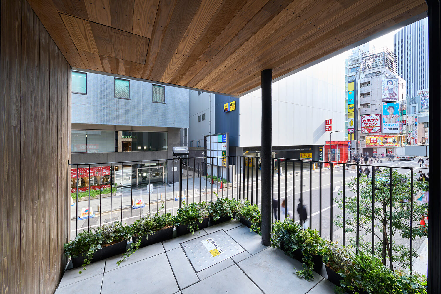 A commercial tenant building with eight floors above ground and one below on a site between the large Round One building and the Round One mechanical car park building, facing the side road connecting Sunshine 60 Street and Sunshine Street leading from the Ikebukuro East Exit to Sunshine 60. The narrow site with a frontage of 6.8m and a depth of 16m would normally limit the appeal of the facade to the front only, but the Round One buildings on either side are set back 3m to make room for a 10-storey building, allowing part of the sides to be shown as facade as well as the front. The first floor section is designed to use this protruding shape to invite people in. The more heavily trafficked Sunshine 60 Street side juts out to guide people to the common elevator hall and the entrance to the first-floor shops. On the opposite side of Sunshine Street, an outdoor evacuation staircase has been installed to guide people to the basement tenants. We have been actively proposing the construction of food and beverage tenant buildings that we have designed, such as the Terrace Building in Ebisu and the Kanda Terrace, even before the Corona Disaster, but since the Corona Disaster, more and more tenants have requested outdoor spaces, such as terraces. This building also has a 2.5 m square terrace on the side façade on the Sunshine 60 Street side. As there is an opening restriction of 2 m around the outdoor evacuation staircase, if the facade surface next to the staircase is pushed out to the front, almost all of the facade surface becomes a wall, but by setting the terrace back, the opening restriction is circumvented and a large opening is created. To allow the terrace to be used as a continuous interior/exterior space, folding sashes were installed that can be opened all the way. When approaching from Sunshine 60 Street, this stacked terrace looks like a large sleeve sign, which can appeal to the street with its liveliness. When approaching the building further, the façade ceases to be visible as an elevation, and the back of the eaves, which can be seen looking up, becomes the façade. The eaves of this terrace are finished in smoked ash and are further illuminated by lights installed above the balustrade, creating a three-dimensional representation of the building’s most visible eaves ceiling surface as another facade. The exterior face of the asrock is also wood-grained and painted in a wood tone to contrast its organic appearance against the monotone Round One building. By creating a three-dimensional vertical garden terrace, each restaurant has a space that can be more involved in the city and raises a dynamic public landscape where people can enjoy a meal in a city where people and traffic come and go.