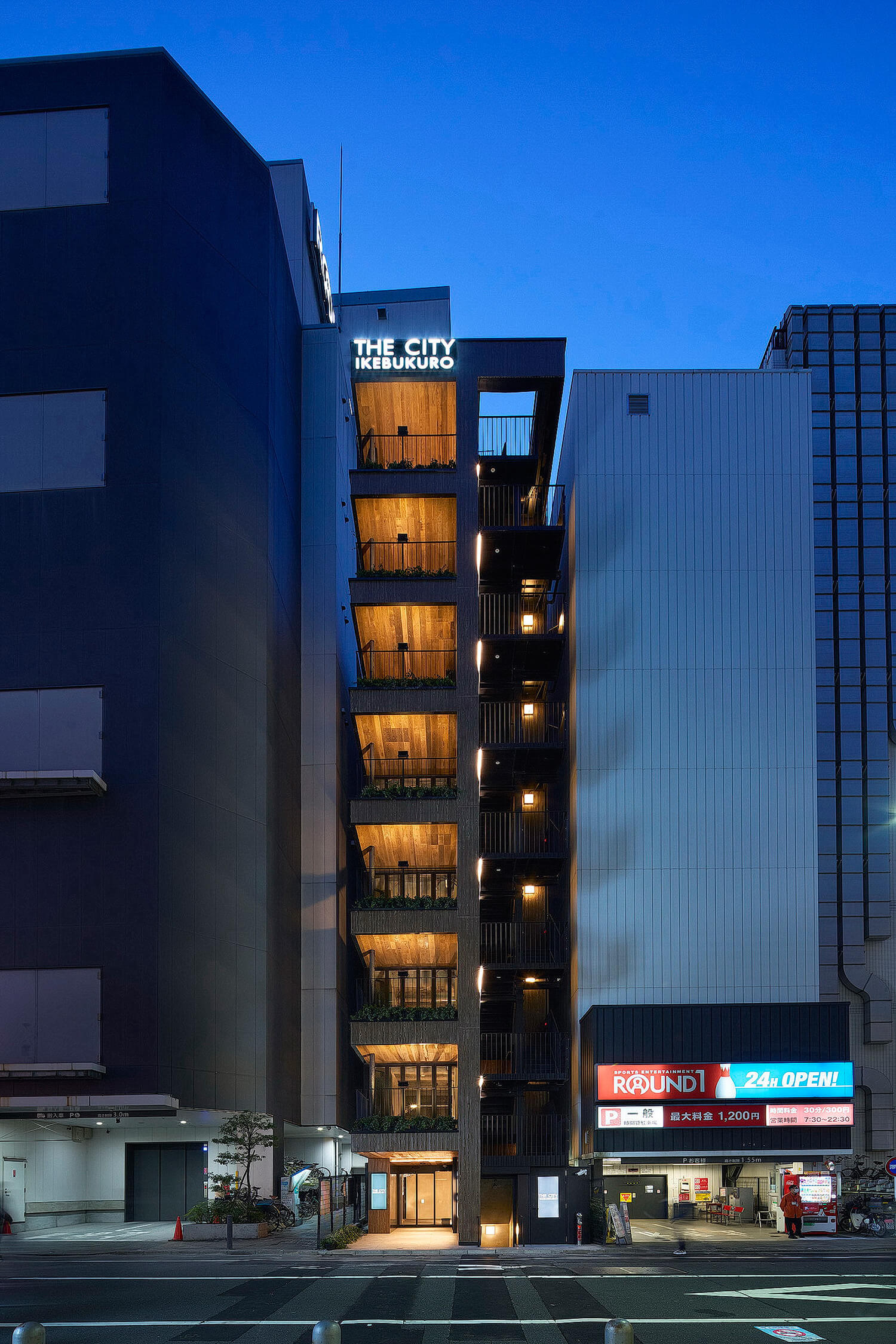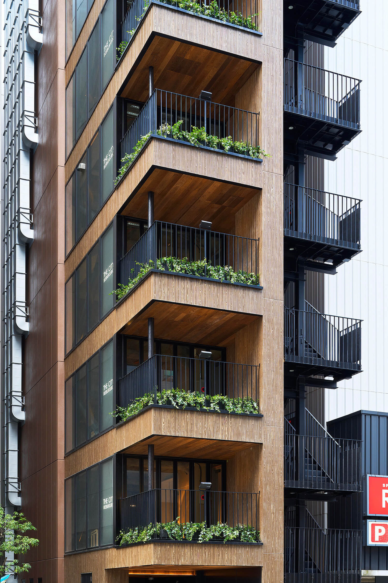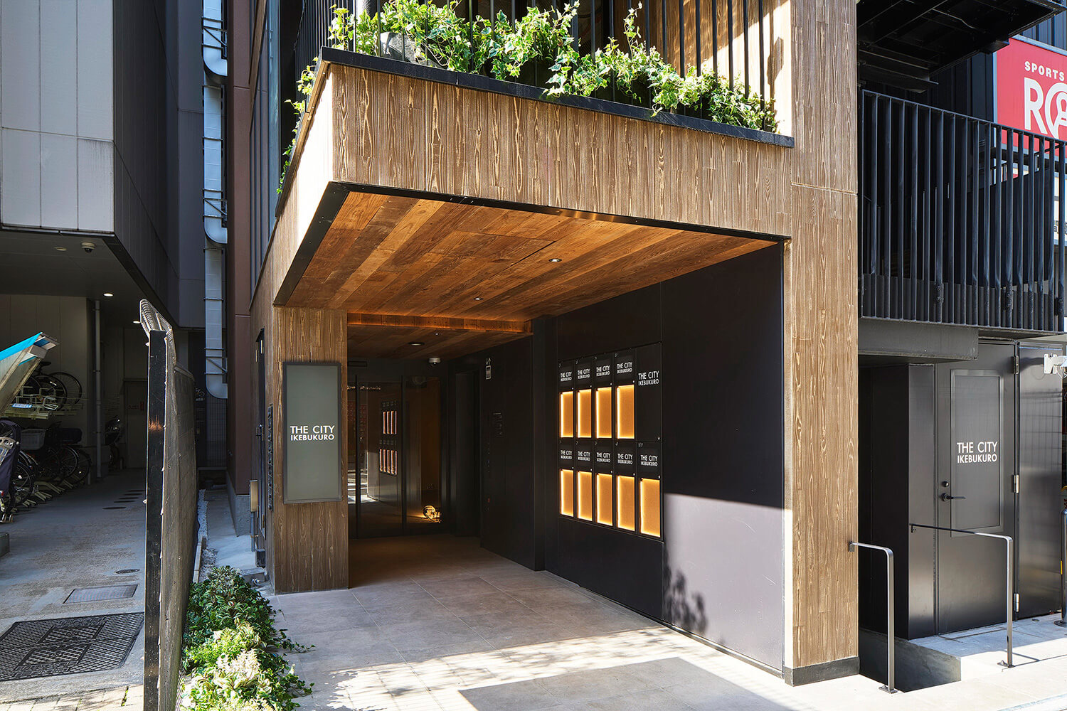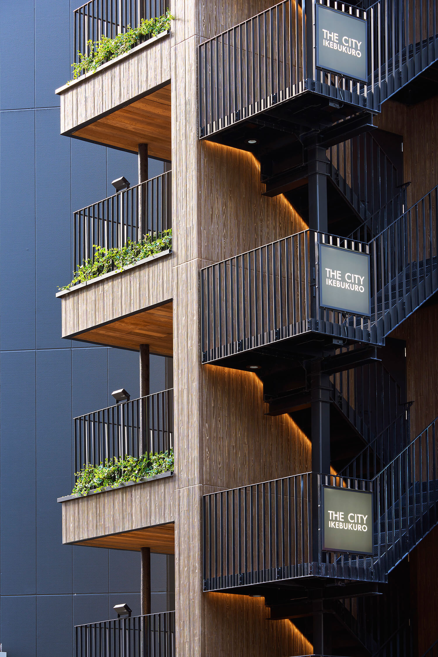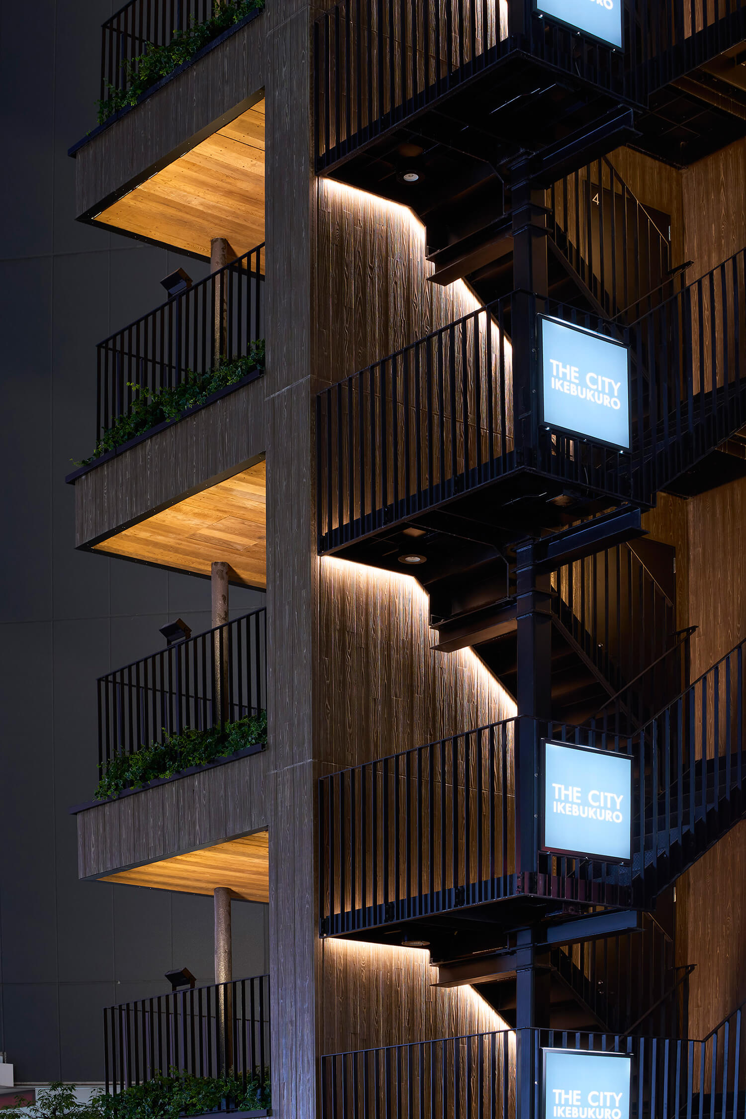 A commercial tenant building with eight floors above ground and one below on a site between the large Round One building and the Round One mechanical car park building, facing the side road connecting Sunshine 60 Street and Sunshine Street leading from the Ikebukuro East Exit to Sunshine 60. The narrow site with a frontage of 6.8m and a depth of 16m would normally limit the appeal of the facade to the front only, but the Round One buildings on either side are set back 3m to make room for a 10-storey building, allowing part of the sides to be shown as facade as well as the front. The first floor section is designed to use this protruding shape to invite people in. The more heavily trafficked Sunshine 60 Street side juts out to guide people to the common elevator hall and the entrance to the first-floor shops. On the opposite side of Sunshine Street, an outdoor evacuation staircase has been installed to guide people to the basement tenants. We have been actively proposing the construction of food and beverage tenant buildings that we have designed, such as the Terrace Building in Ebisu and the Kanda Terrace, even before the Corona Disaster, but since the Corona Disaster, more and more tenants have requested outdoor spaces, such as terraces. This building also has a 2.5 m square terrace on the side façade on the Sunshine 60 Street side. As there is an opening restriction of 2 m around the outdoor evacuation staircase, if the facade surface next to the staircase is pushed out to the front, almost all of the facade surface becomes a wall, but by setting the terrace back, the opening restriction is circumvented and a large opening is created. To allow the terrace to be used as a continuous interior/exterior space, folding sashes were installed that can be opened all the way. When approaching from Sunshine 60 Street, this stacked terrace looks like a large sleeve sign, which can appeal to the street with its liveliness. When approaching the building further, the façade ceases to be visible as an elevation, and the back of the eaves, which can be seen looking up, becomes the façade. The eaves of this terrace are finished in smoked ash and are further illuminated by lights installed above the balustrade, creating a three-dimensional representation of the building’s most visible eaves ceiling surface as another facade. The exterior face of the asrock is also wood-grained and painted in a wood tone to contrast its organic appearance against the monotone Round One building. By creating a three-dimensional vertical garden terrace, each restaurant has a space that can be more involved in the city and raises a dynamic public landscape where people can enjoy a meal in a city where people and traffic come and go.