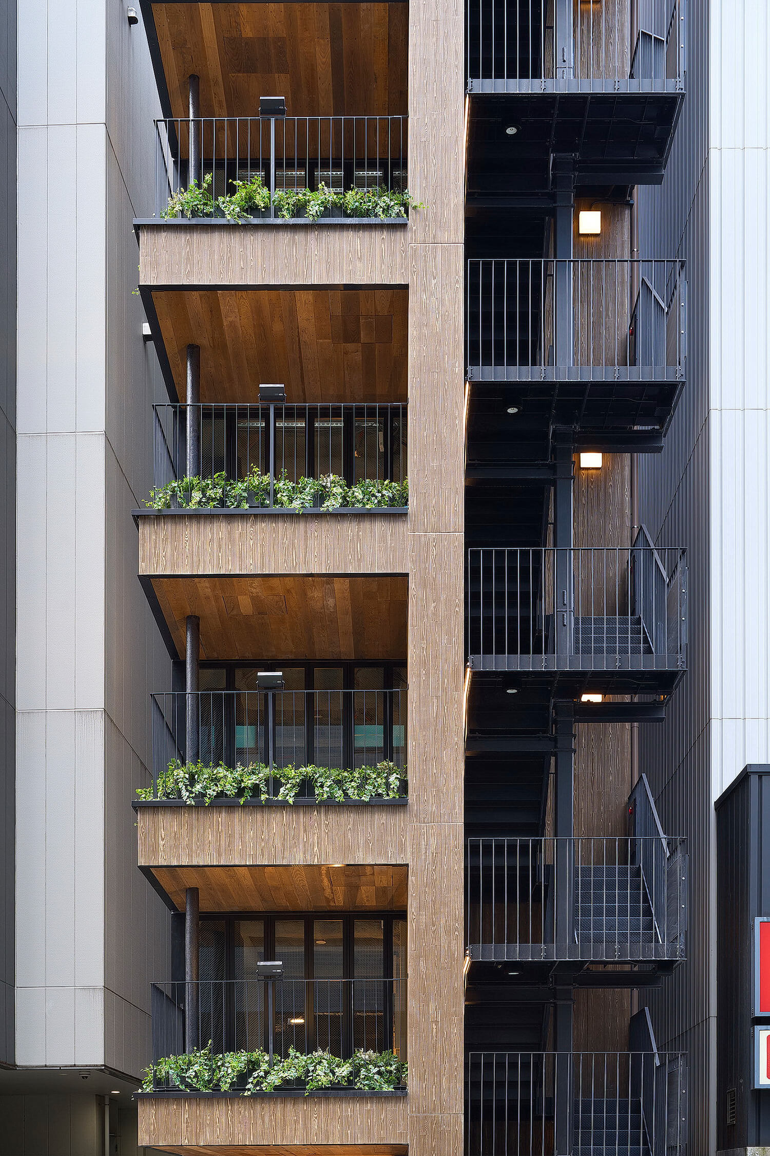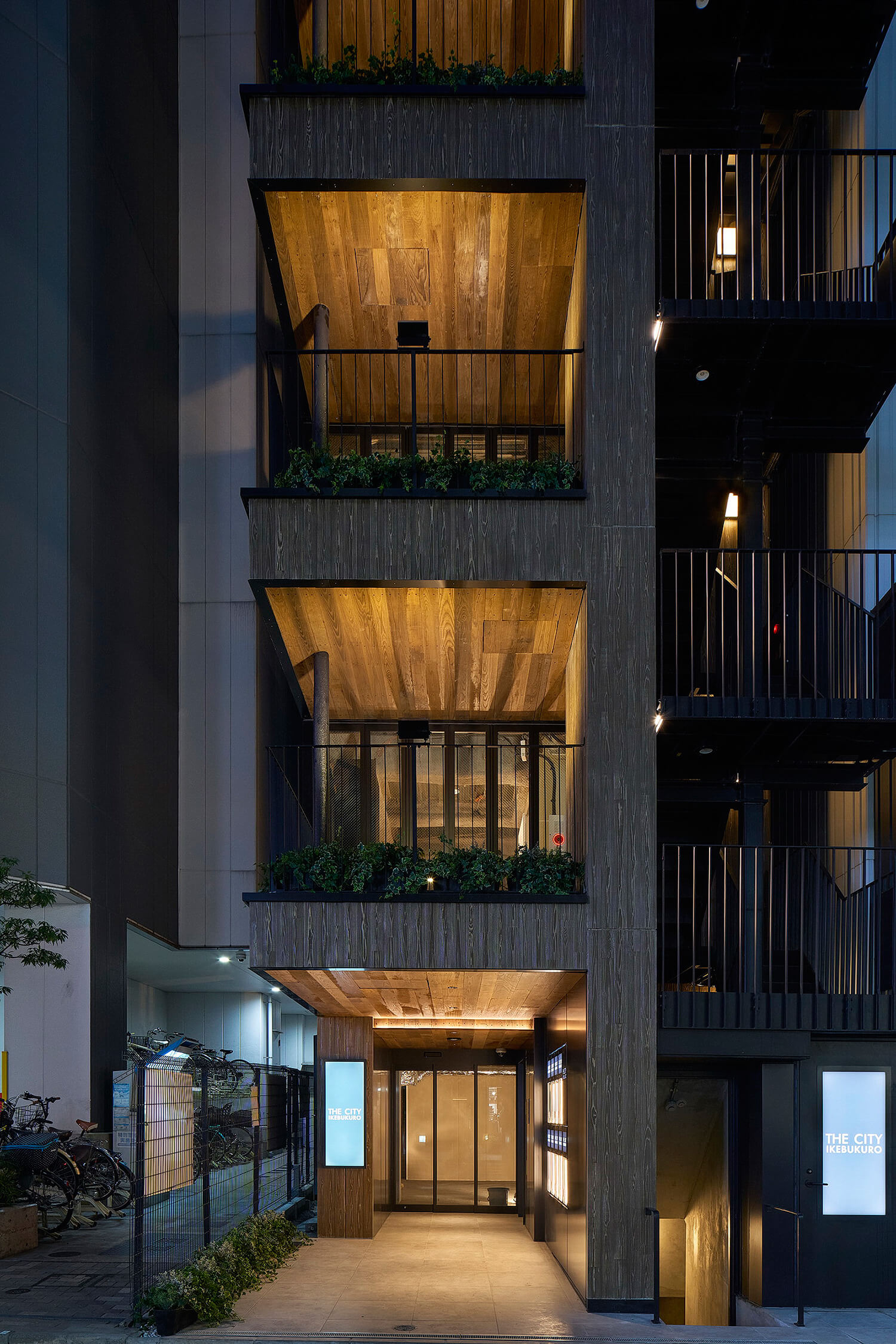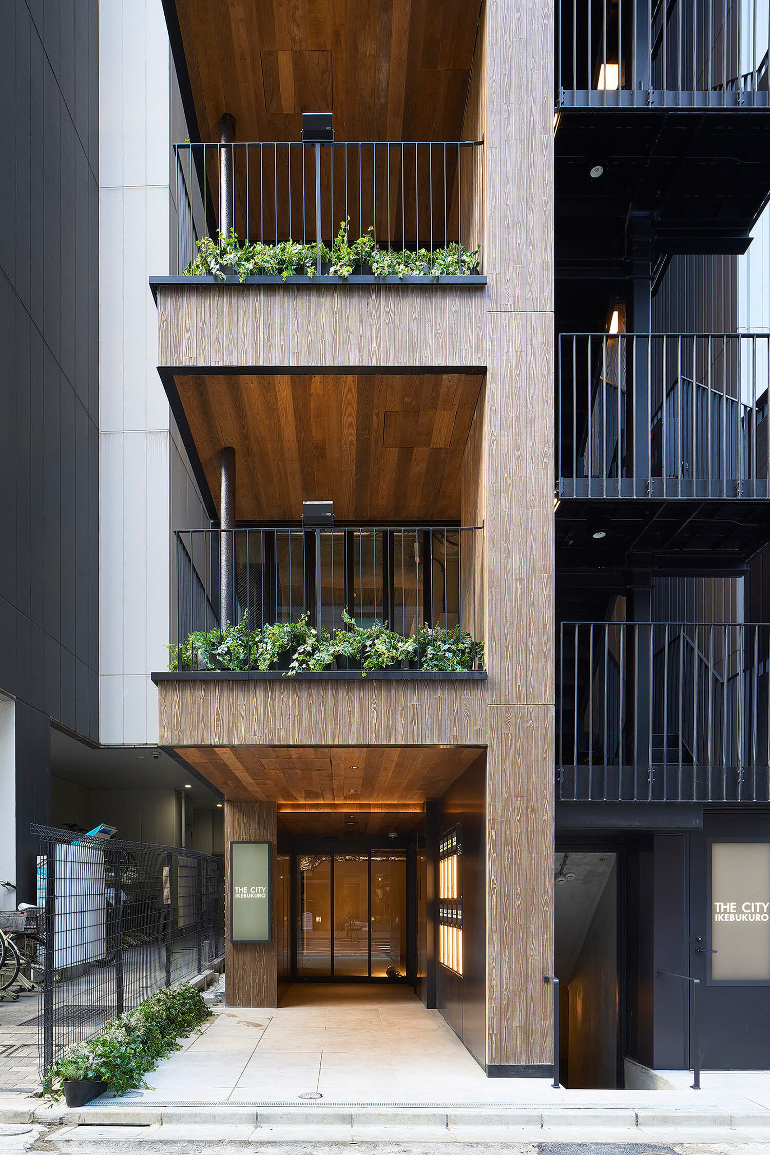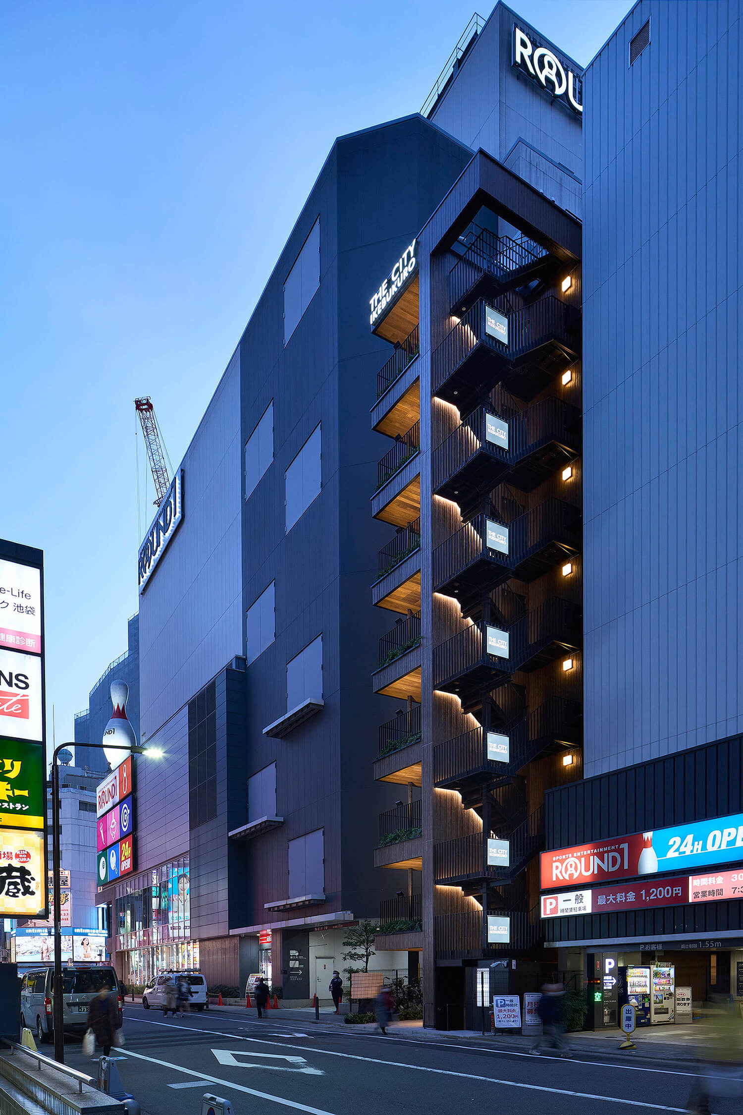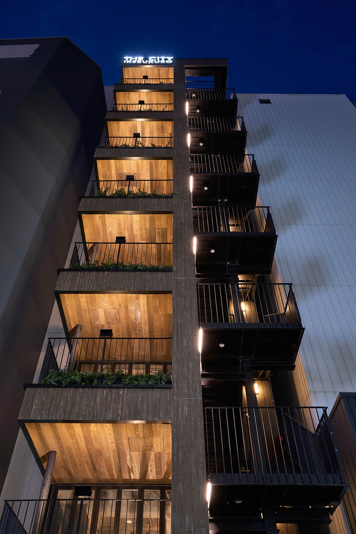 A commercial tenant building with eight floors above ground and one below on a site between the large Round One building and the Round One mechanical car park building, facing the side road connecting Sunshine 60 Street and Sunshine Street leading from the Ikebukuro East Exit to Sunshine 60. The narrow site with a frontage of 6.8m and a depth of 16m would normally limit the appeal of the facade to the front only, but the Round One buildings on either side are set back 3m to make room for a 10-storey building, allowing part of the sides to be shown as facade as well as the front. The first floor section is designed to use this protruding shape to invite people in. The more heavily trafficked Sunshine 60 Street side juts out to guide people to the common elevator hall and the entrance to the first-floor shops. On the opposite side of Sunshine Street, an outdoor evacuation staircase has been installed to guide people to the basement tenants. We have been actively proposing the construction of food and beverage tenant buildings that we have designed, such as the Terrace Building in Ebisu and the Kanda Terrace, even before the Corona Disaster, but since the Corona Disaster, more and more tenants have requested outdoor spaces, such as terraces. This building also has a 2.5 m square terrace on the side façade on the Sunshine 60 Street side. As there is an opening restriction of 2 m around the outdoor evacuation staircase, if the facade surface next to the staircase is pushed out to the front, almost all of the facade surface becomes a wall, but by setting the terrace back, the opening restriction is circumvented and a large opening is created. To allow the terrace to be used as a continuous interior/exterior space, folding sashes were installed that can be opened all the way. When approaching from Sunshine 60 Street, this stacked terrace looks like a large sleeve sign, which can appeal to the street with its liveliness. When approaching the building further, the façade ceases to be visible as an elevation, and the back of the eaves, which can be seen looking up, becomes the façade. The eaves of this terrace are finished in smoked ash and are further illuminated by lights installed above the balustrade, creating a three-dimensional representation of the building’s most visible eaves ceiling surface as another facade. The exterior face of the asrock is also wood-grained and painted in a wood tone to contrast its organic appearance against the monotone Round One building. By creating a three-dimensional vertical garden terrace, each restaurant has a space that can be more involved in the city and raises a dynamic public landscape where people can enjoy a meal in a city where people and traffic come and go.