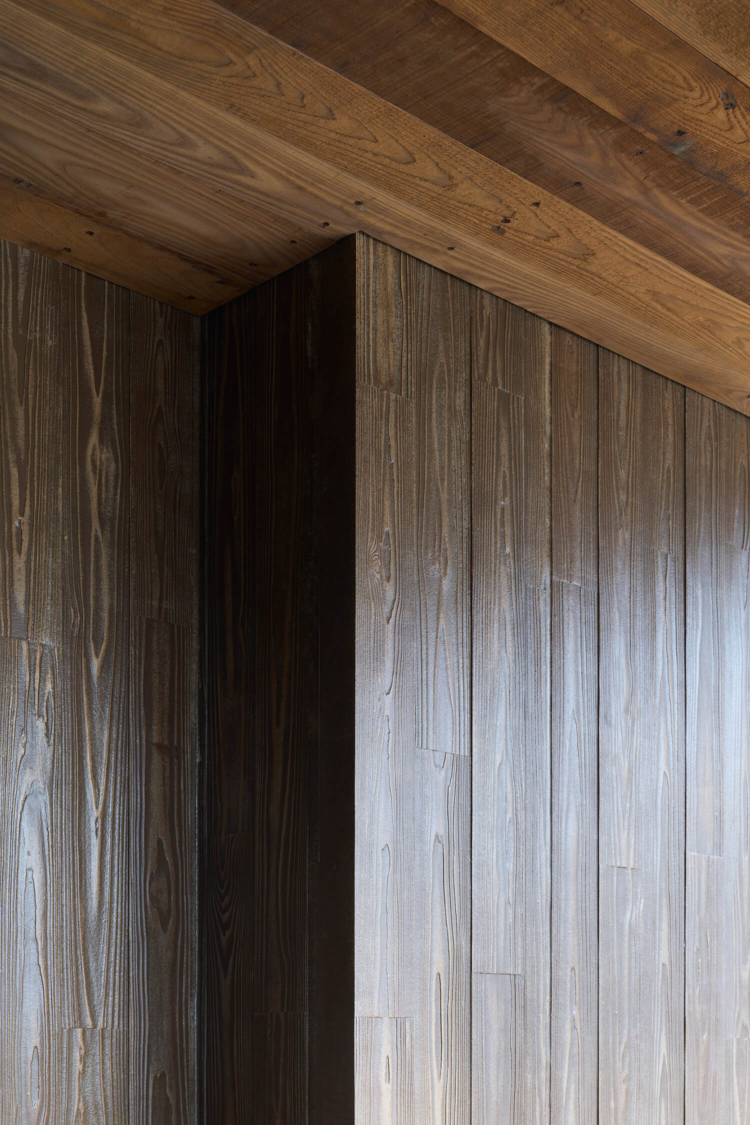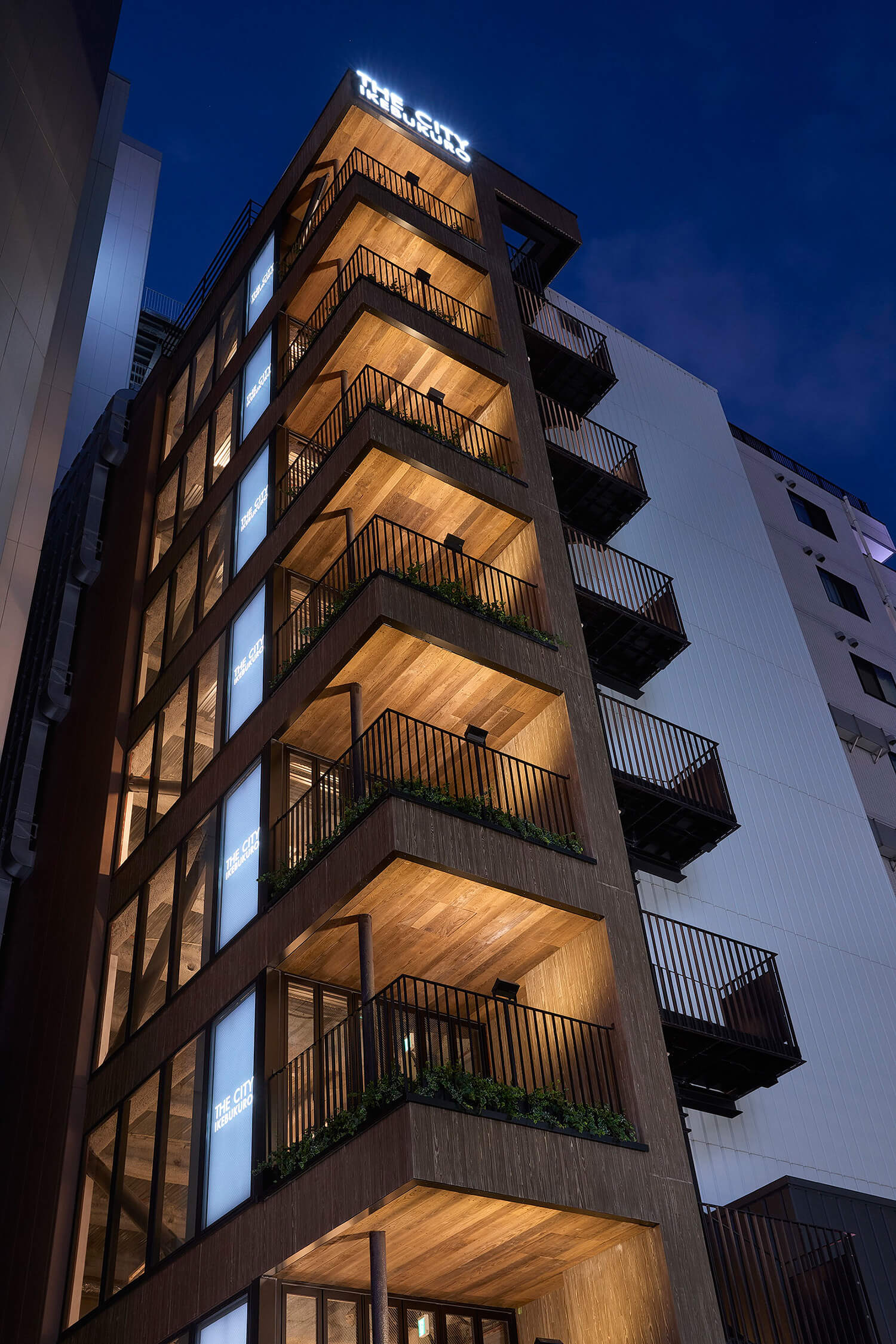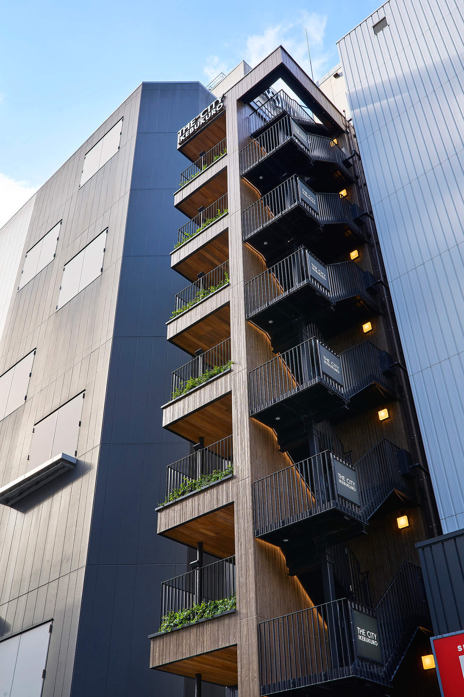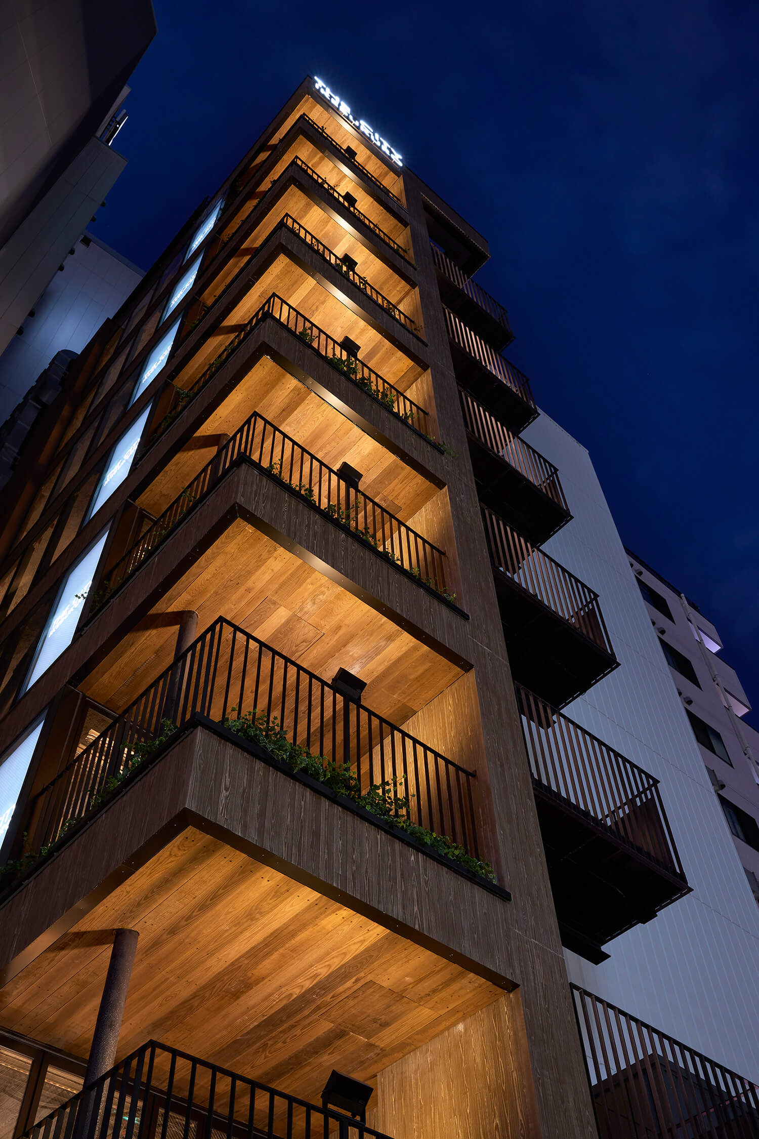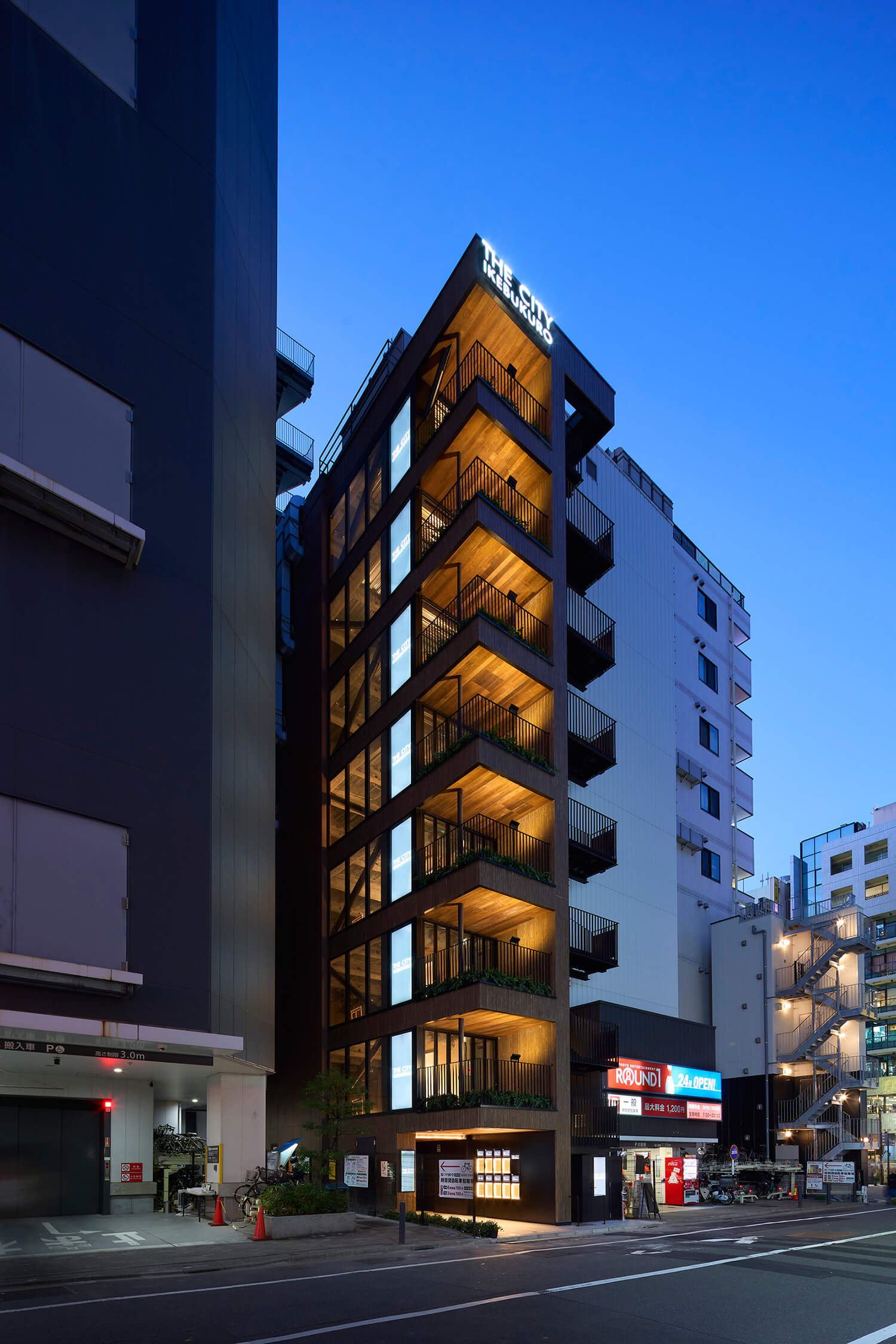 A commercial tenant building with eight floors above ground and one below on a site between the large Round One building and the Round One mechanical car park building, facing the side road connecting Sunshine 60 Street and Sunshine Street leading from the Ikebukuro East Exit to Sunshine 60. The narrow site with a frontage of 6.8m and a depth of 16m would normally limit the appeal of the facade to the front only, but the Round One buildings on either side are set back 3m to make room for a 10-storey building, allowing part of the sides to be shown as facade as well as the front. The first floor section is designed to use this protruding shape to invite people in. The more heavily trafficked Sunshine 60 Street side juts out to guide people to the common elevator hall and the entrance to the first-floor shops. On the opposite side of Sunshine Street, an outdoor evacuation staircase has been installed to guide people to the basement tenants. We have been actively proposing the construction of food and beverage tenant buildings that we have designed, such as the Terrace Building in Ebisu and the Kanda Terrace, even before the Corona Disaster, but since the Corona Disaster, more and more tenants have requested outdoor spaces, such as terraces. This building also has a 2.5 m square terrace on the side façade on the Sunshine 60 Street side. As there is an opening restriction of 2 m around the outdoor evacuation staircase, if the facade surface next to the staircase is pushed out to the front, almost all of the facade surface becomes a wall, but by setting the terrace back, the opening restriction is circumvented and a large opening is created. To allow the terrace to be used as a continuous interior/exterior space, folding sashes were installed that can be opened all the way. When approaching from Sunshine 60 Street, this stacked terrace looks like a large sleeve sign, which can appeal to the street with its liveliness. When approaching the building further, the façade ceases to be visible as an elevation, and the back of the eaves, which can be seen looking up, becomes the façade. The eaves of this terrace are finished in smoked ash and are further illuminated by lights installed above the balustrade, creating a three-dimensional representation of the building’s most visible eaves ceiling surface as another facade. The exterior face of the asrock is also wood-grained and painted in a wood tone to contrast its organic appearance against the monotone Round One building. By creating a three-dimensional vertical garden terrace, each restaurant has a space that can be more involved in the city and raises a dynamic public landscape where people can enjoy a meal in a city where people and traffic come and go.