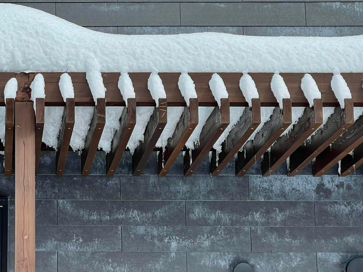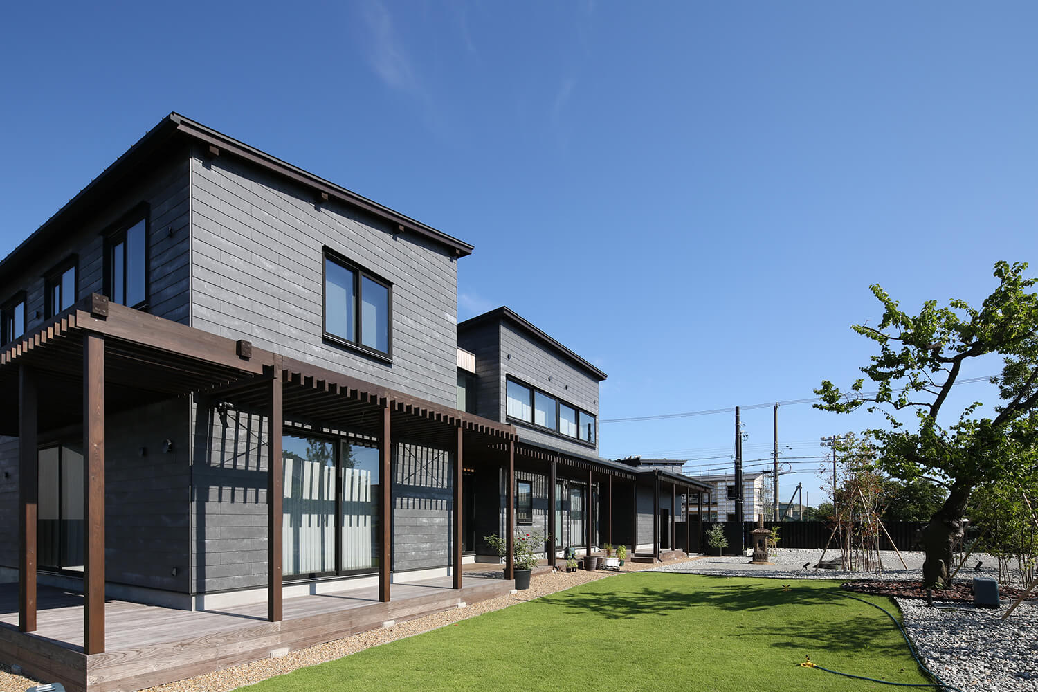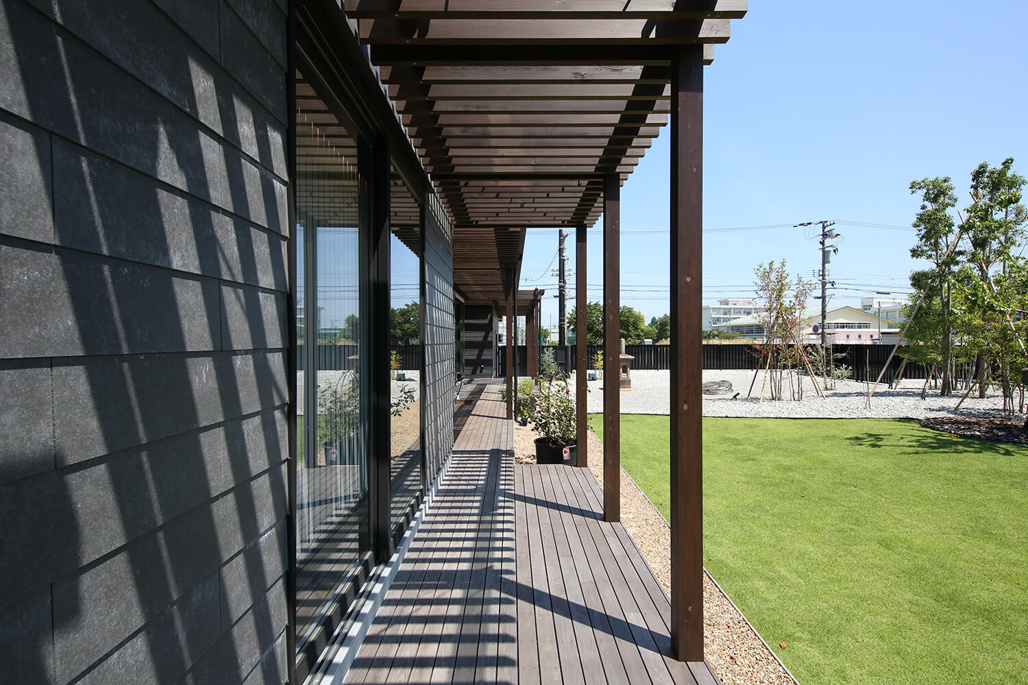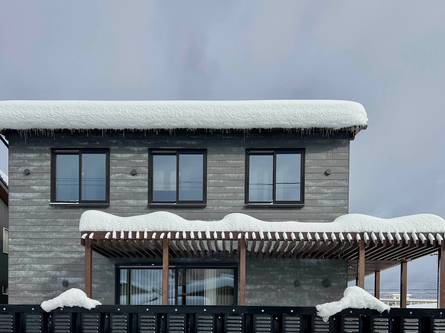 外壁は当初、左官仕上げを予定していたが、工事中に大きな地震が発生したこともあり、地震の動きに追随できるセメント系窯業板材を使用した下見張りに変更した。下見張りにしたことで、大きな外壁面が小さな要素で構成され、周囲への圧迫感を軽減している。玄関ホールやダイニングに面する壁には外壁材を内部にも連続させ、各棟に挟まれた外部空間のように見せることで、より開放的な印象を与えている。木製のパーゴラは、各棟の隙間にある開口部の東西の日射を調整し、積雪時に窓際に落雪させない役割も果たしており、三棟に面する外部空間を繋ぐ役割を担っている。