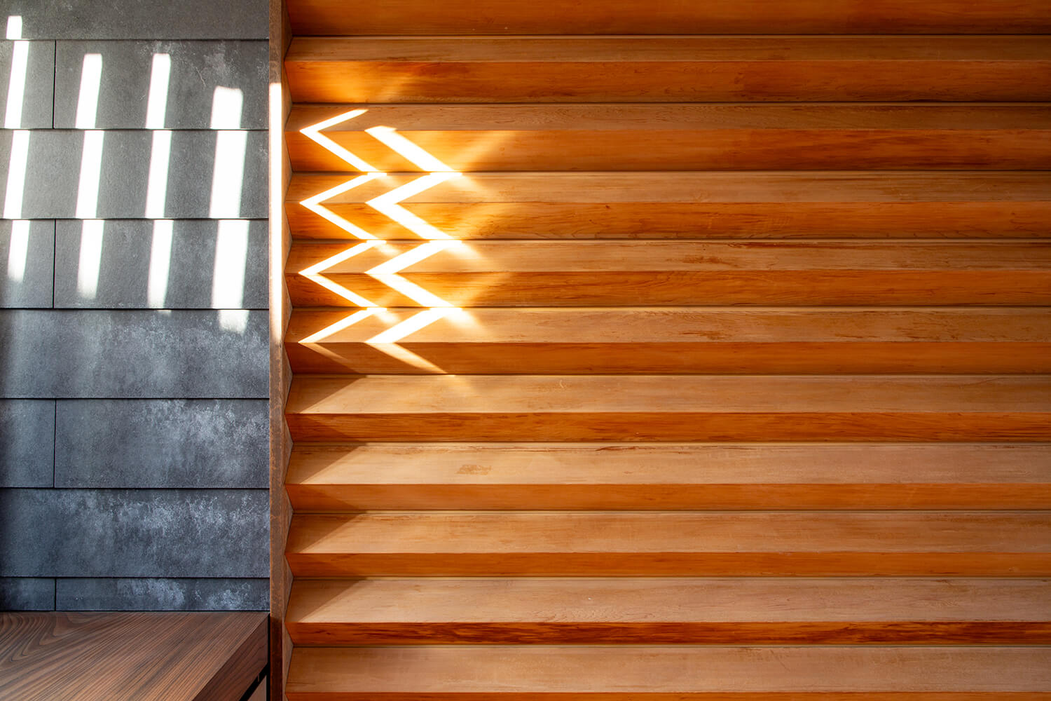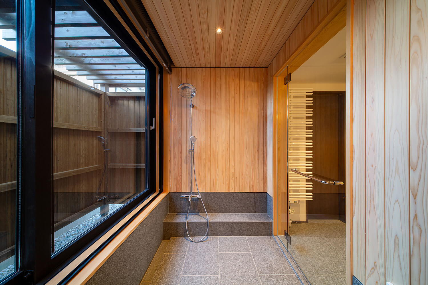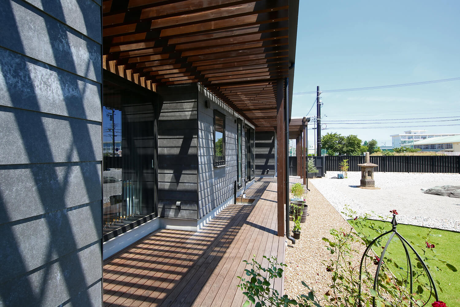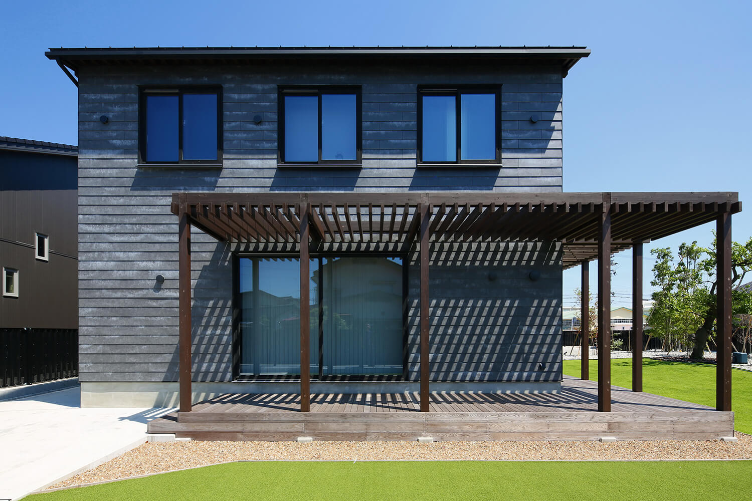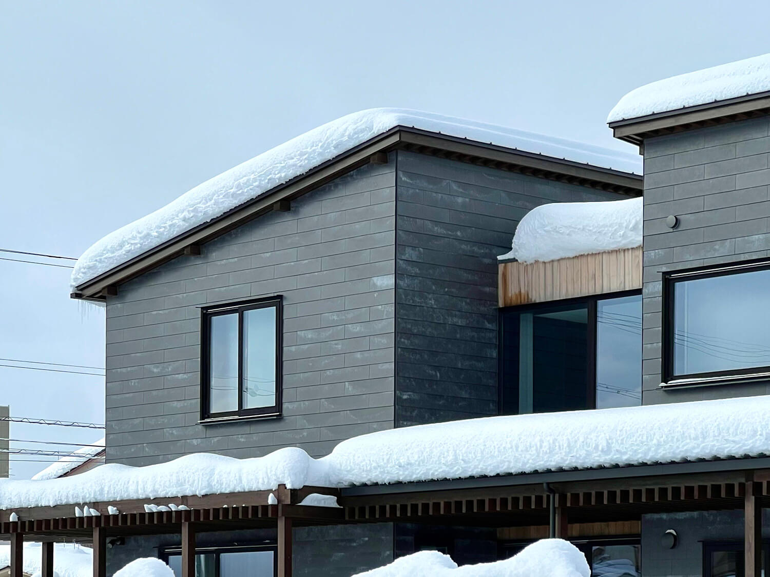外壁は当初、左官仕上げを予定していたが、工事中に大きな地震が発生したこともあり、地震の動きに追随できるセメント系窯業板材を使用した下見張りに変更した。下見張りにしたことで、大きな外壁面が小さな要素で構成され、周囲への圧迫感を軽減している。玄関ホールやダイニングに面する壁には外壁材を内部にも連続させ、各棟に挟まれた外部空間のように見せることで、より開放的な印象を与えている。木製のパーゴラは、各棟の隙間にある開口部の東西の日射を調整し、積雪時に窓際に落雪させない役割も果たしており、三棟に面する外部空間を繋ぐ役割を担っている。