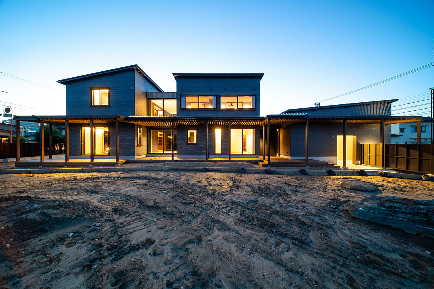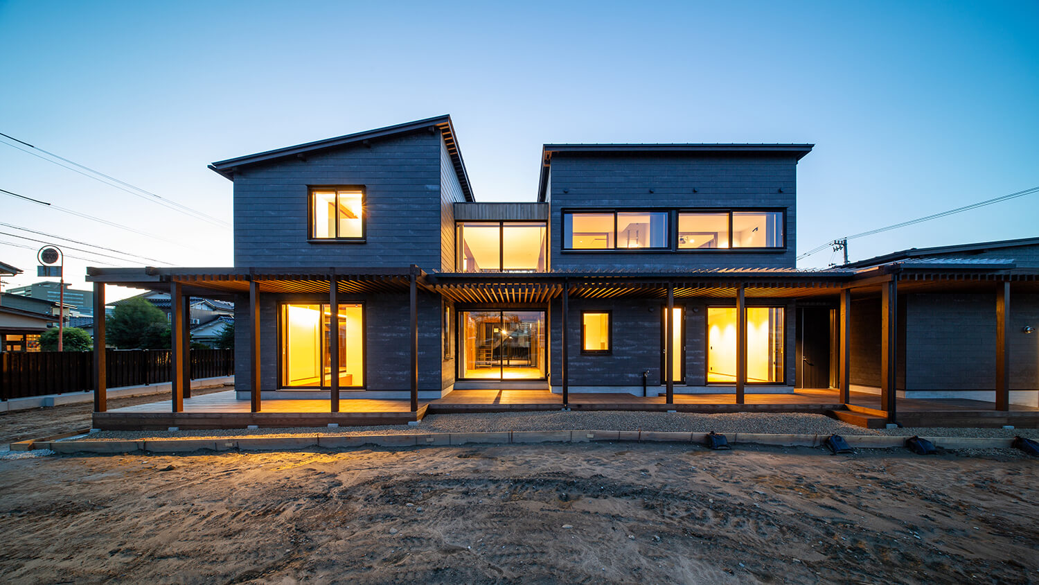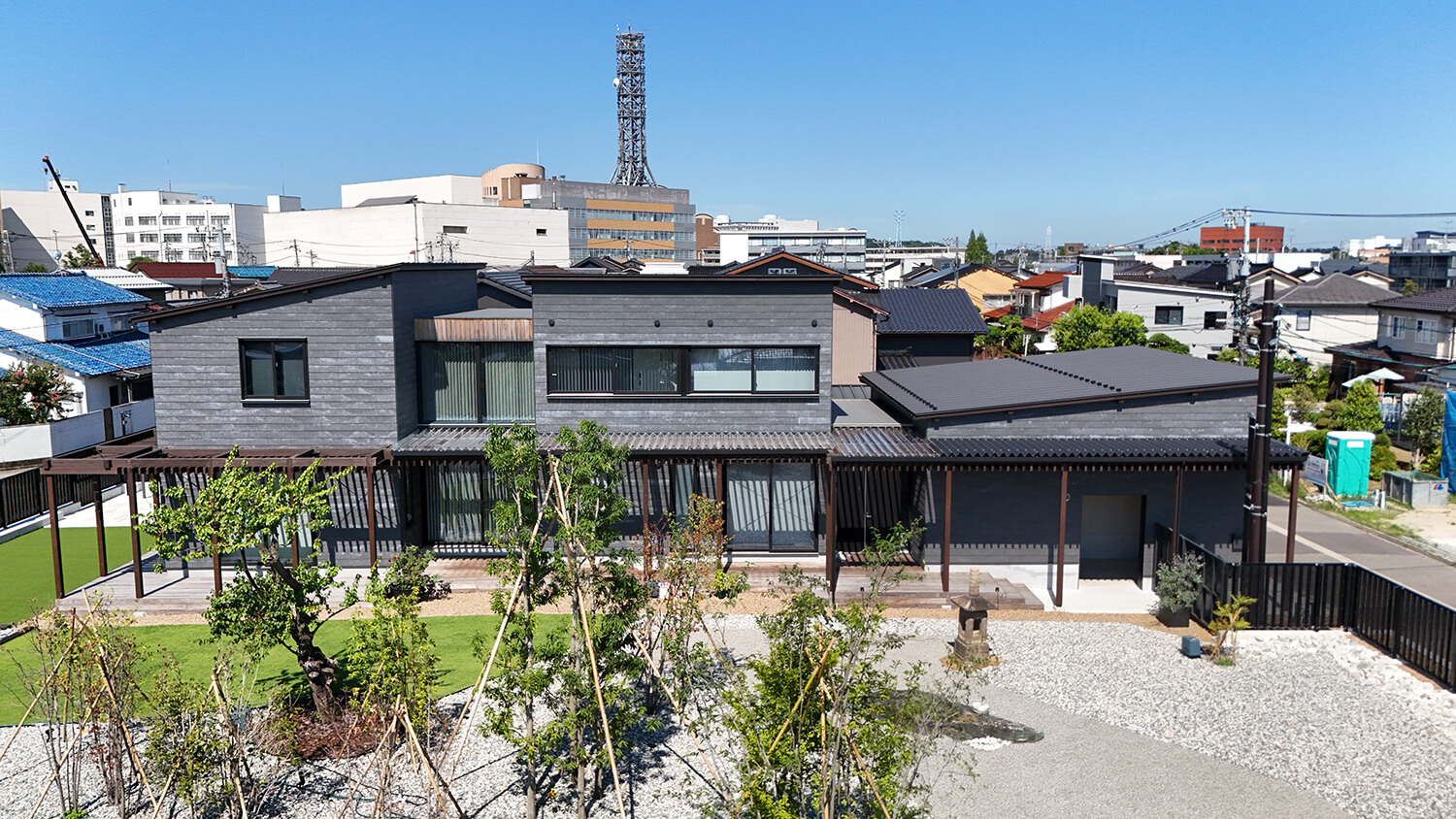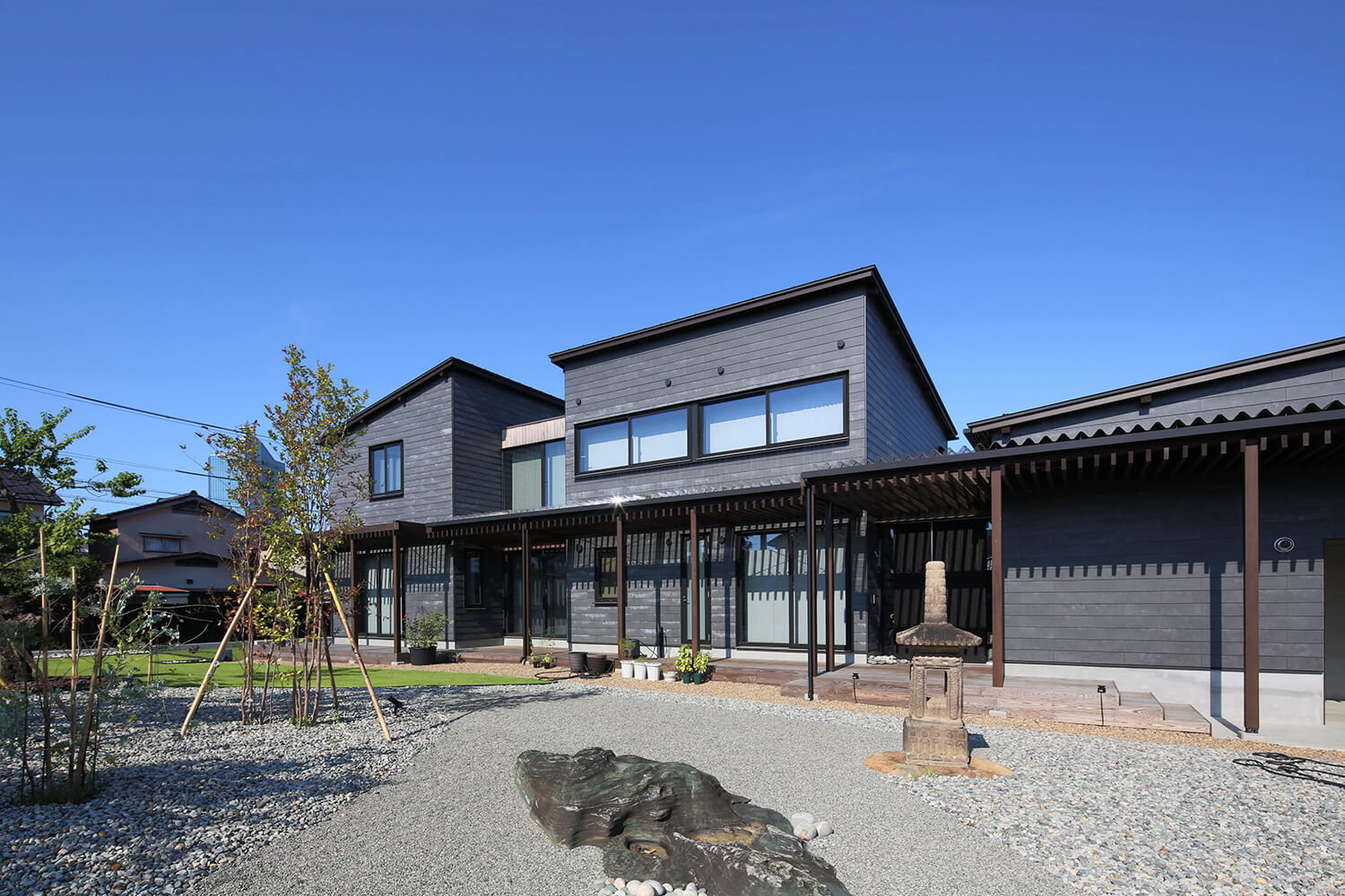 富山駅から徒歩10分ほどの住宅街に計画された、家族3人のための住宅。60年ほど前に施主の祖父が建てた日本庭園付きの大きな住宅は、施主の母親が引っ越してからは使用されていなかった。しかし、施主の家族で住むには部屋数が多すぎ、日本庭園も多くのメンテナンスが必要だったため、現在の家族構成に適した家に建て替えることとなった。敷地が広いことから、将来的に敷地を分割して子供の家族が家を建てたり、土地を売却する可能性も考慮し、敷地を東西に分け、両方が南面道路に接するように計画した。そして、売却しやすい東側の角地を庭として利用し、西側に家を建てる設計とした。