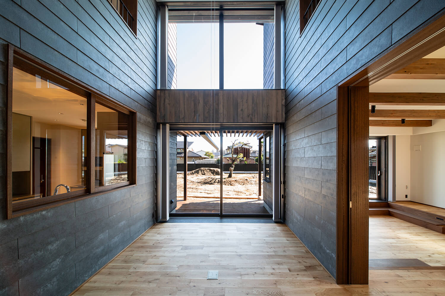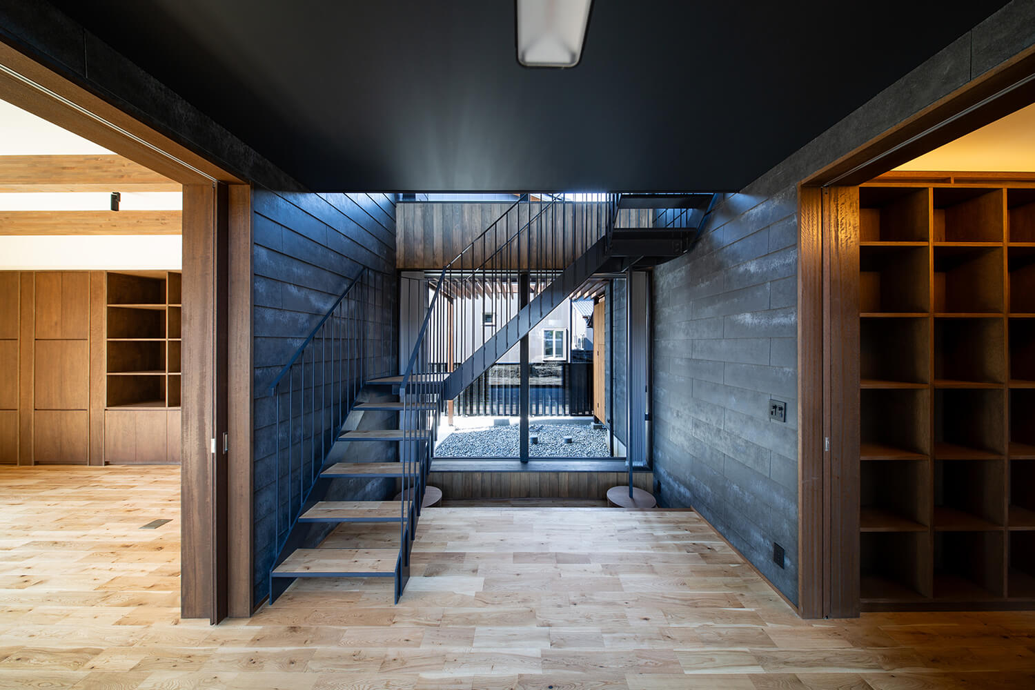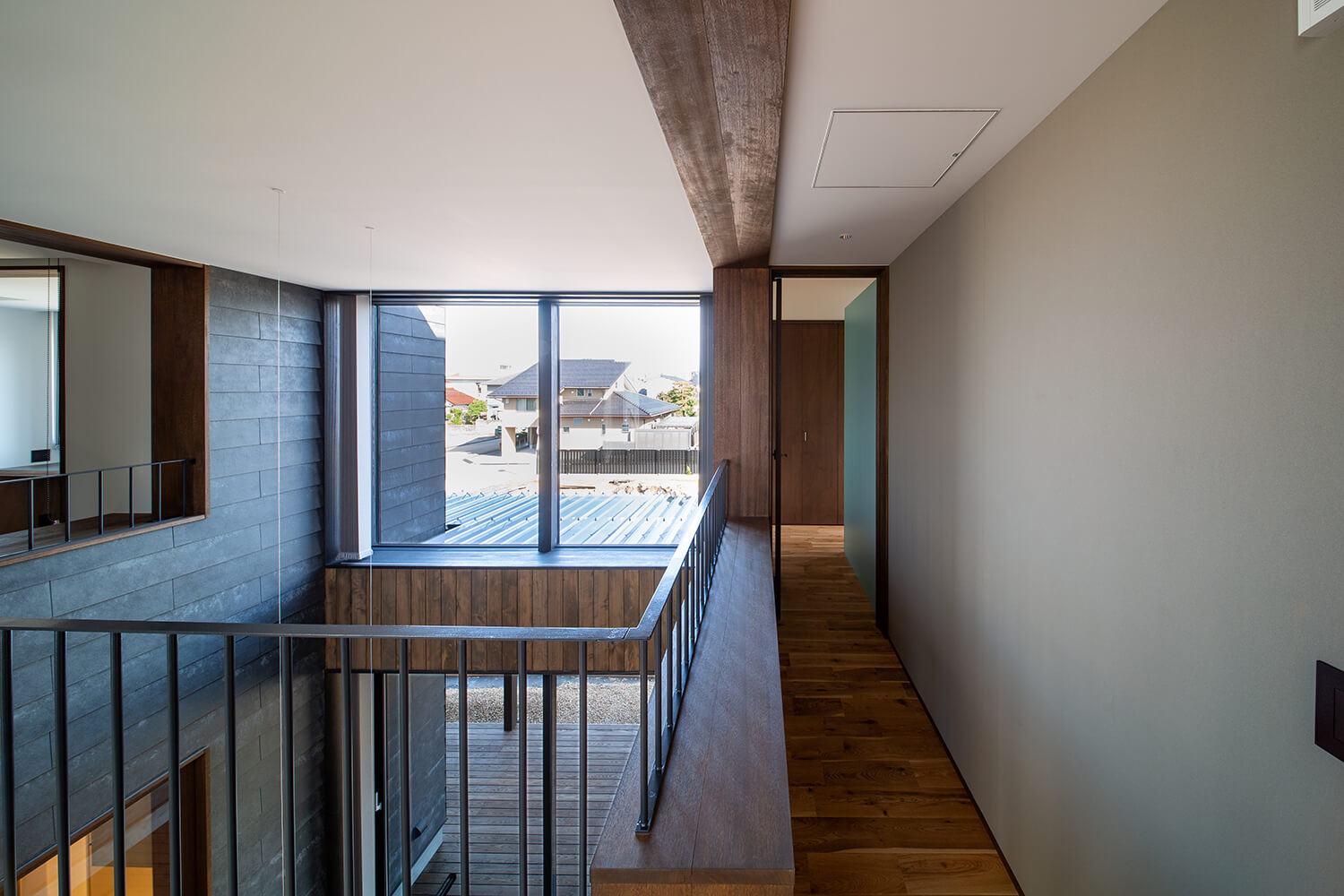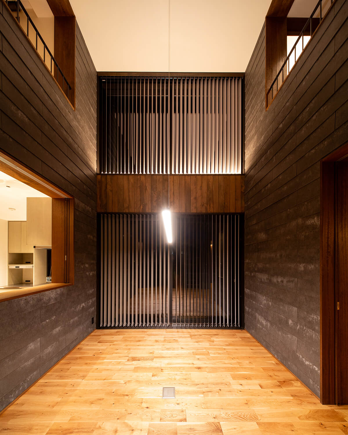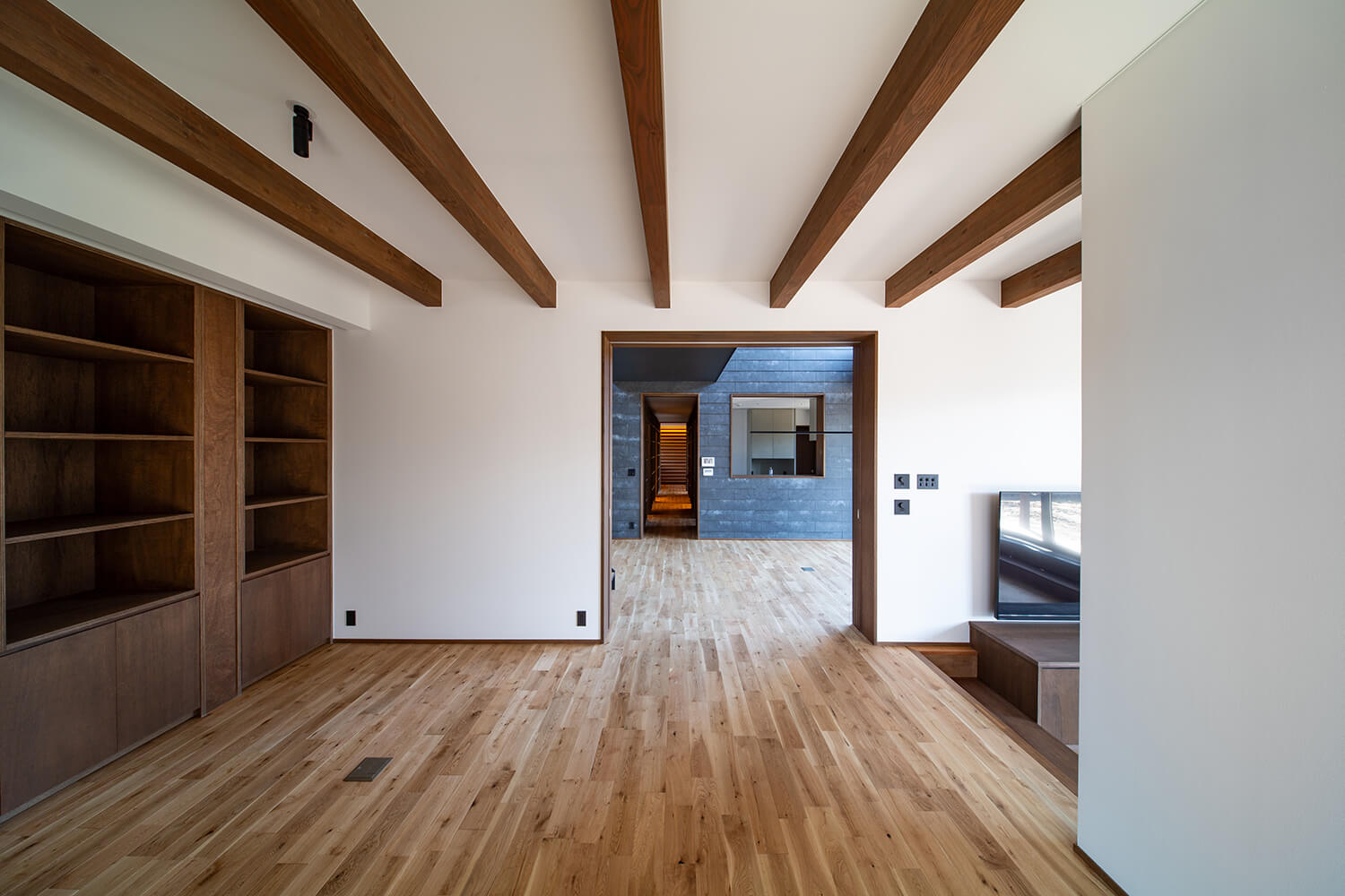 廊下を抜けると、サービス棟とリビング棟の間にある吹き抜けのダイニングルームに出る。ダイニングの西側には階段があり、階段前の大きな開口部はセットバックによって得られた坪庭に面している。階段下のスペースは床を下げ、ペットの寝床を設けた。東側にはウッドデッキが設けられており、現在は広い庭が広がっているが、将来的に隣地に家が建つ場合でも、東側にもプライバシーのある坪庭ができるように配慮されている。ダイニングに隣接するリビングは、耐震等級3を確保するために必要な耐力壁で2つの空間に分けられ、応接室と、リラックスしてテレビを楽しめるエリアに分かれている。吹き抜けに面する各棟の2階には家族の寝室やスタディルーム、音楽室などがあり、吹き抜けを通じて家族間の適度な距離を保ちながらも一体感を感じられるよう配慮している。