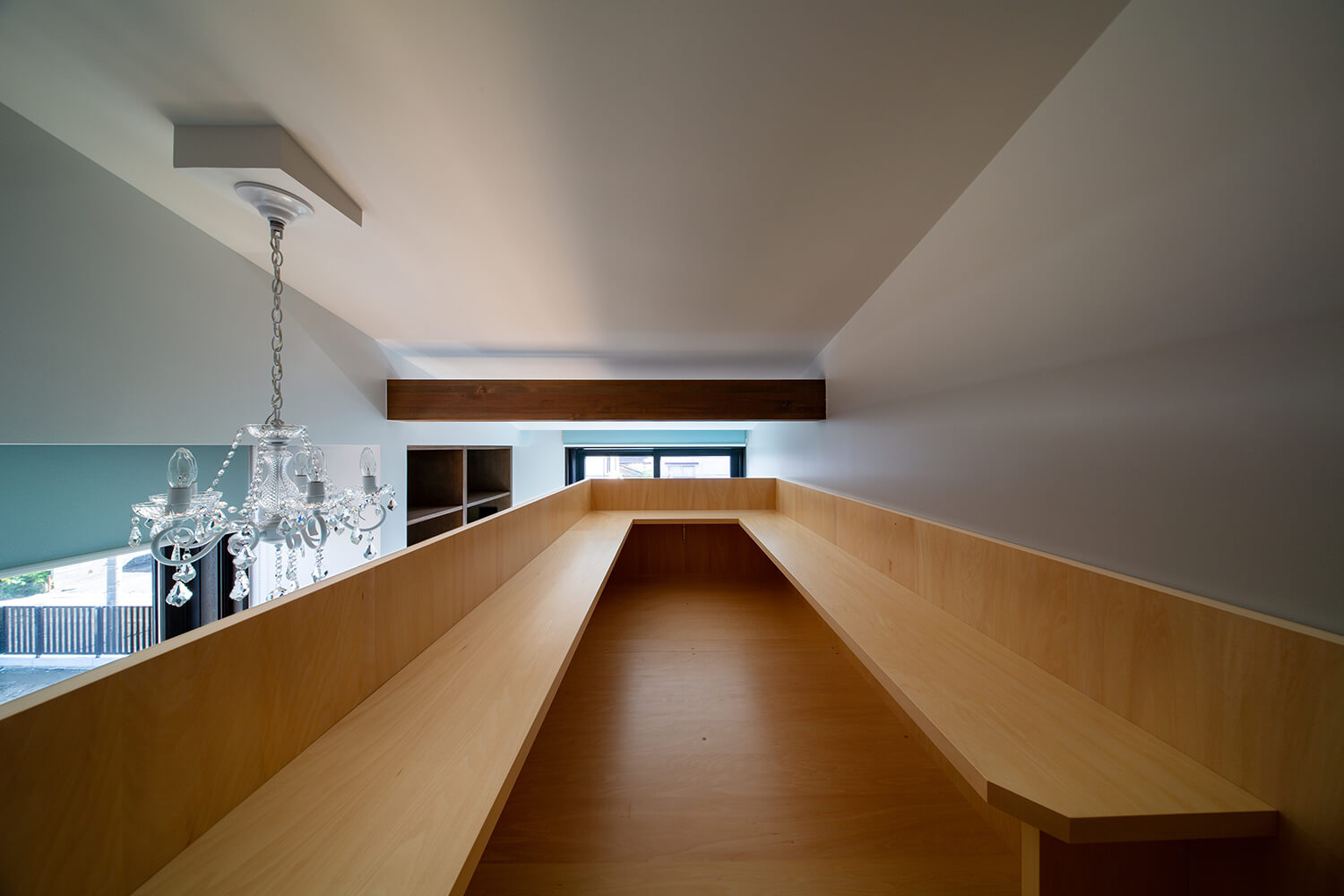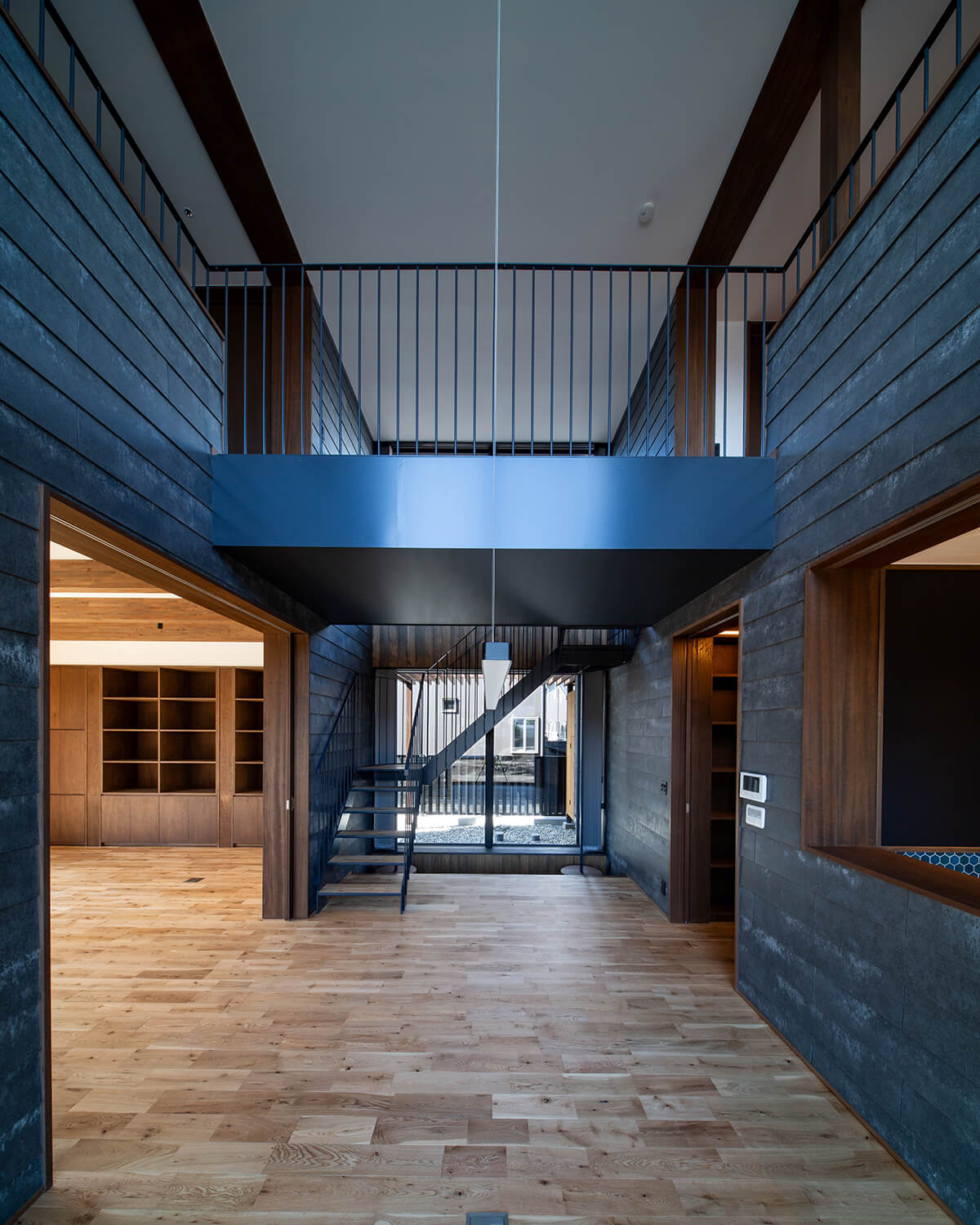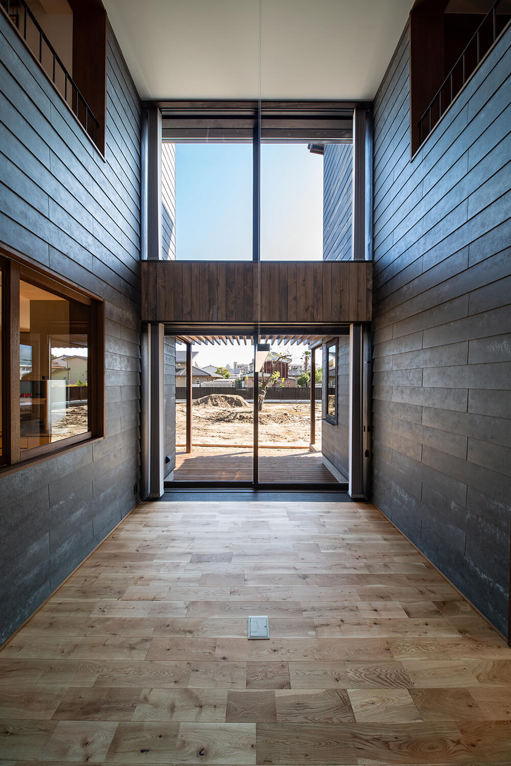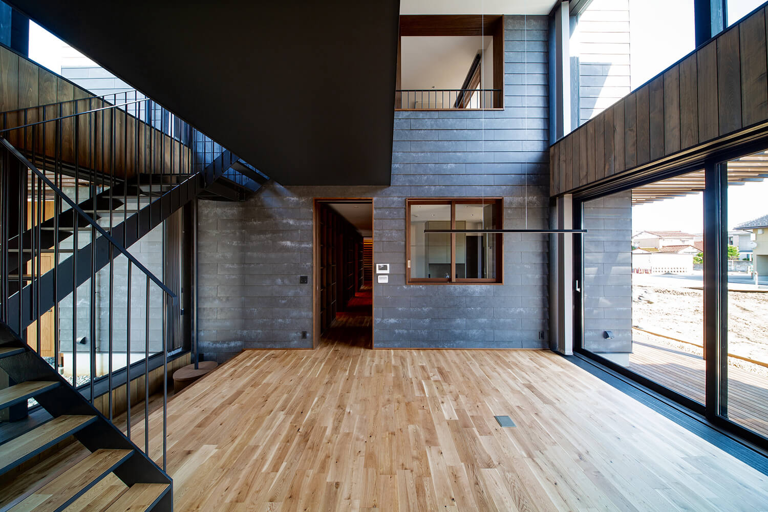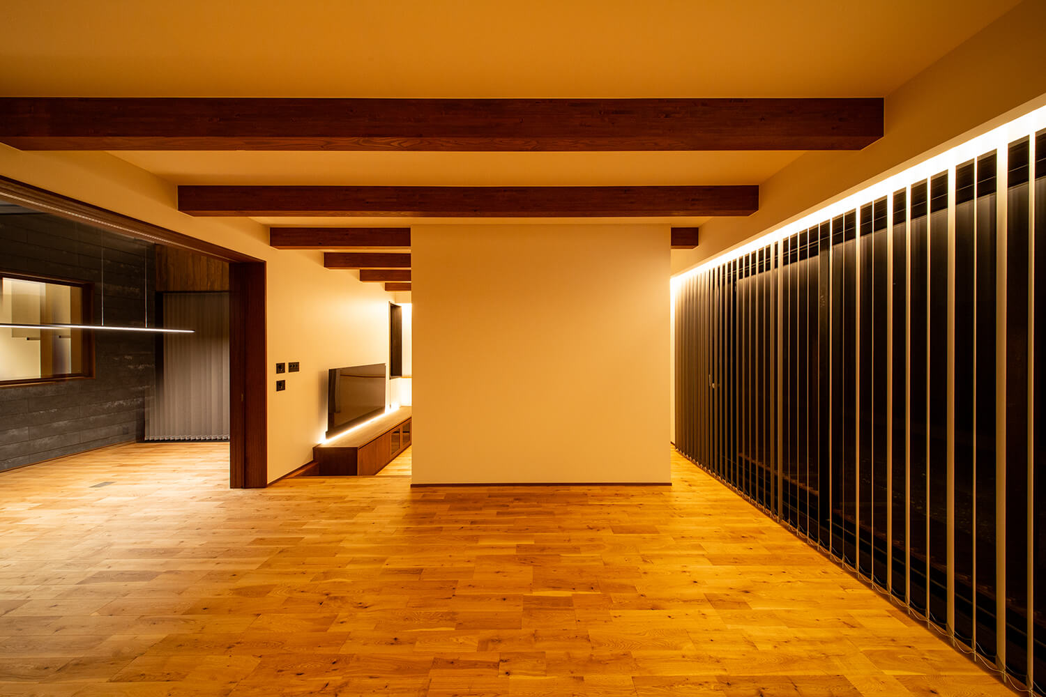 廊下を抜けると、サービス棟とリビング棟の間にある吹き抜けのダイニングルームに出る。ダイニングの西側には階段があり、階段前の大きな開口部はセットバックによって得られた坪庭に面している。階段下のスペースは床を下げ、ペットの寝床を設けた。東側にはウッドデッキが設けられており、現在は広い庭が広がっているが、将来的に隣地に家が建つ場合でも、東側にもプライバシーのある坪庭ができるように配慮されている。ダイニングに隣接するリビングは、耐震等級3を確保するために必要な耐力壁で2つの空間に分けられ、応接室と、リラックスしてテレビを楽しめるエリアに分かれている。吹き抜けに面する各棟の2階には家族の寝室やスタディルーム、音楽室などがあり、吹き抜けを通じて家族間の適度な距離を保ちながらも一体感を感じられるよう配慮している。