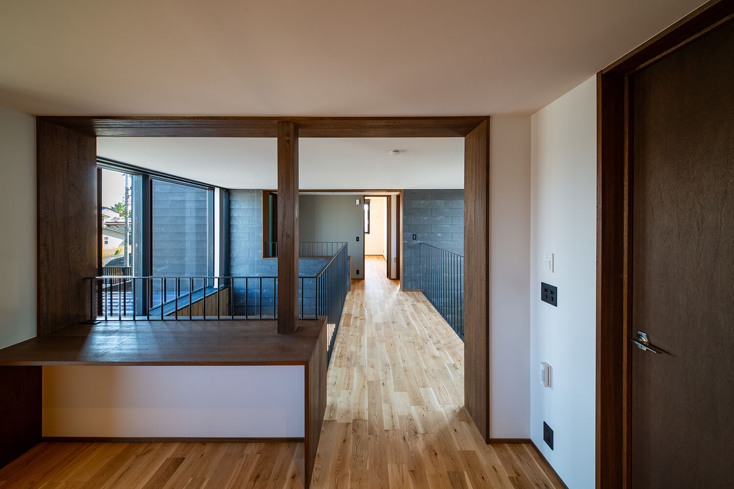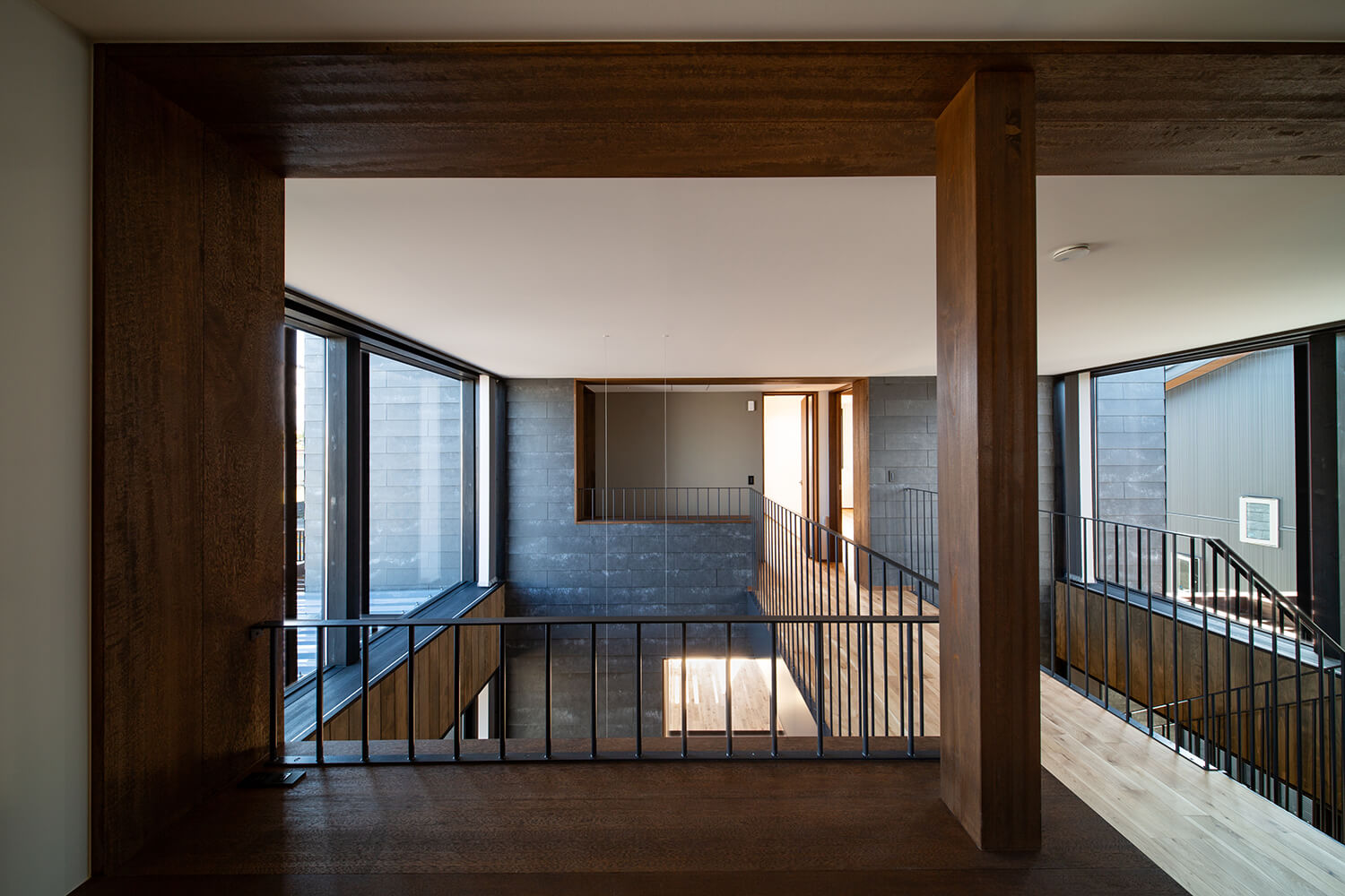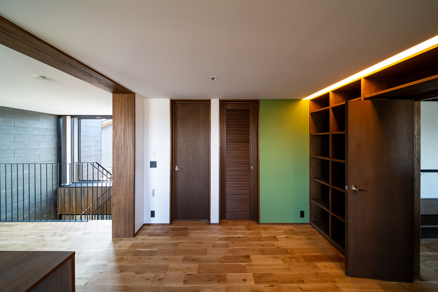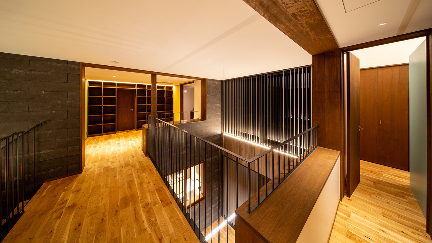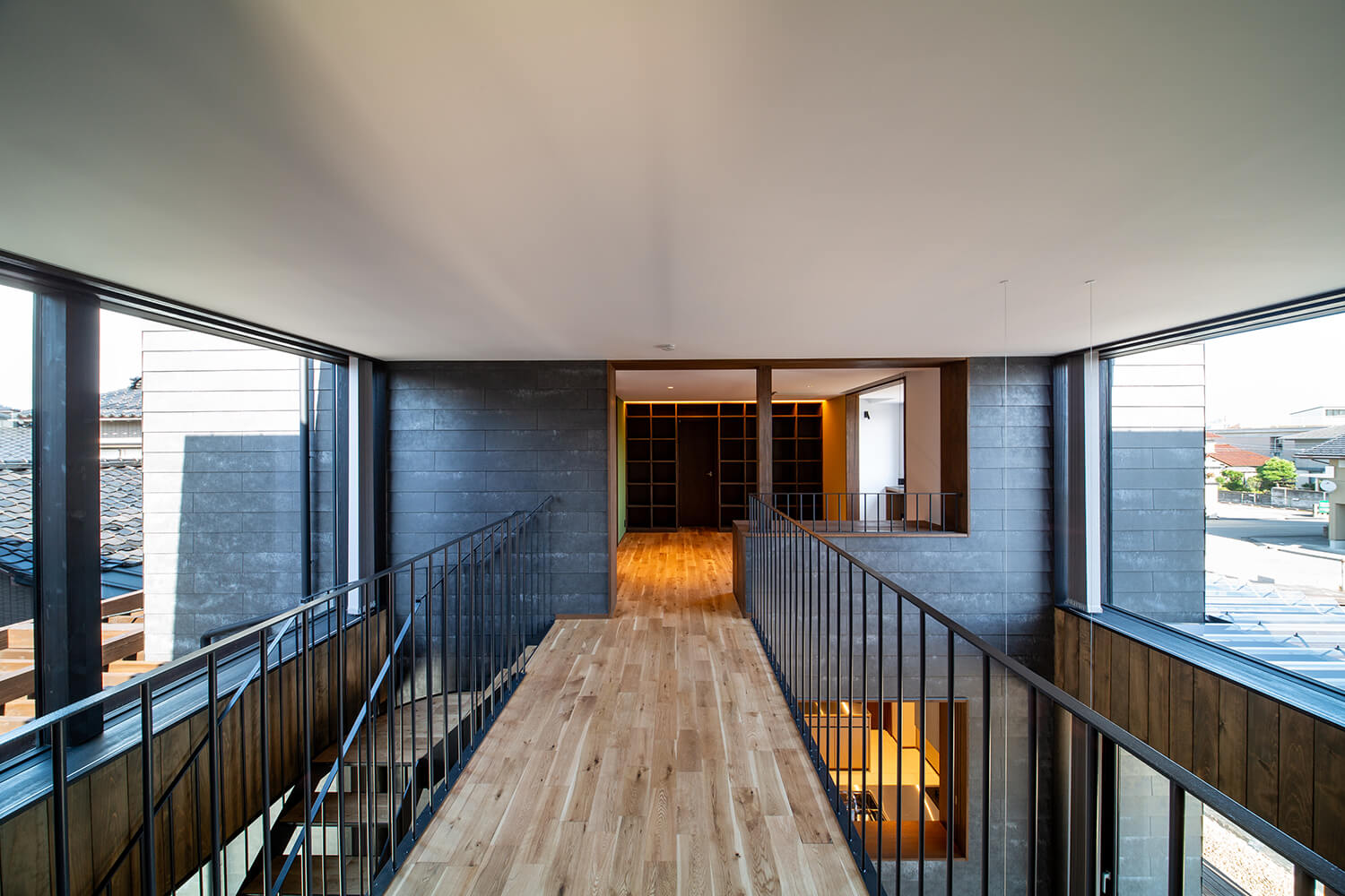 廊下を抜けると、サービス棟とリビング棟の間にある吹き抜けのダイニングルームに出る。ダイニングの西側には階段があり、階段前の大きな開口部はセットバックによって得られた坪庭に面している。階段下のスペースは床を下げ、ペットの寝床を設けた。東側にはウッドデッキが設けられており、現在は広い庭が広がっているが、将来的に隣地に家が建つ場合でも、東側にもプライバシーのある坪庭ができるように配慮されている。ダイニングに隣接するリビングは、耐震等級3を確保するために必要な耐力壁で2つの空間に分けられ、応接室と、リラックスしてテレビを楽しめるエリアに分かれている。吹き抜けに面する各棟の2階には家族の寝室やスタディルーム、音楽室などがあり、吹き抜けを通じて家族間の適度な距離を保ちながらも一体感を感じられるよう配慮している。
