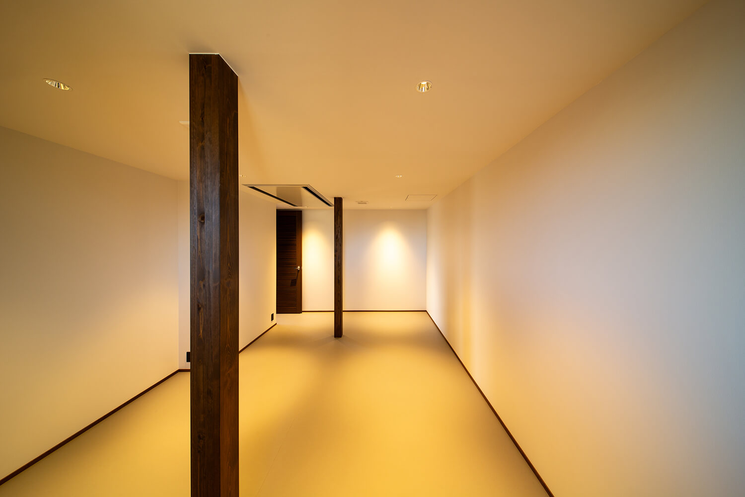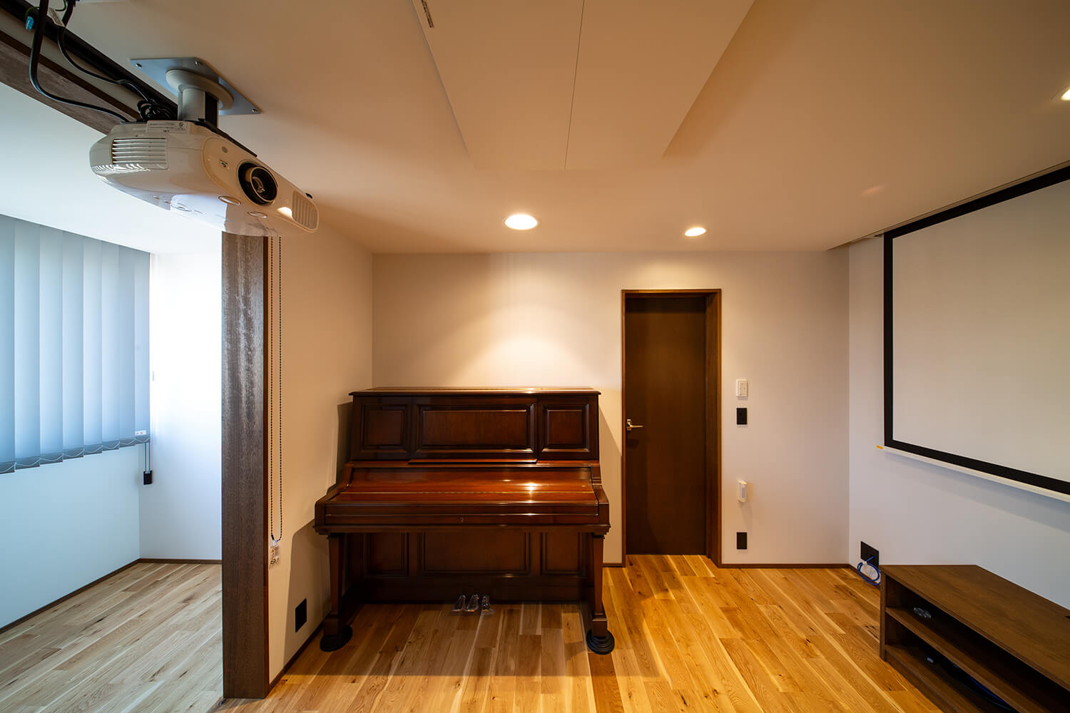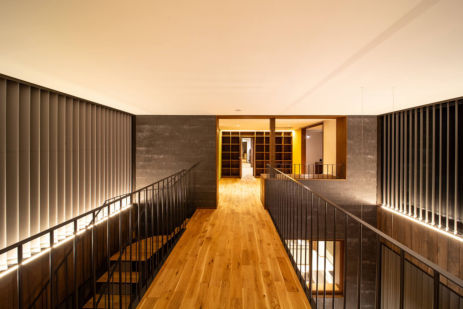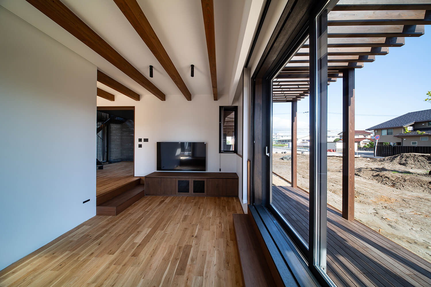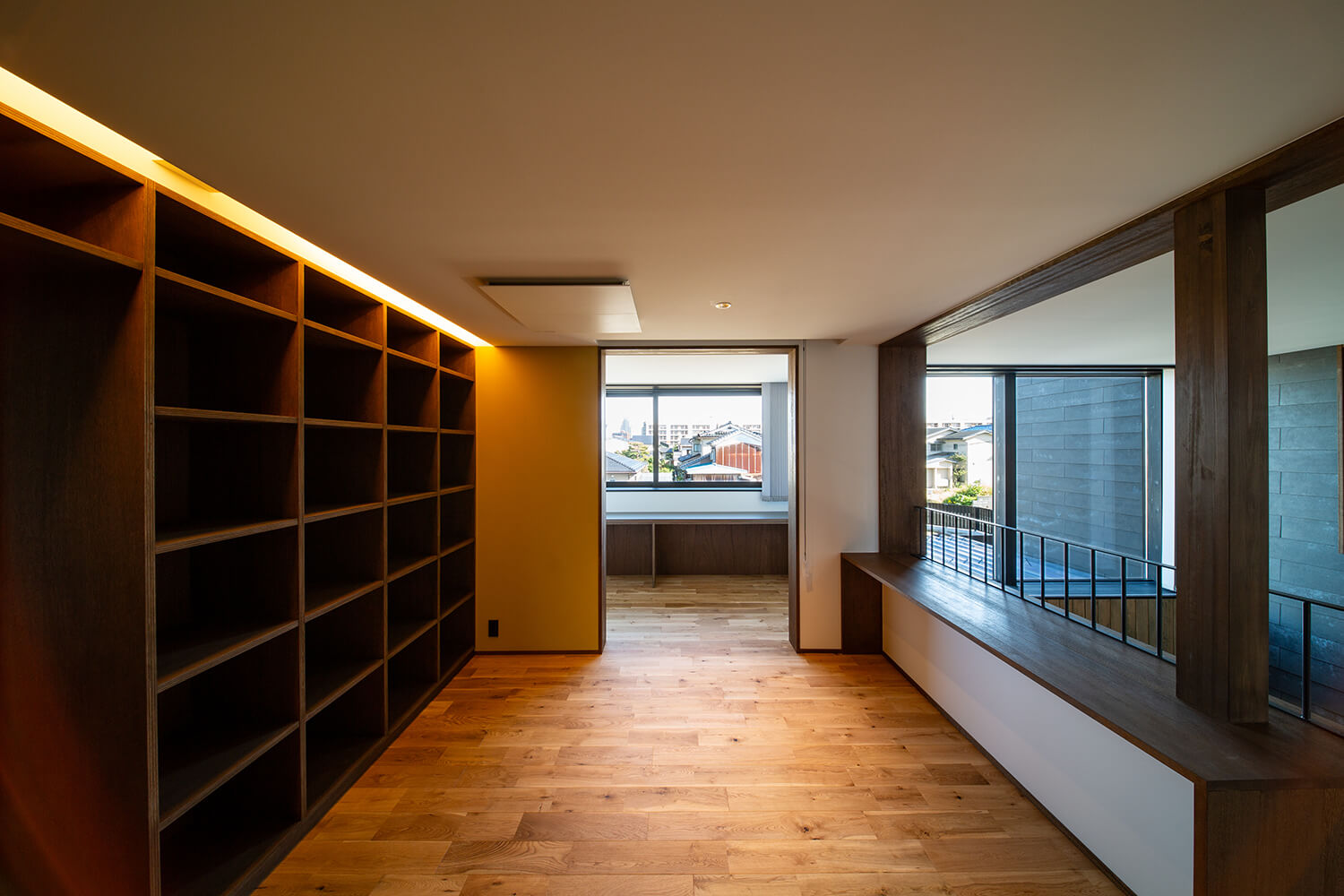 廊下を抜けると、サービス棟とリビング棟の間にある吹き抜けのダイニングルームに出る。ダイニングの西側には階段があり、階段前の大きな開口部はセットバックによって得られた坪庭に面している。階段下のスペースは床を下げ、ペットの寝床を設けた。東側にはウッドデッキが設けられており、現在は広い庭が広がっているが、将来的に隣地に家が建つ場合でも、東側にもプライバシーのある坪庭ができるように配慮されている。ダイニングに隣接するリビングは、耐震等級3を確保するために必要な耐力壁で2つの空間に分けられ、応接室と、リラックスしてテレビを楽しめるエリアに分かれている。吹き抜けに面する各棟の2階には家族の寝室やスタディルーム、音楽室などがあり、吹き抜けを通じて家族間の適度な距離を保ちながらも一体感を感じられるよう配慮している。