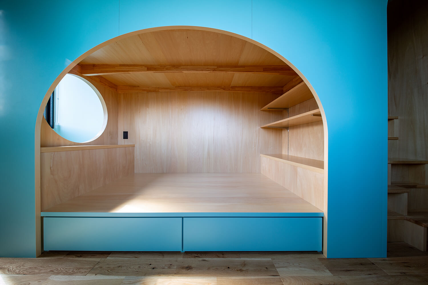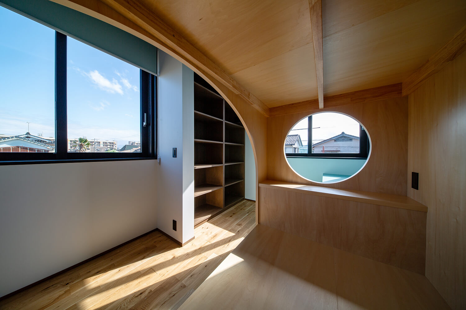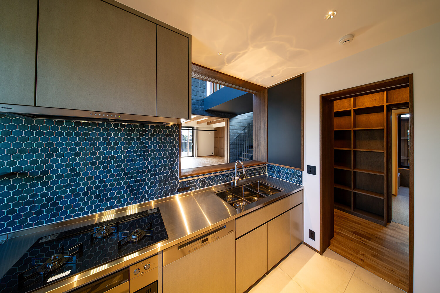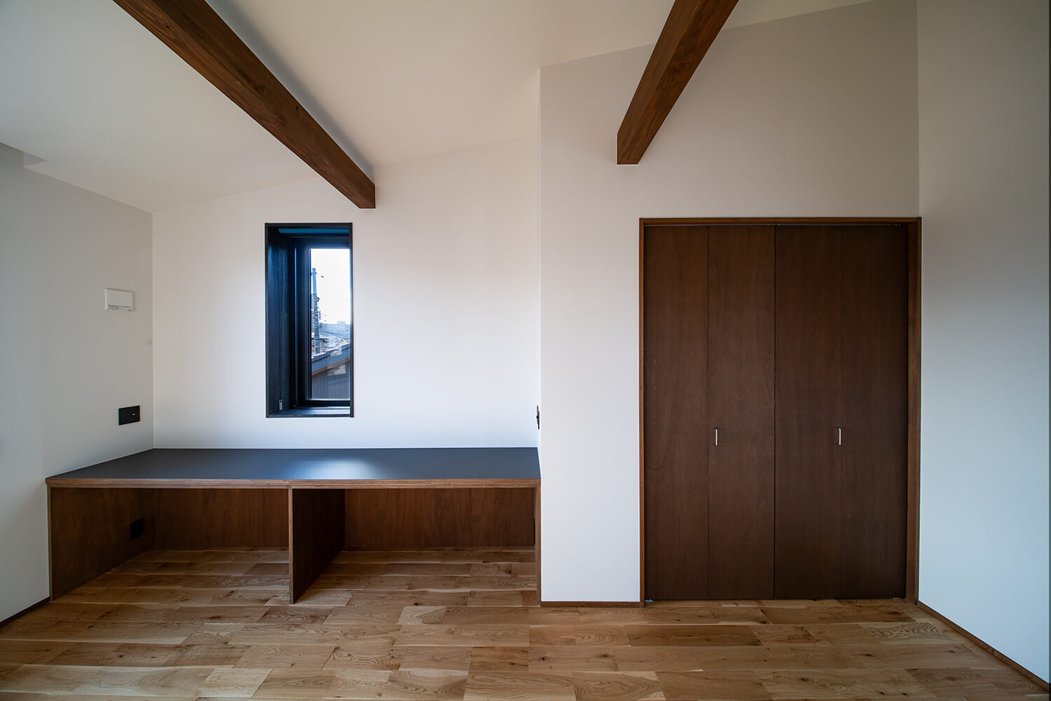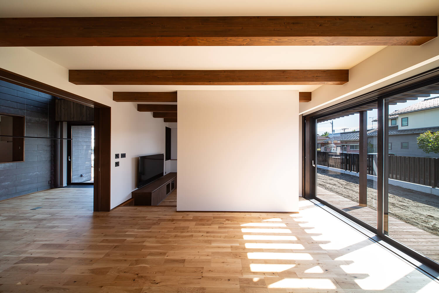 廊下を抜けると、サービス棟とリビング棟の間にある吹き抜けのダイニングルームに出る。ダイニングの西側には階段があり、階段前の大きな開口部はセットバックによって得られた坪庭に面している。階段下のスペースは床を下げ、ペットの寝床を設けた。東側にはウッドデッキが設けられており、現在は広い庭が広がっているが、将来的に隣地に家が建つ場合でも、東側にもプライバシーのある坪庭ができるように配慮されている。ダイニングに隣接するリビングは、耐震等級3を確保するために必要な耐力壁で2つの空間に分けられ、応接室と、リラックスしてテレビを楽しめるエリアに分かれている。吹き抜けに面する各棟の2階には家族の寝室やスタディルーム、音楽室などがあり、吹き抜けを通じて家族間の適度な距離を保ちながらも一体感を感じられるよう配慮している。