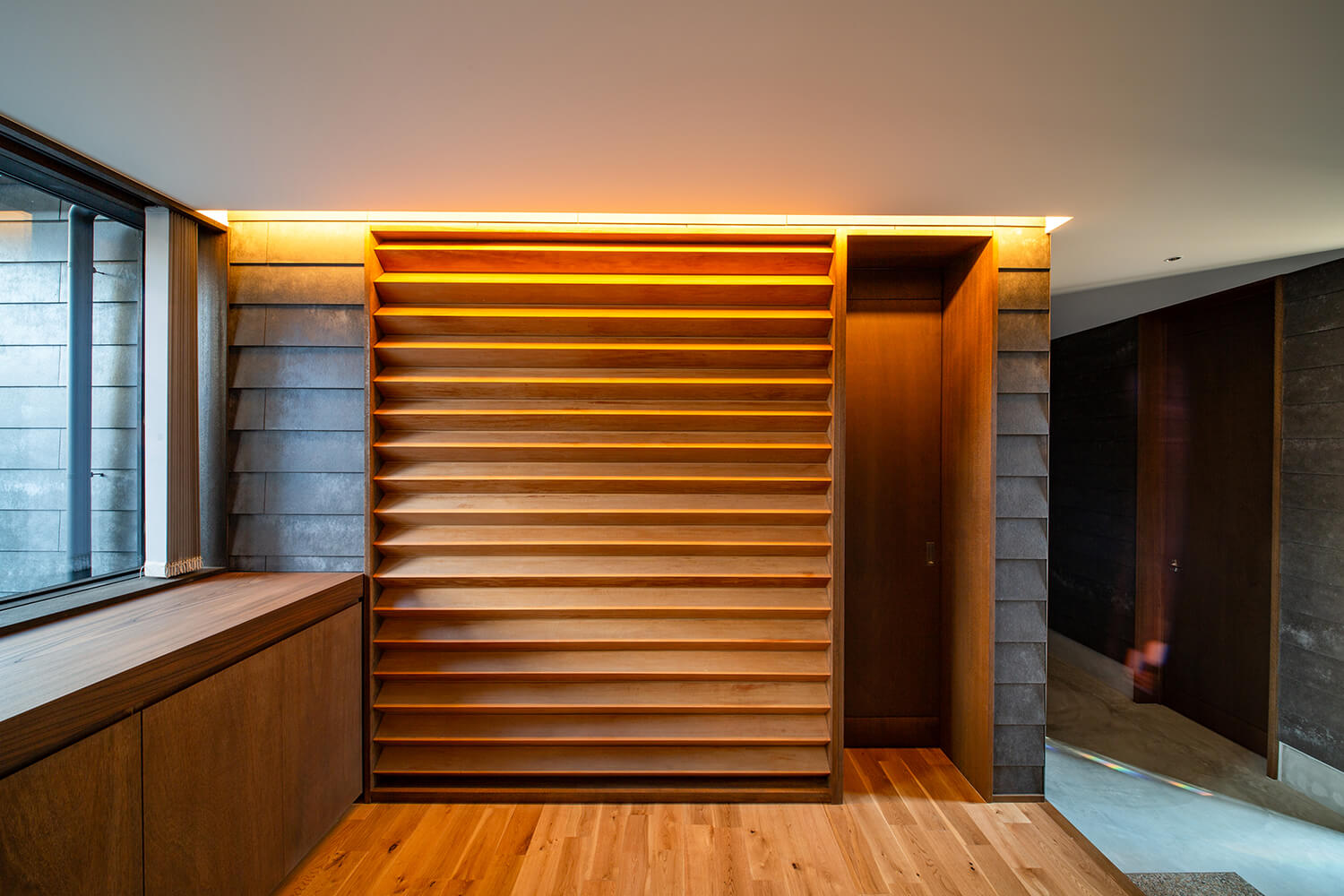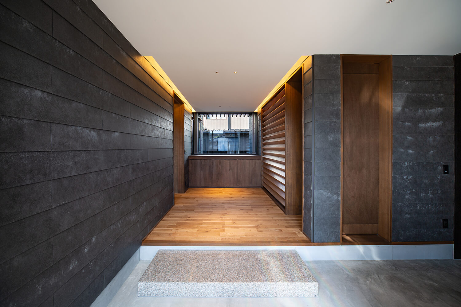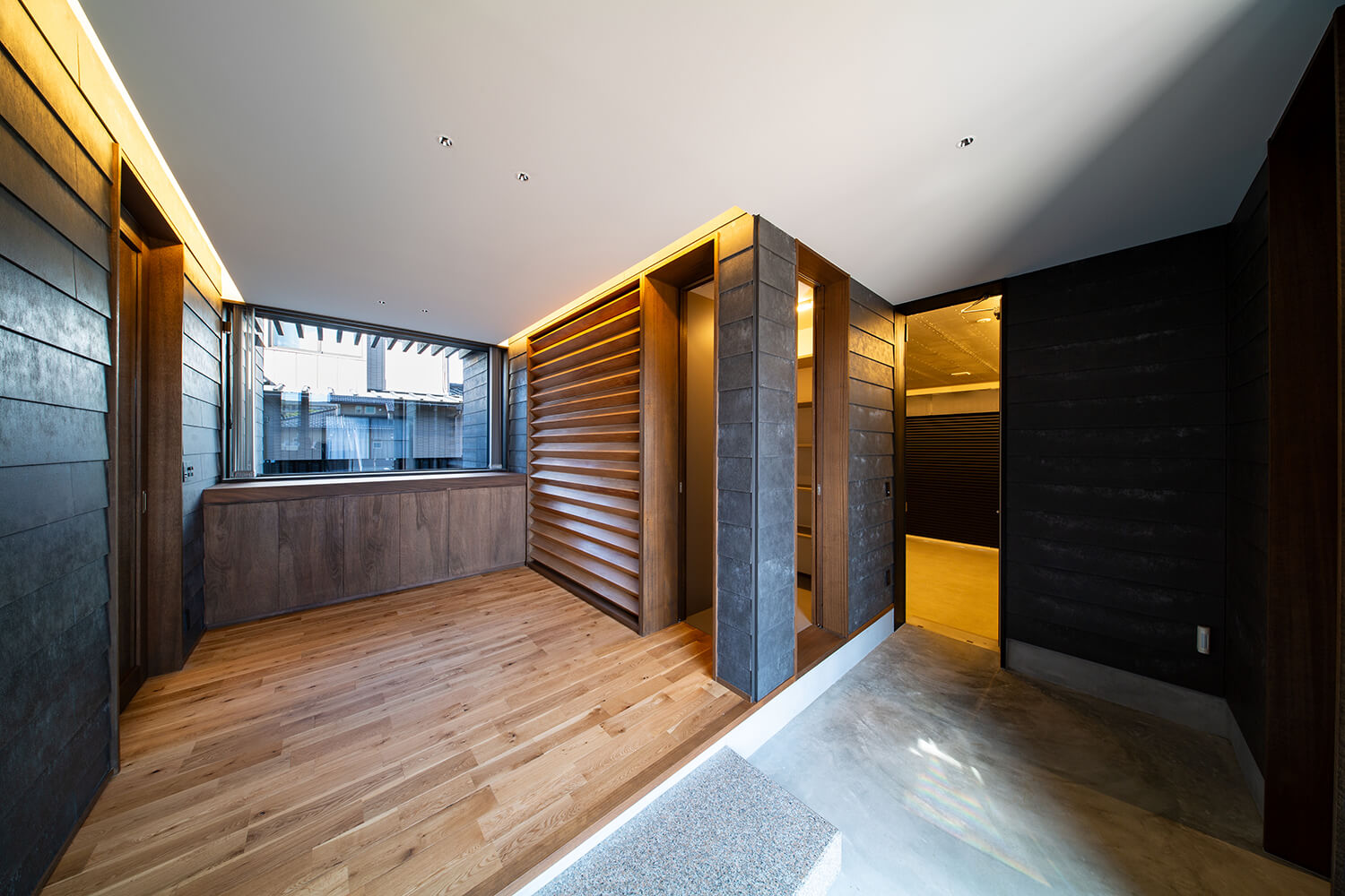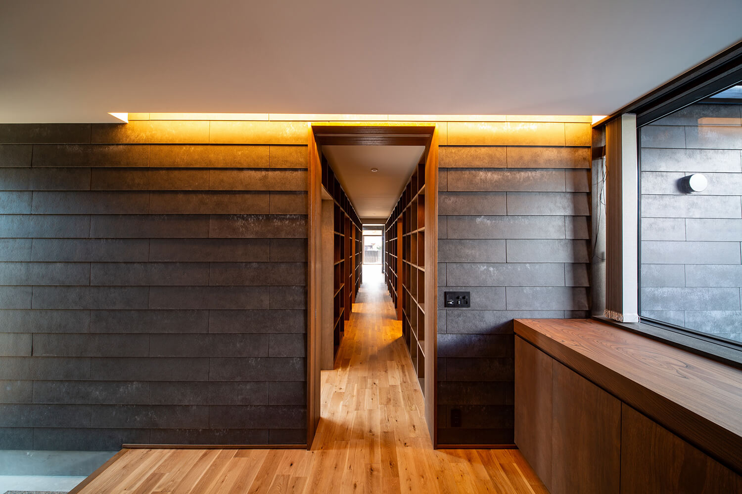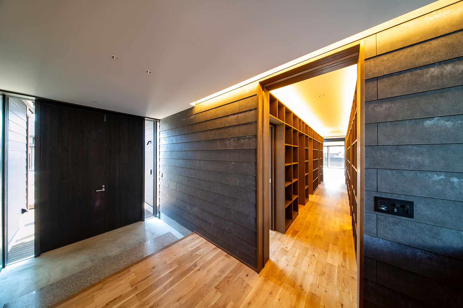 道路側のパーキング棟とサービス棟の間には坪庭を設けた玄関ホールがあり、駐車場や駐輪場、シューズクロークへのアクセスを良くしている。玄関ホールには祖父宅にあった校倉の木壁や土間の石、窓際に無垢材のカウンタートップを再利用している。玄関ホールは水回り棟を貫通する廊下に繋がっており、壁一面に設置された本棚が蔵書を収めている。廊下の左右にはファミリークローゼット、ランドリー、洗面、風呂、トイレ、ゲストルーム、パントリー、キッチンが並び、機能的に繋がっている。