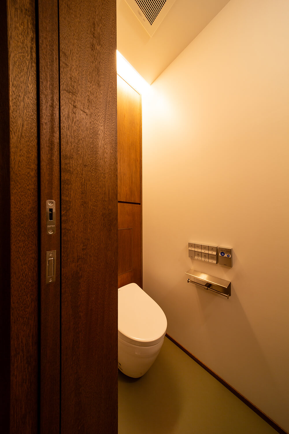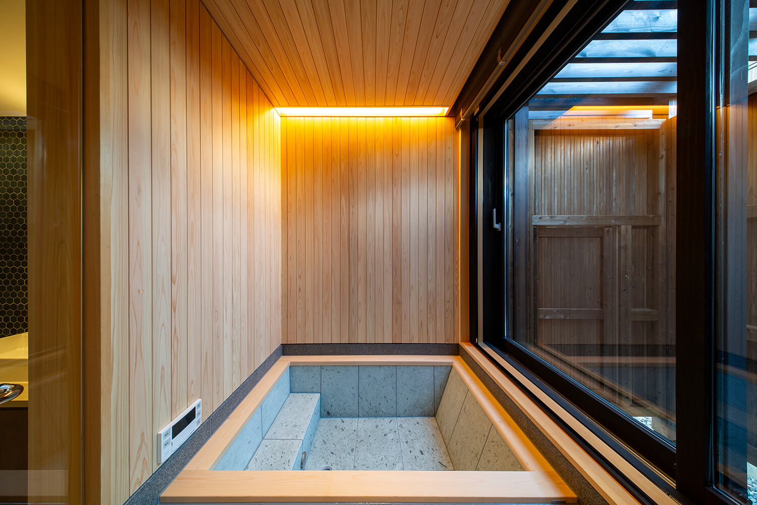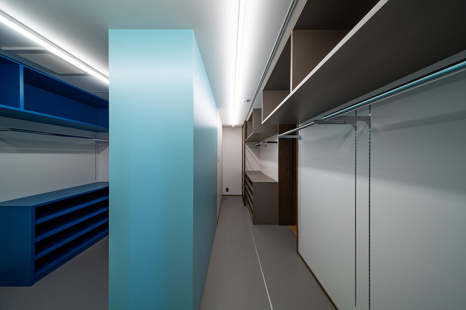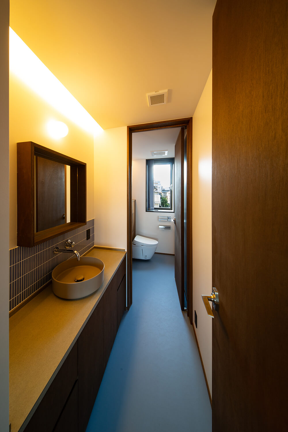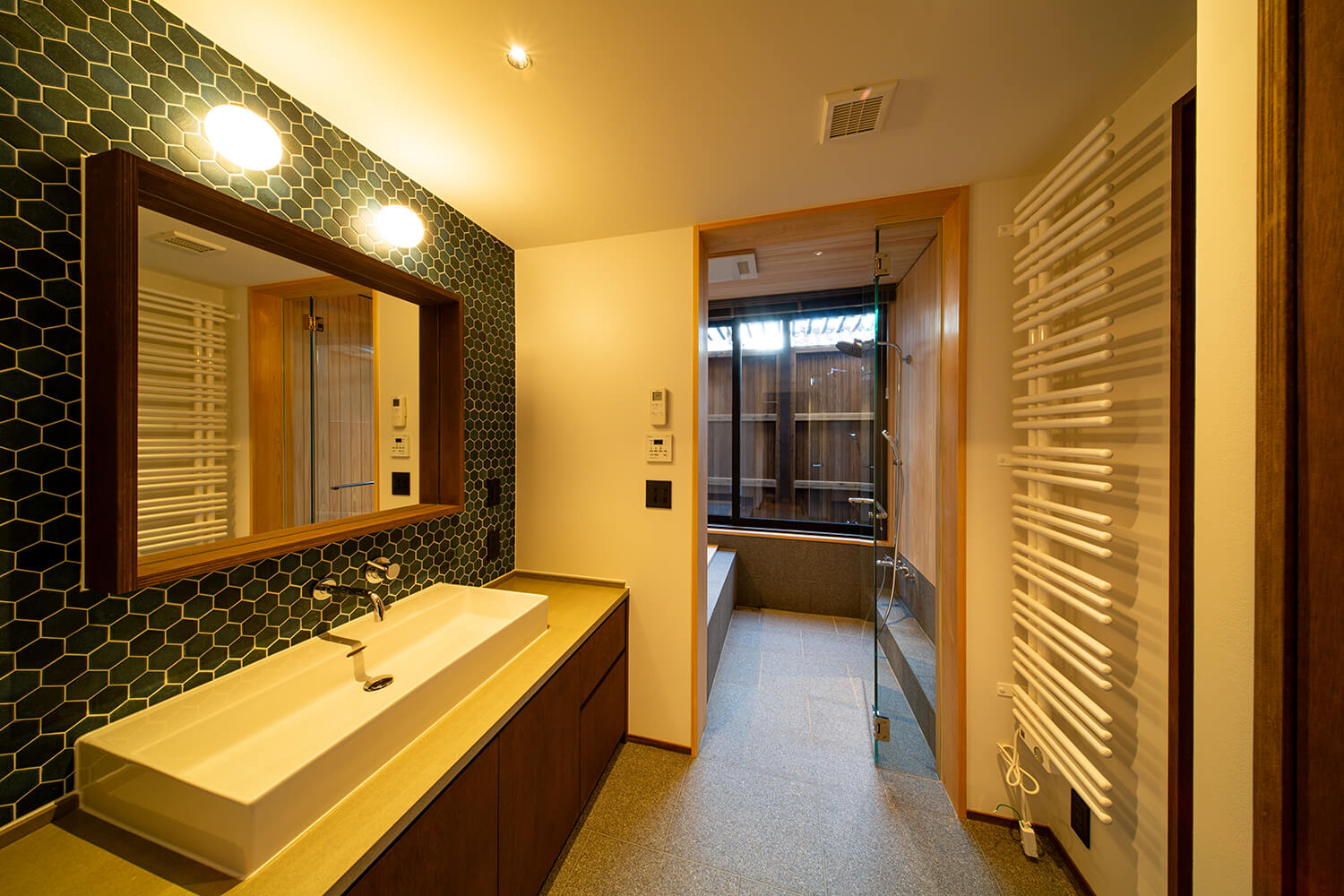 道路側のパーキング棟とサービス棟の間には坪庭を設けた玄関ホールがあり、駐車場や駐輪場、シューズクロークへのアクセスを良くしている。玄関ホールには祖父宅にあった校倉の木壁や土間の石、窓際に無垢材のカウンタートップを再利用している。玄関ホールは水回り棟を貫通する廊下に繋がっており、壁一面に設置された本棚が蔵書を収めている。廊下の左右にはファミリークローゼット、ランドリー、洗面、風呂、トイレ、ゲストルーム、パントリー、キッチンが並び、機能的に繋がっている。
