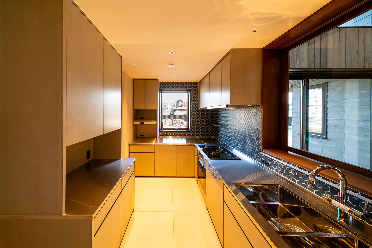 この住宅では、地球環境への負荷を考慮し、サステナブルで快適な空間を目指した。構造は木軸にグラスウールを充填し、その外にスタイロフォームを施した負荷断熱を行い、ペアガラスの木製サッシを使用して断熱等級6(Ua値0.43W/m²・K)を達成している。空調には全空気式床ふく射冷暖房システムを採用し、エネルギー効率の高いヒートポンプから供給される冷暖気を床下に回し、床に埋め込まれた金属輻射パネルによって室内の温度差を抑えた快適で穏やかな空調環境を実現している。