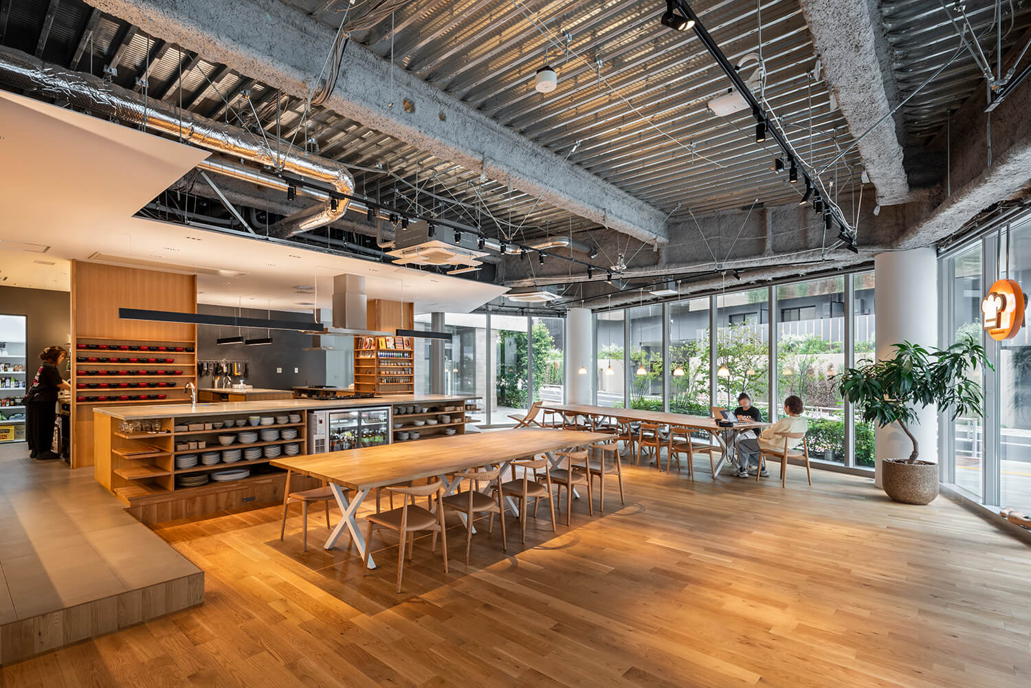 1階は、本オフィスの象徴的な空間であるメインキッチンとダイニングを中心に構成されている。道路に面したガラスファサードを介して、内部の活動が街ににじみ出るこのフロアは、オフィスでありながら半ば公共的な性格を帯びた場として位置付けられている。
