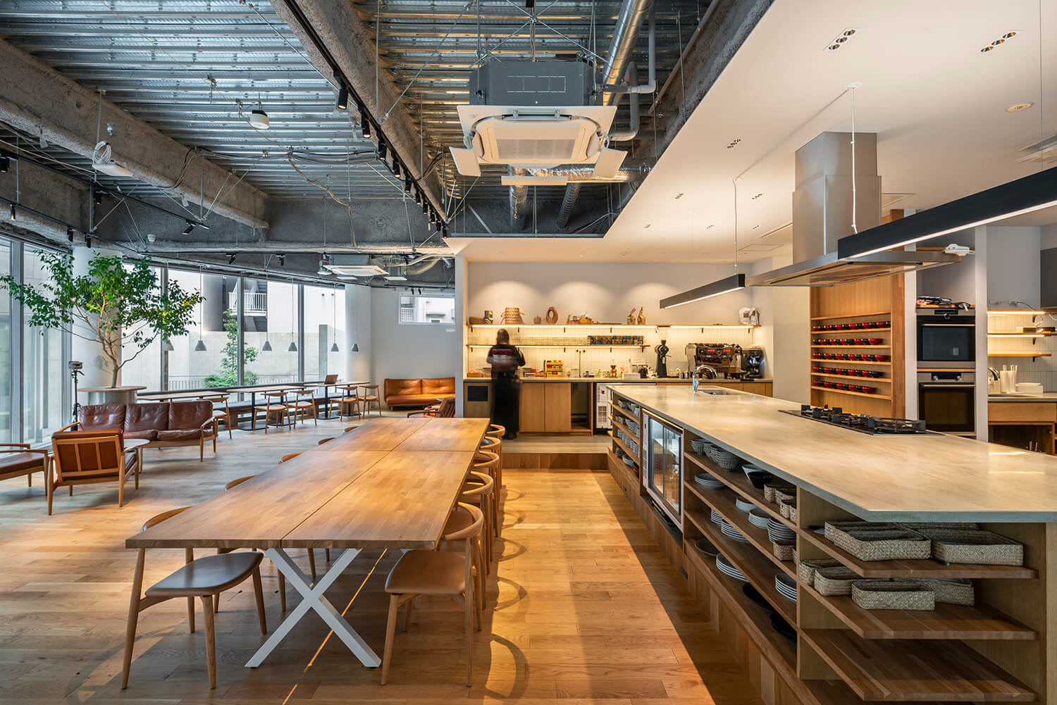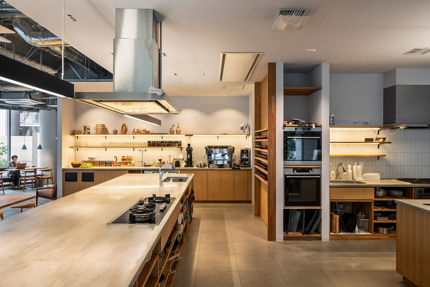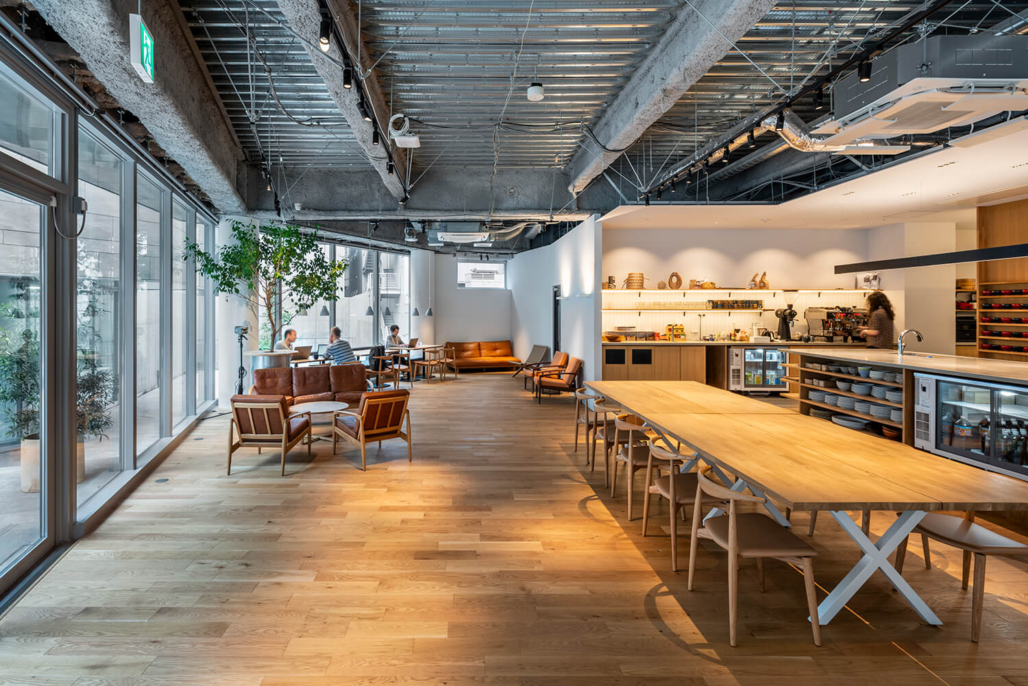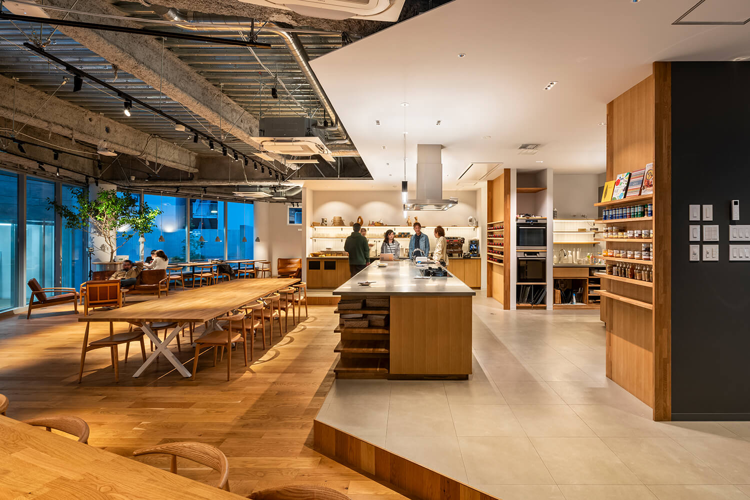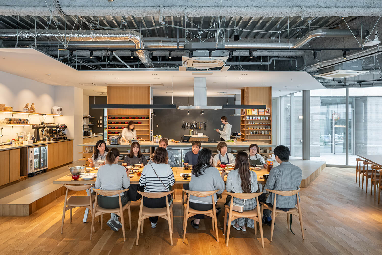 このダイニングエリアは、食事の時間に限らず、ミーティングや簡易的な打ち合わせ、さらにはレクチャーやイベントなどにも用いられる多目的な空間である。家具配置を可変とすることで、用途に応じた空間の読み替えが可能となっており、業務と非業務、フォーマルとインフォーマルの境界が緩やかに溶け合う場を形成している。エスプレッソマシンをはじめとした設備も、この空間の滞在性を高める要素として組み込まれている。
