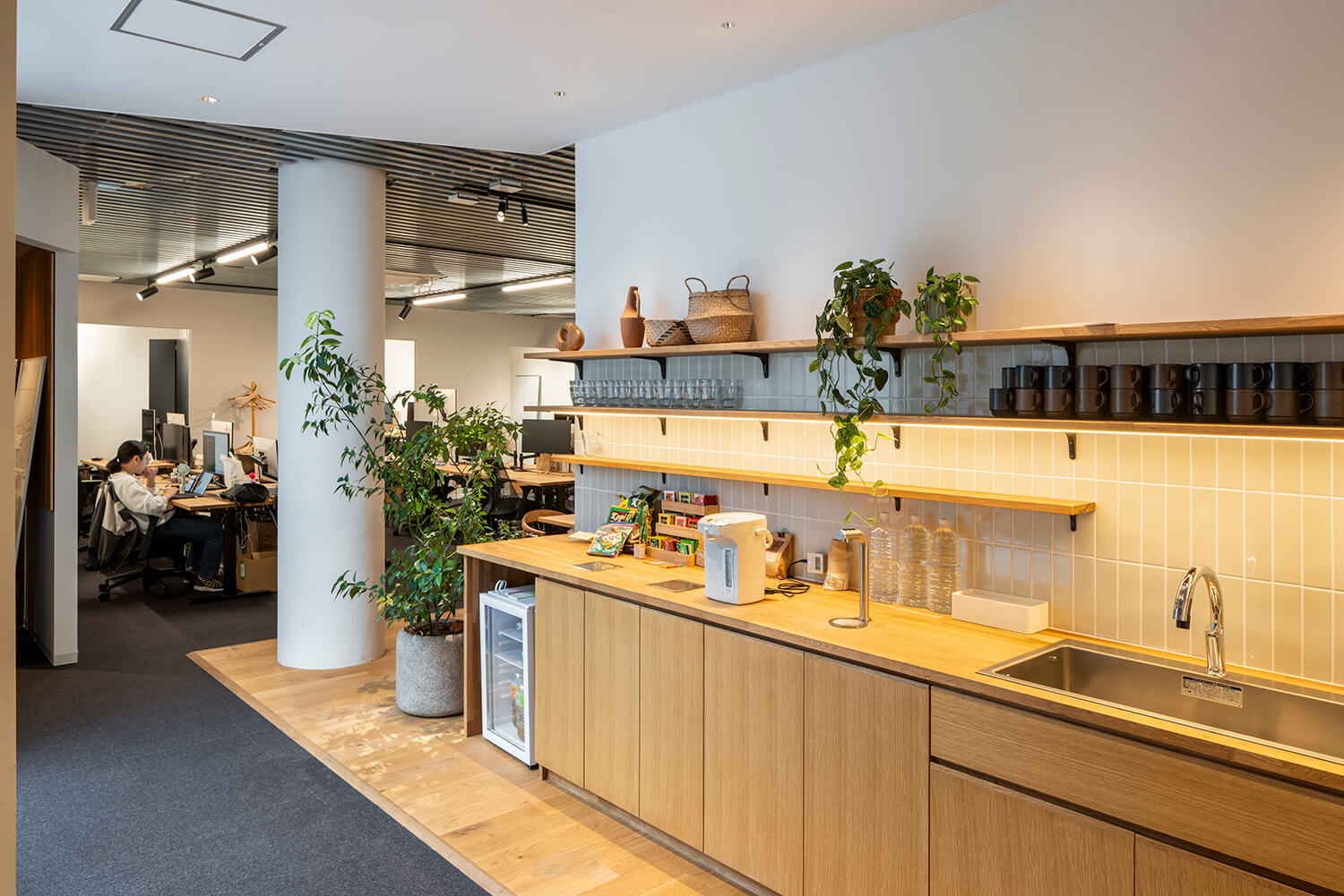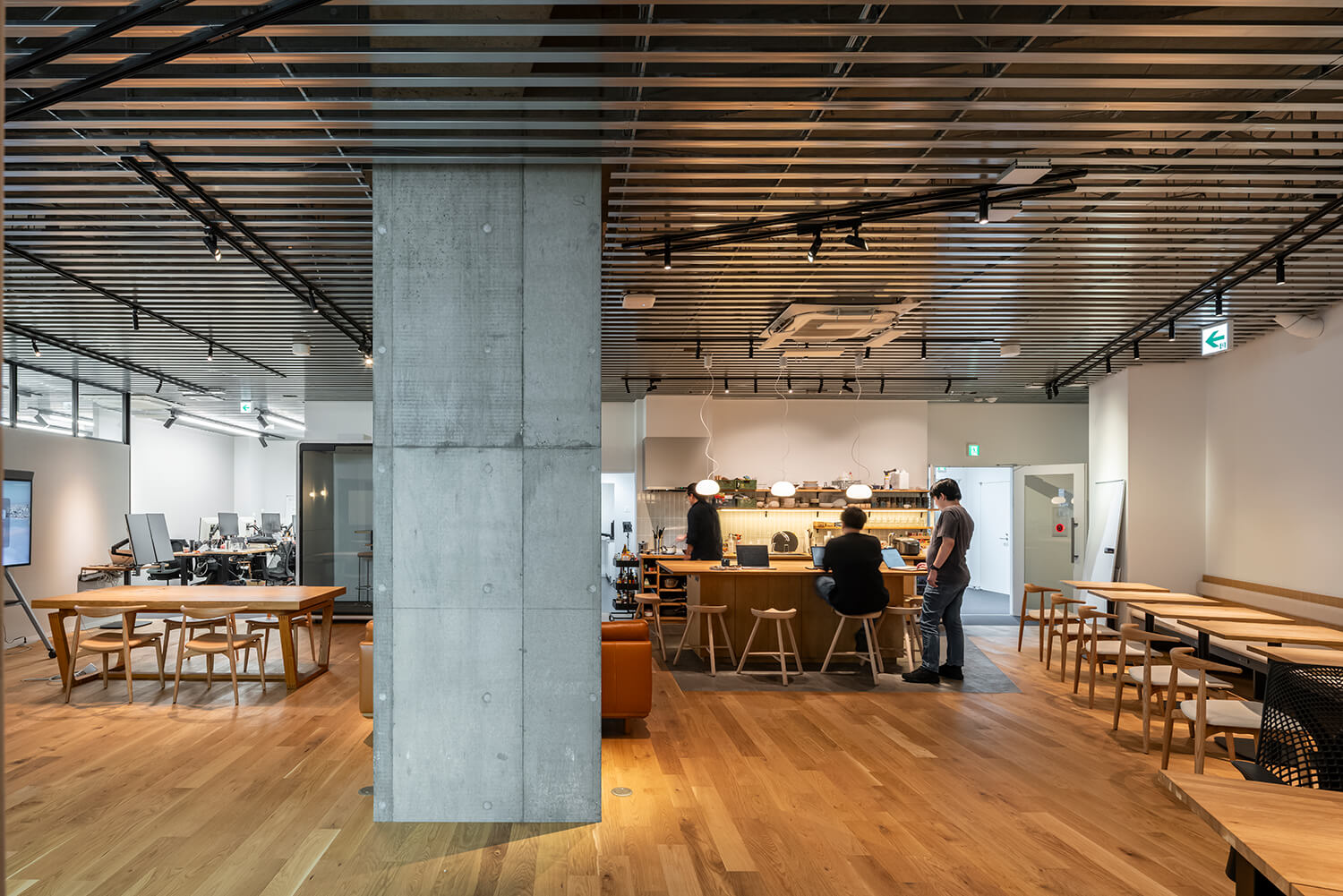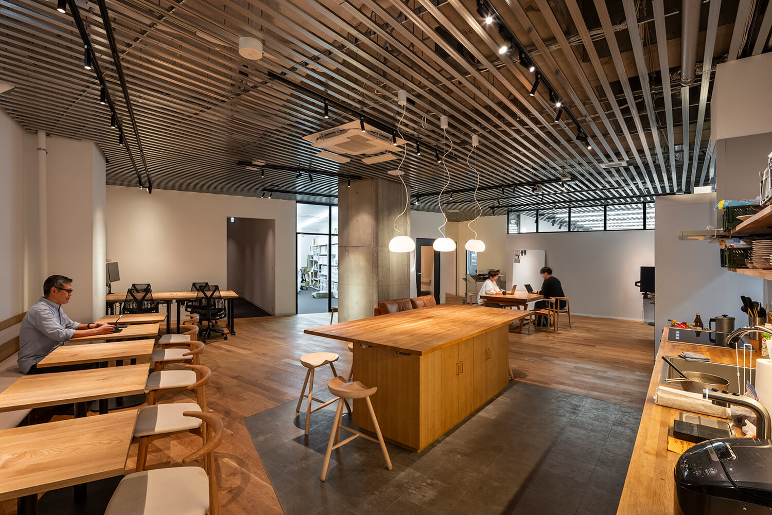このオフィスにおいてキッチンは、福利厚生的な設備ではなく、人の動きと関係性を編み直すための建築的装置として位置づけられている。