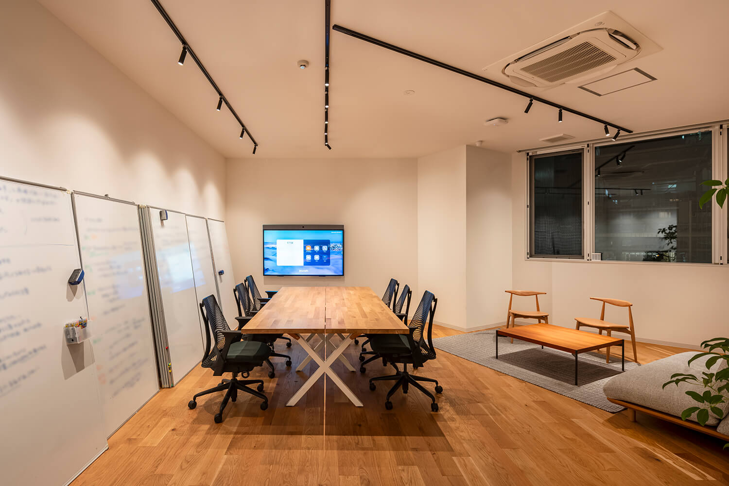 さらにこの通路沿いには、一般的な「会議室」とは異なる性格を持つ、居住性の高いミーティングルームを設けている。家具構成やスケール感は住宅のリビングを想起させるもので、リラックスした雰囲気の中で議論が行われることを意図している。壁面には多数のホワイトボードを設け、身体的な動きを伴いながら思考を展開するための空間として計画した。