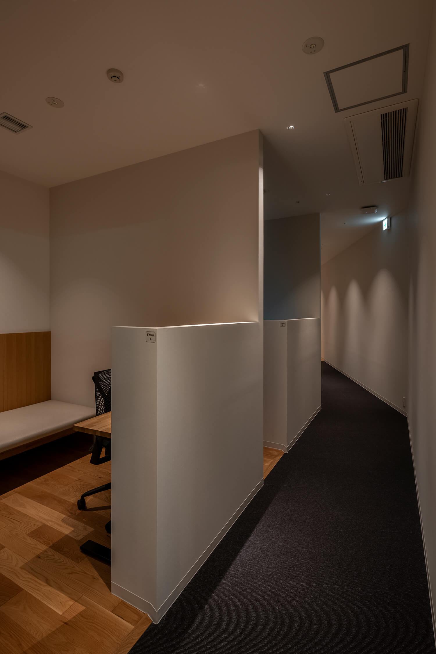 また、地下でありながら、ミーティングや執務が配置されたエリアの一部は、敷地裏側の段差を利用して外部に面しており、間接的な自然光と外部との関係を確保している。一方で、窓を持たないエリアについては、その特性を積極的に活かし、パワーナップや深い集中のための暗めの空間として設計した。