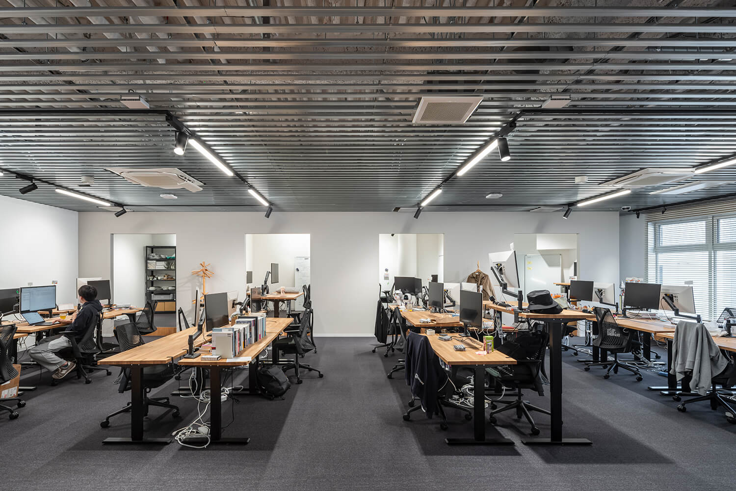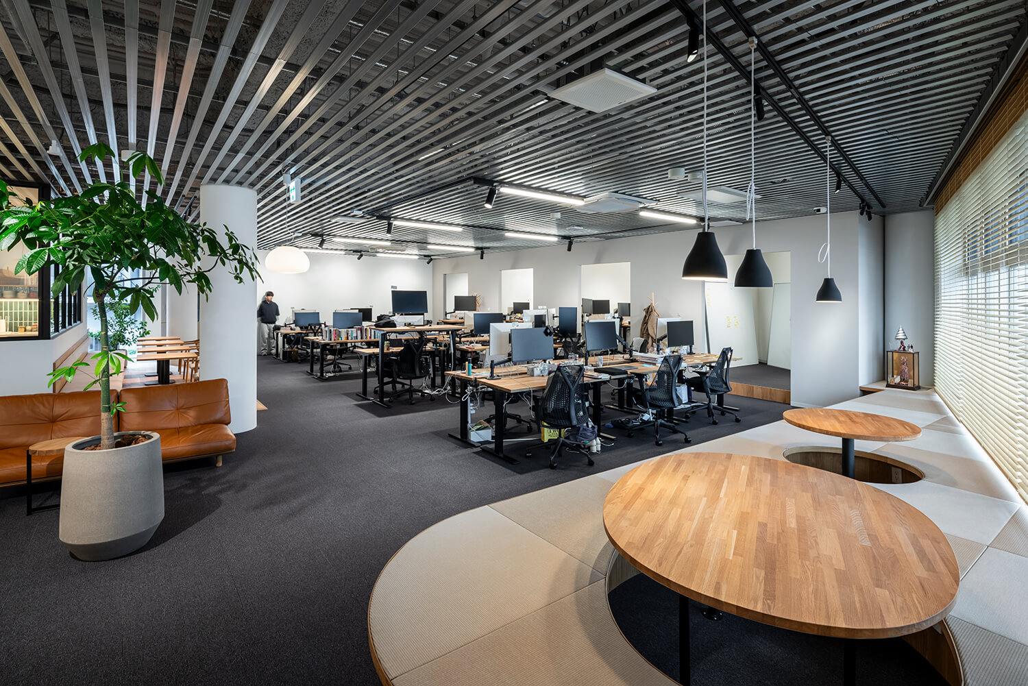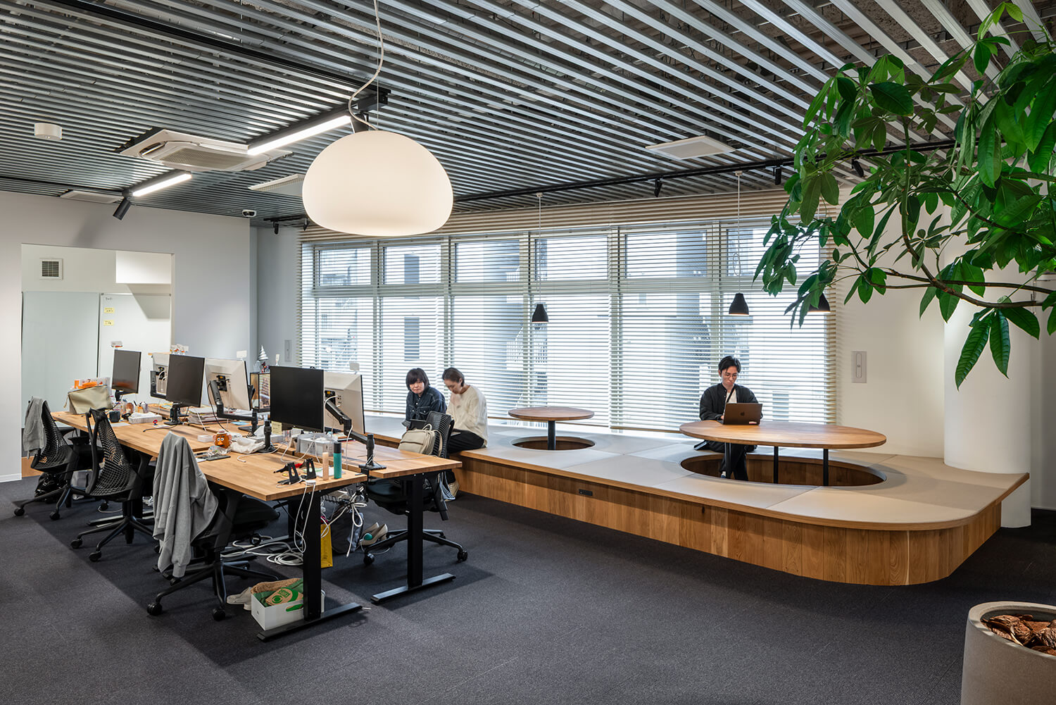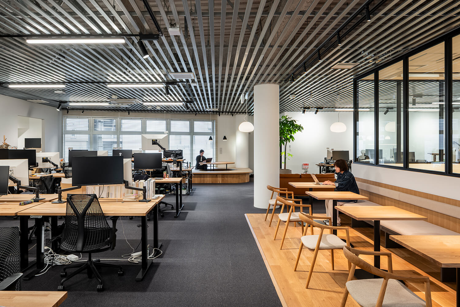 執務エリアは、広がりのある空間と、小さなチーム単位で使われるブース状の空間が混在する構成とし、業務の粒度に応じた環境を用意している。窓際には小上がりのスペースを設け、視線の高さや身体姿勢を変えることで、思考のモードを切り替える場として機能している。
