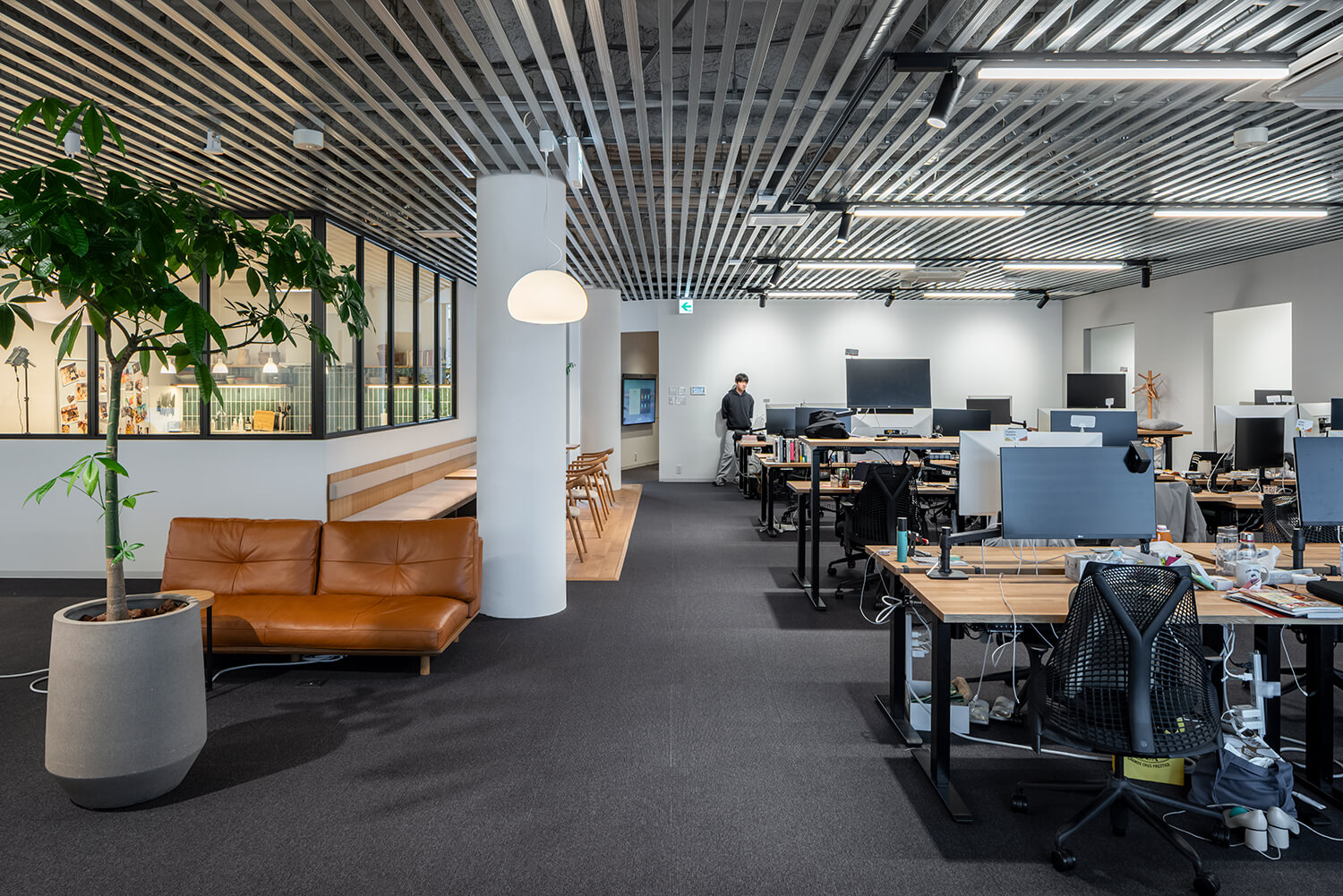 執務エリアでは、天井際にガラスを用いることで視線を遮りつつ、空間としての連続性を確保している。照明の色温度も意図的に調整し、キッチン周りのリラックスした雰囲気から、仕事モードへの心理的な切り替えを促す設えとした。広がりのあるオープンスペースと、グループ単位でまとまるブース状のスペースを併置することで、作業内容に応じた居場所の選択を可能としている。