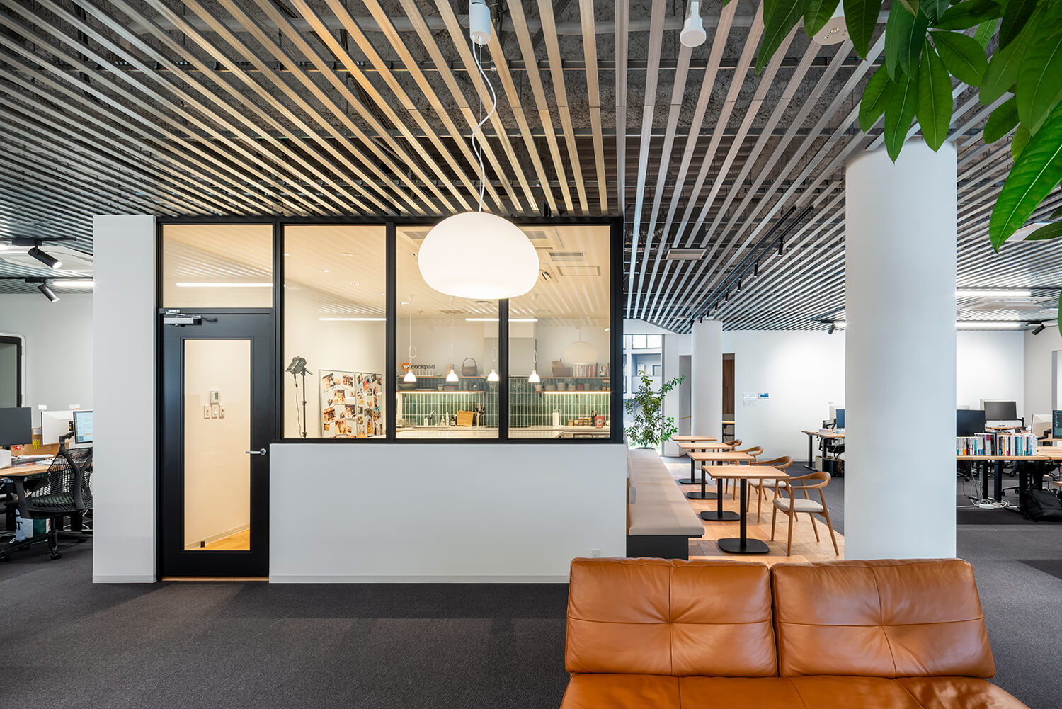 また、このフロアにはラウンジが設けられ、その背後にはガラス越しにキッチンスタジオが配置されている。日常の執務と、撮影・収録といった非日常的な活動とが視覚的に重なり合うことで、オフィス全体に多層的な時間と活動の気配をもたらしている。