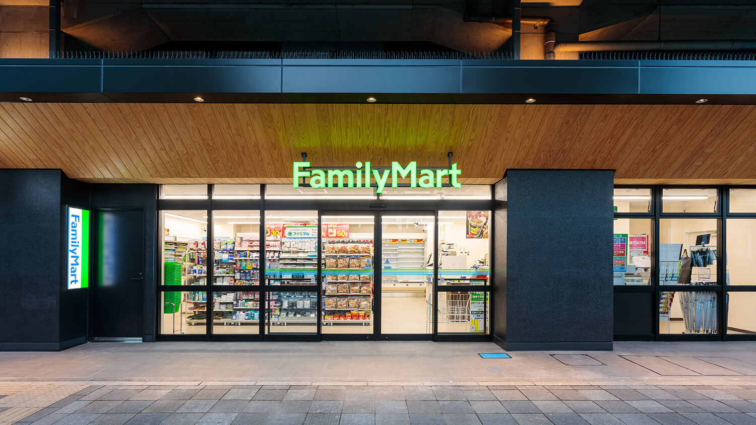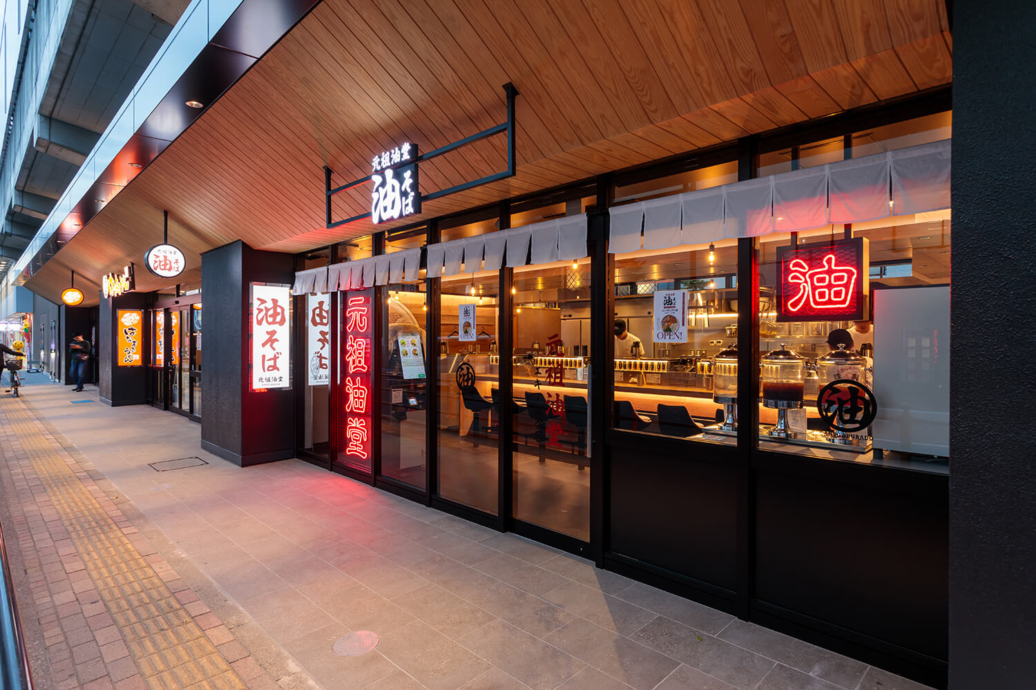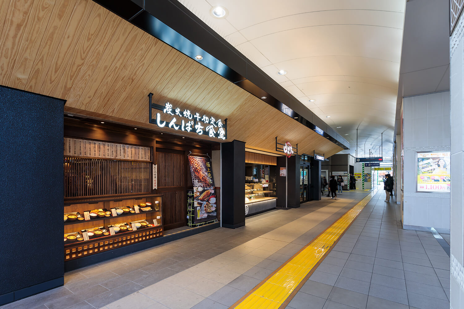 一方で、第Ⅱ期には駅内部の通路に直接面する部分も存在する。このエリアでは外部に軒を設けることができないため、店舗のファサードをガラス張りとし、駅通路から店舗の気配が感じられる構成とした。閉じた壁面をつくらず、視線が抜けることで、通過動線の中に商業の存在をにじませている。