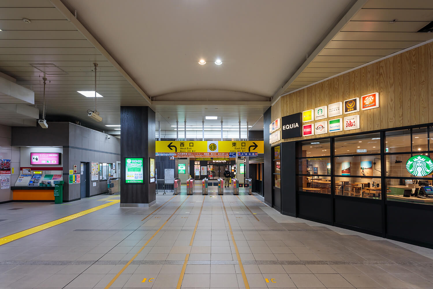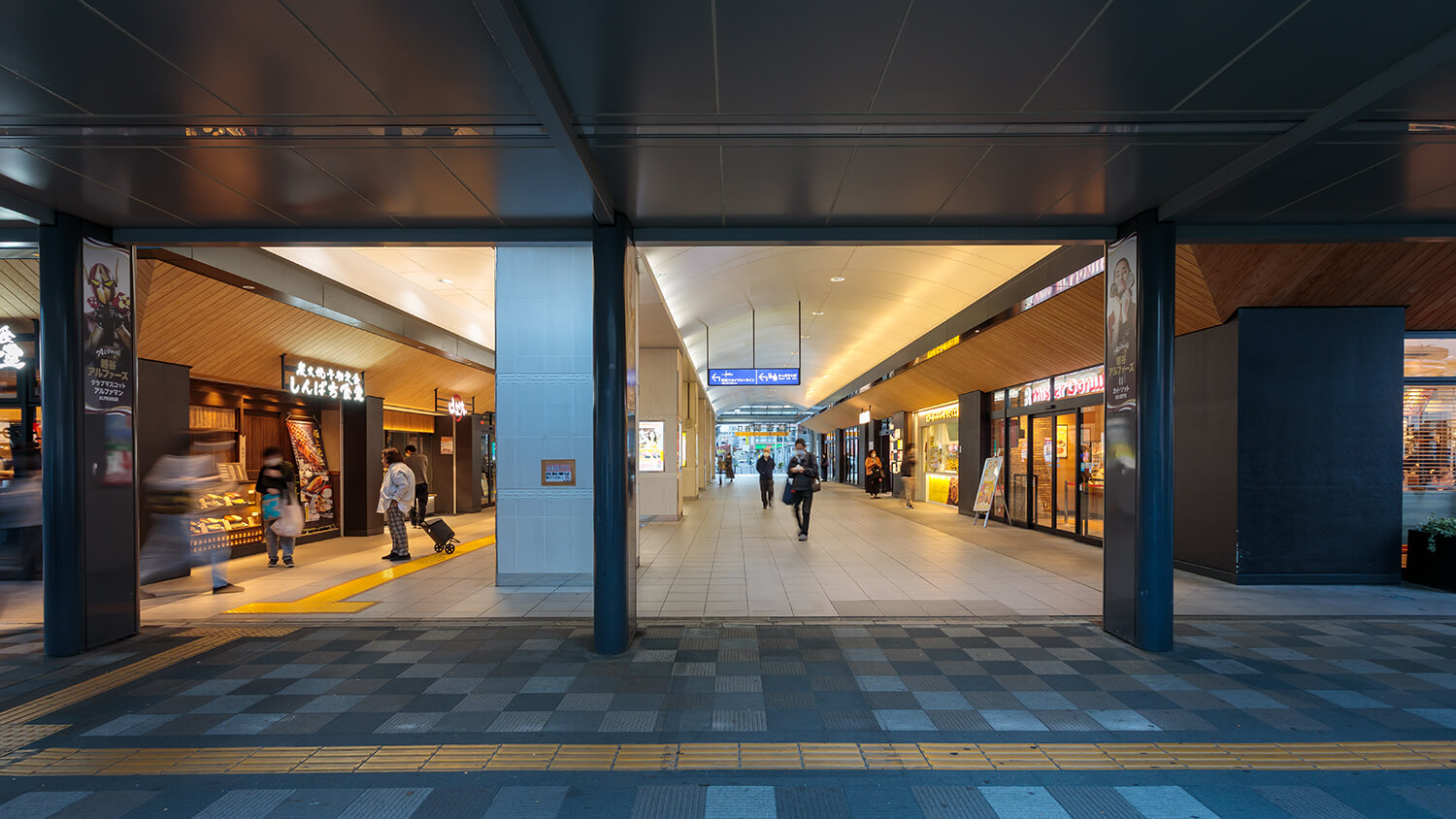 軒および壁面に用いられた木質仕上げは、無機的になりがちな高架下や駅内部空間にぬくもりを与え、「通過する場所」から「立ち寄ってもよい場所」へと空間の性格を緩やかに転換している。