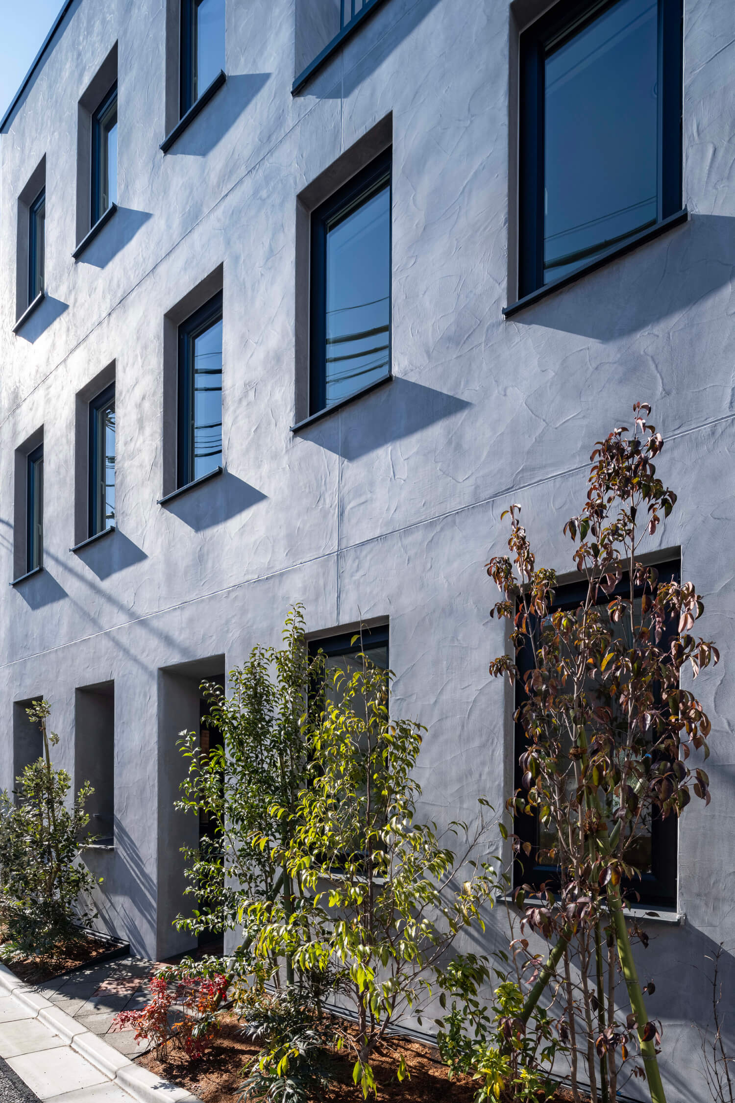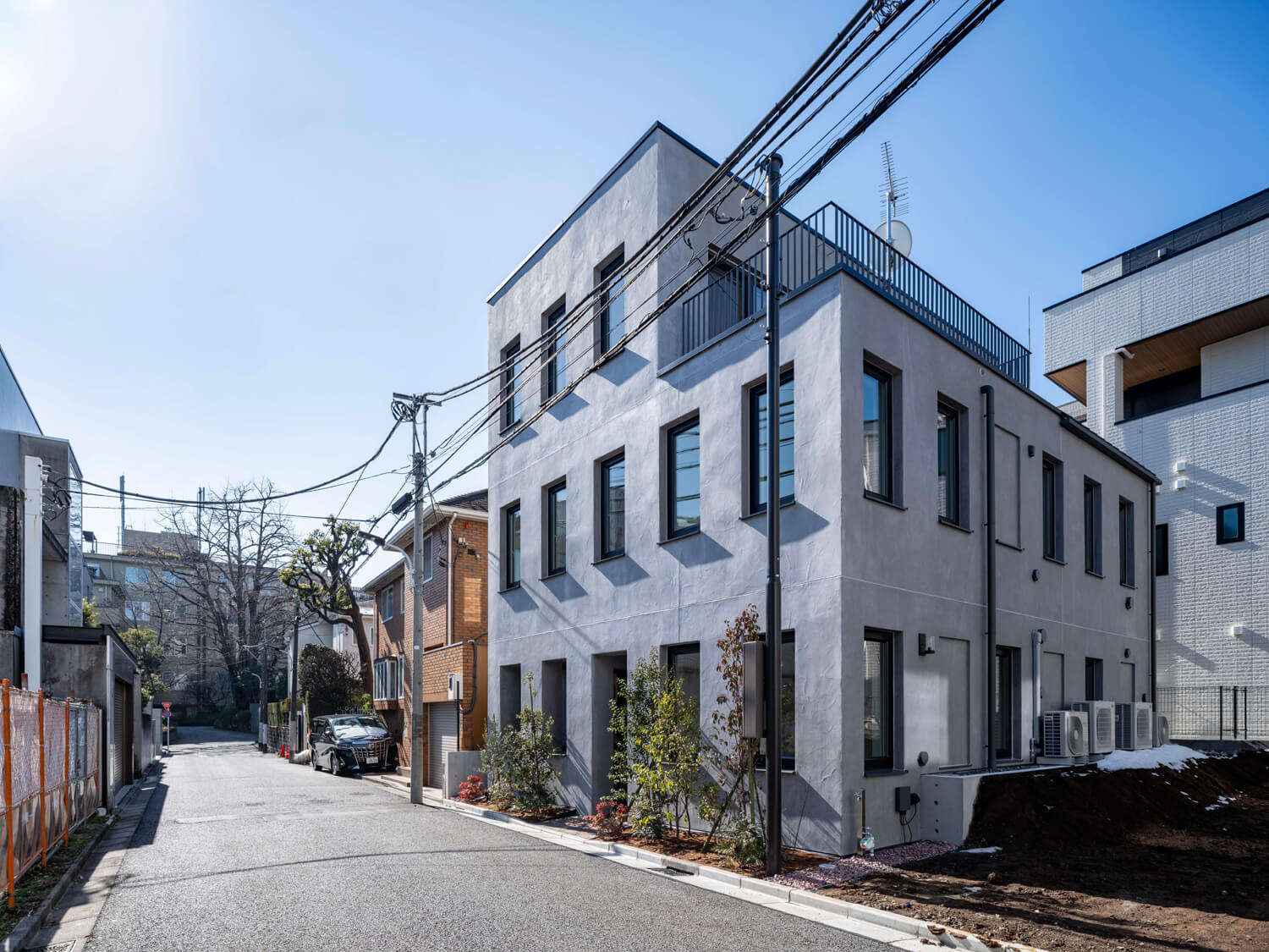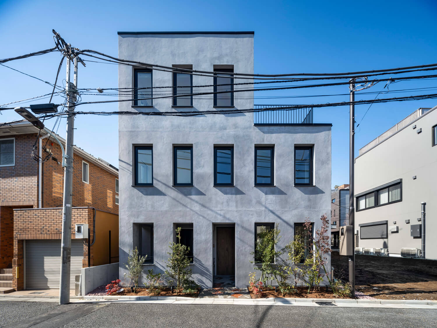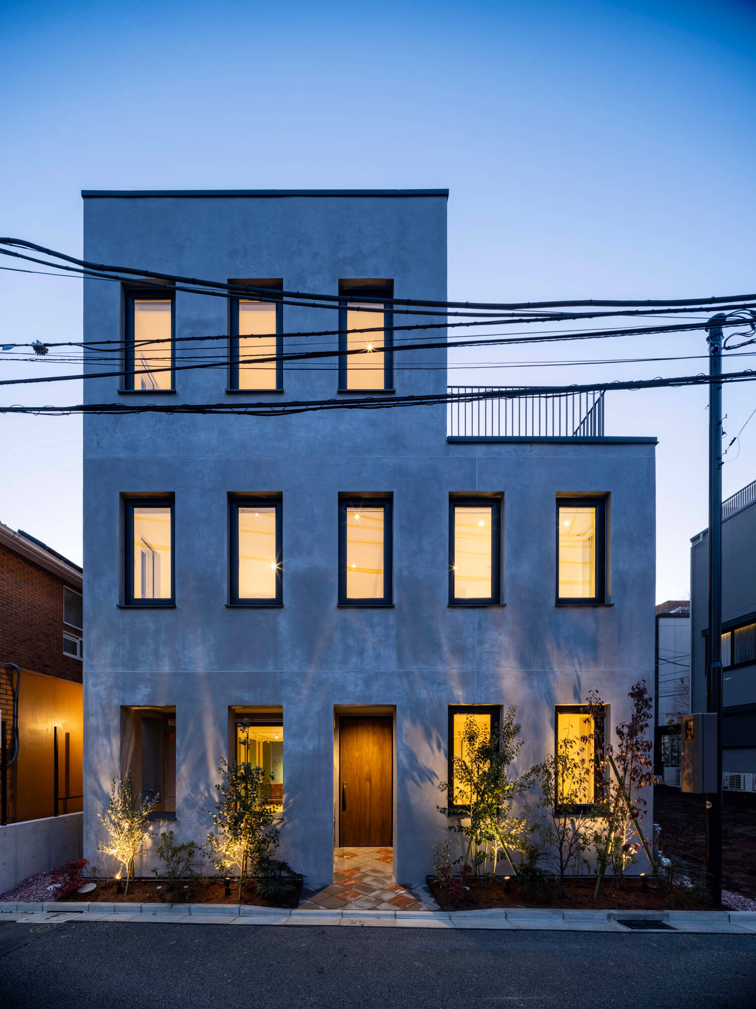 A house for two families was planned on a site divided by inheritance in a residential area of Minami Azabu, where many embassies and luxury flats are located. The site had been the home of the client’s great-grandfather, but due to the inheritance over several generations, the site became smaller and the building was closer to the street and the neighbouring land, so windows were an important theme, connecting the interior and the exterior. The internal composition of the living room, bedrooms and drawing room is overtly revealed to the outside when appropriate openings are made in accordance with the room composition. In addition, the larger openings in the living room and other rooms are fully visible from the street, and lace curtains are often closed even during the day. In this house, we tried to create windows that give a sense of openness from the inside, but do not allow the inside to be seen much from the outside. The sense of openness felt in relation to the windows is largely determined by the distance from the window. When indoors, the distance to the window is closer than when outside, so if the window has a certain width and height, it feels sufficiently open from the inside. On the other hand, from the outside, as long as you are not too close to the building, if the width and height of the window is kept to a certain extent, the interior is not too visible. In addition, the windows were arranged as homogeneously as possible so as not to reveal the internal composition. Each internal room gains as many openings as necessary alongside the exterior facing wall to bring light and air inside. Windows of this size do not allow much insight into the interior from the outside, even when the blinds are not closed, but from the inside the outside is clearly visible, providing a sense of openness while ensuring privacy. By rotating these homogenous windows to the side of the facade facing the neighbouring property, it is possible to respond to any changes in the situation of the neighbouring property. The aim was to create a house that is neither autonomously isolated from its surroundings nor autonomously open to its current surroundings, but autonomously closed and open at the same time, so that it can be lived in the city in abundance.