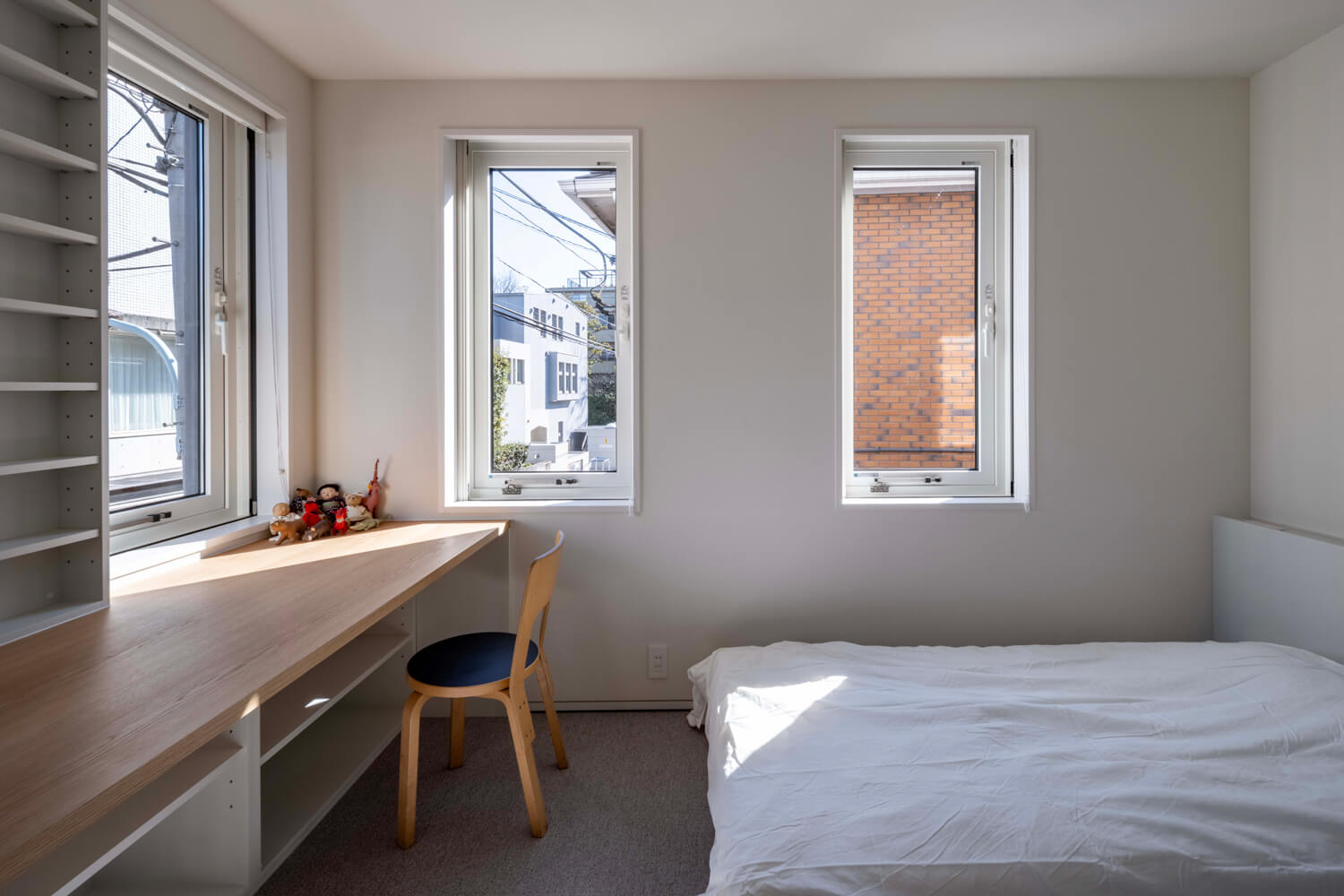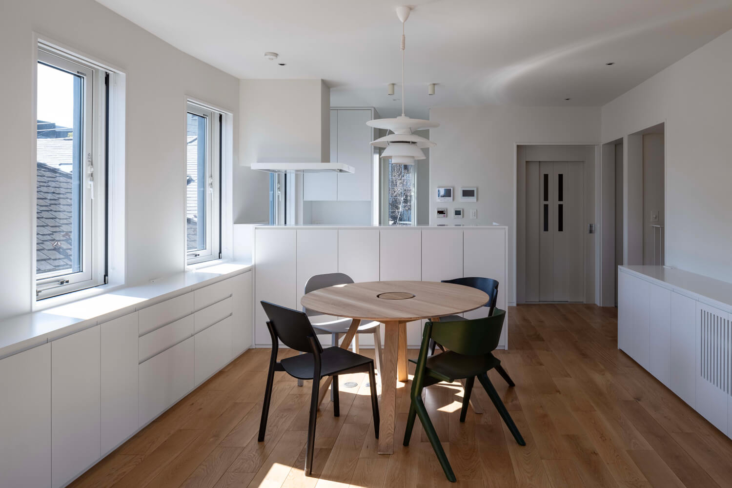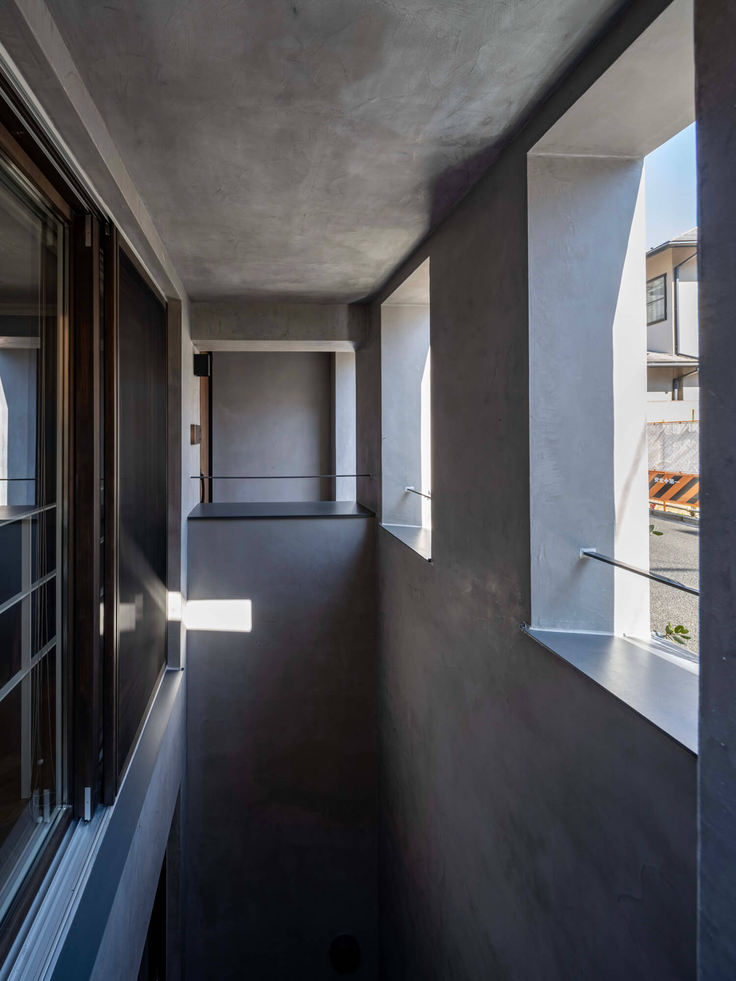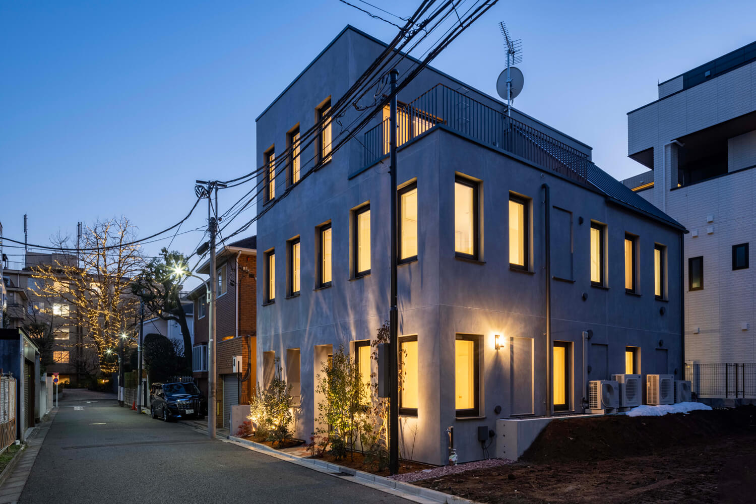 A house for two families was planned on a site divided by inheritance in a residential area of Minami Azabu, where many embassies and luxury flats are located. The site had been the home of the client’s great-grandfather, but due to the inheritance over several generations, the site became smaller and the building was closer to the street and the neighbouring land, so windows were an important theme, connecting the interior and the exterior. The internal composition of the living room, bedrooms and drawing room is overtly revealed to the outside when appropriate openings are made in accordance with the room composition. In addition, the larger openings in the living room and other rooms are fully visible from the street, and lace curtains are often closed even during the day. In this house, we tried to create windows that give a sense of openness from the inside, but do not allow the inside to be seen much from the outside. The sense of openness felt in relation to the windows is largely determined by the distance from the window. When indoors, the distance to the window is closer than when outside, so if the window has a certain width and height, it feels sufficiently open from the inside. On the other hand, from the outside, as long as you are not too close to the building, if the width and height of the window is kept to a certain extent, the interior is not too visible. In addition, the windows were arranged as homogeneously as possible so as not to reveal the internal composition. Each internal room gains as many openings as necessary alongside the exterior facing wall to bring light and air inside. Windows of this size do not allow much insight into the interior from the outside, even when the blinds are not closed, but from the inside the outside is clearly visible, providing a sense of openness while ensuring privacy. By rotating these homogenous windows to the side of the facade facing the neighbouring property, it is possible to respond to any changes in the situation of the neighbouring property. The aim was to create a house that is neither autonomously isolated from its surroundings nor autonomously open to its current surroundings, but autonomously closed and open at the same time, so that it can be lived in the city in abundance.