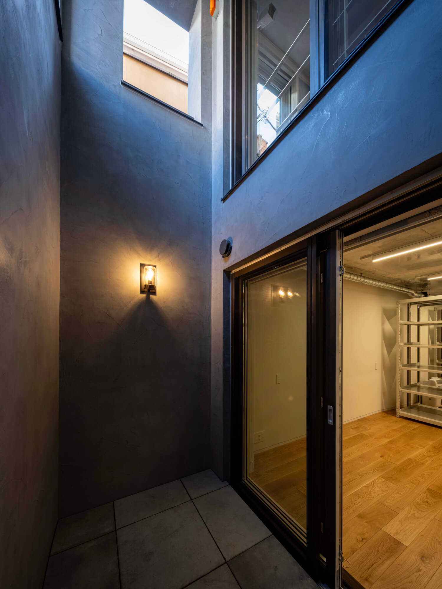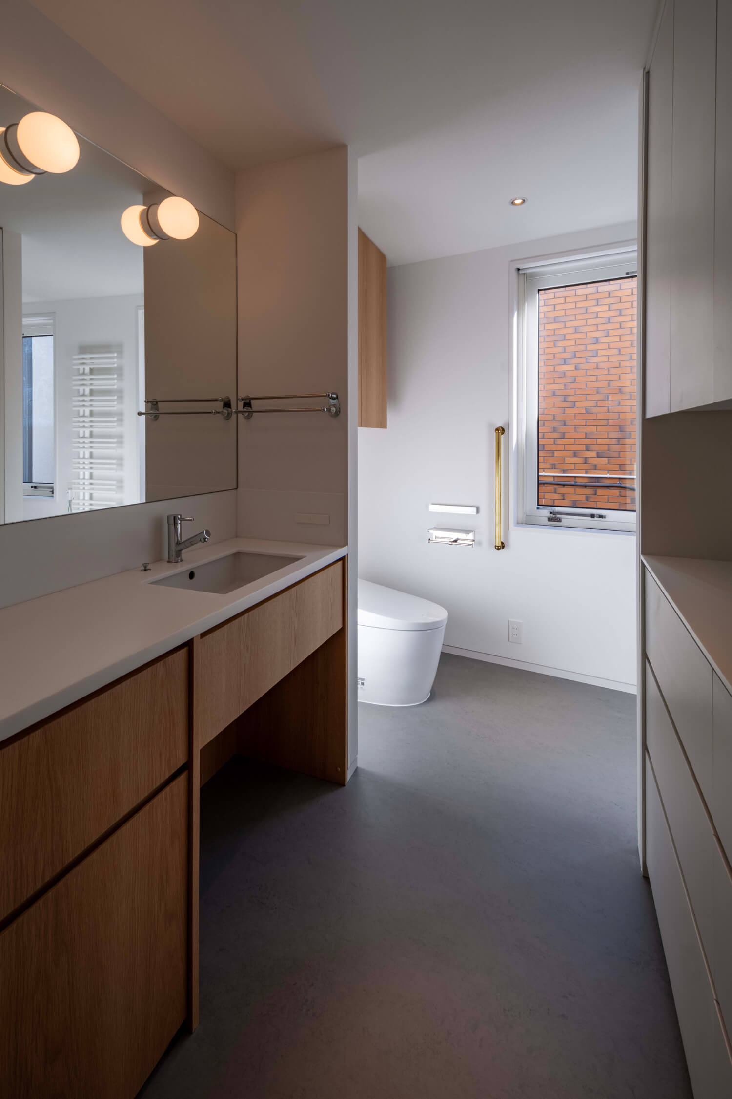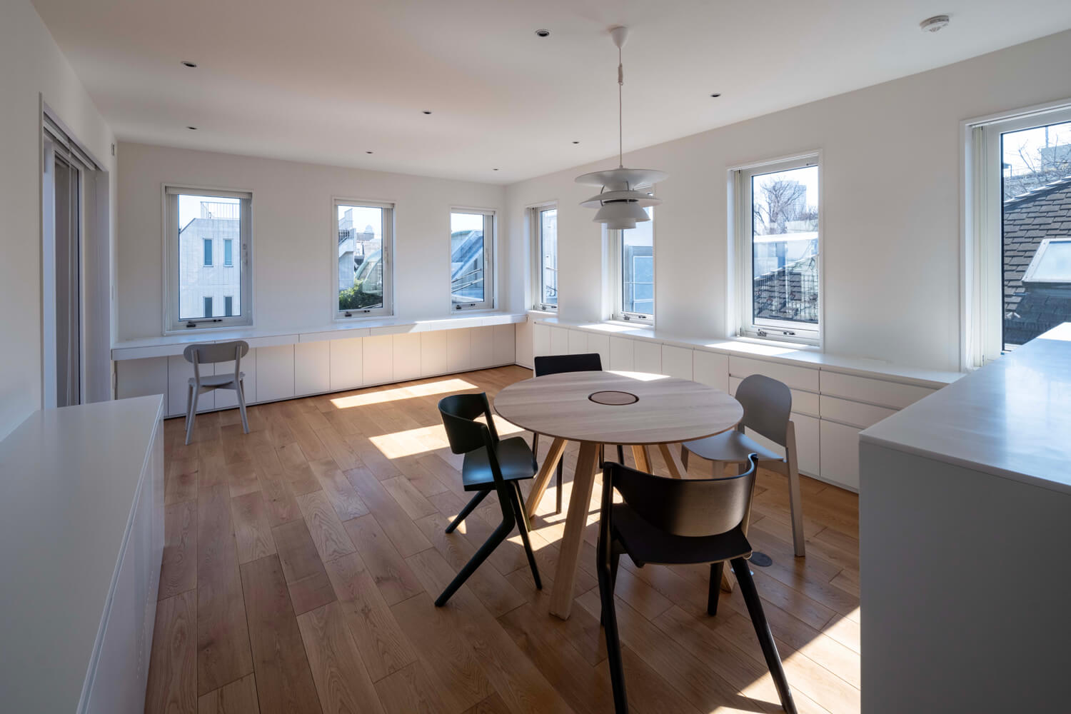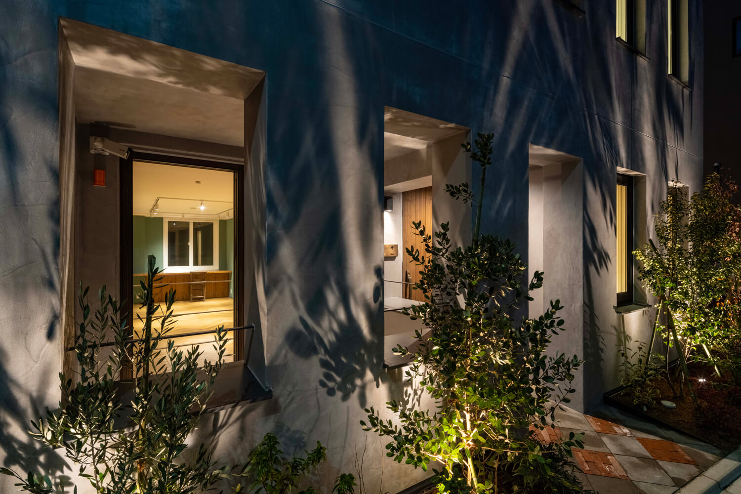 A house for two families was planned on a site divided by inheritance in a residential area of Minami Azabu, where many embassies and luxury flats are located. The site had been the home of the client’s great-grandfather, but due to the inheritance over several generations, the site became smaller and the building was closer to the street and the neighbouring land, so windows were an important theme, connecting the interior and the exterior. The internal composition of the living room, bedrooms and drawing room is overtly revealed to the outside when appropriate openings are made in accordance with the room composition. In addition, the larger openings in the living room and other rooms are fully visible from the street, and lace curtains are often closed even during the day. In this house, we tried to create windows that give a sense of openness from the inside, but do not allow the inside to be seen much from the outside. The sense of openness felt in relation to the windows is largely determined by the distance from the window. When indoors, the distance to the window is closer than when outside, so if the window has a certain width and height, it feels sufficiently open from the inside. On the other hand, from the outside, as long as you are not too close to the building, if the width and height of the window is kept to a certain extent, the interior is not too visible. In addition, the windows were arranged as homogeneously as possible so as not to reveal the internal composition. Each internal room gains as many openings as necessary alongside the exterior facing wall to bring light and air inside. Windows of this size do not allow much insight into the interior from the outside, even when the blinds are not closed, but from the inside the outside is clearly visible, providing a sense of openness while ensuring privacy. By rotating these homogenous windows to the side of the facade facing the neighbouring property, it is possible to respond to any changes in the situation of the neighbouring property. The aim was to create a house that is neither autonomously isolated from its surroundings nor autonomously open to its current surroundings, but autonomously closed and open at the same time, so that it can be lived in the city in abundance.