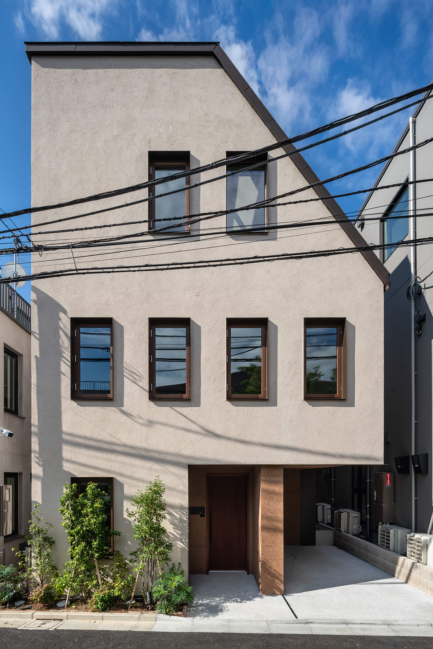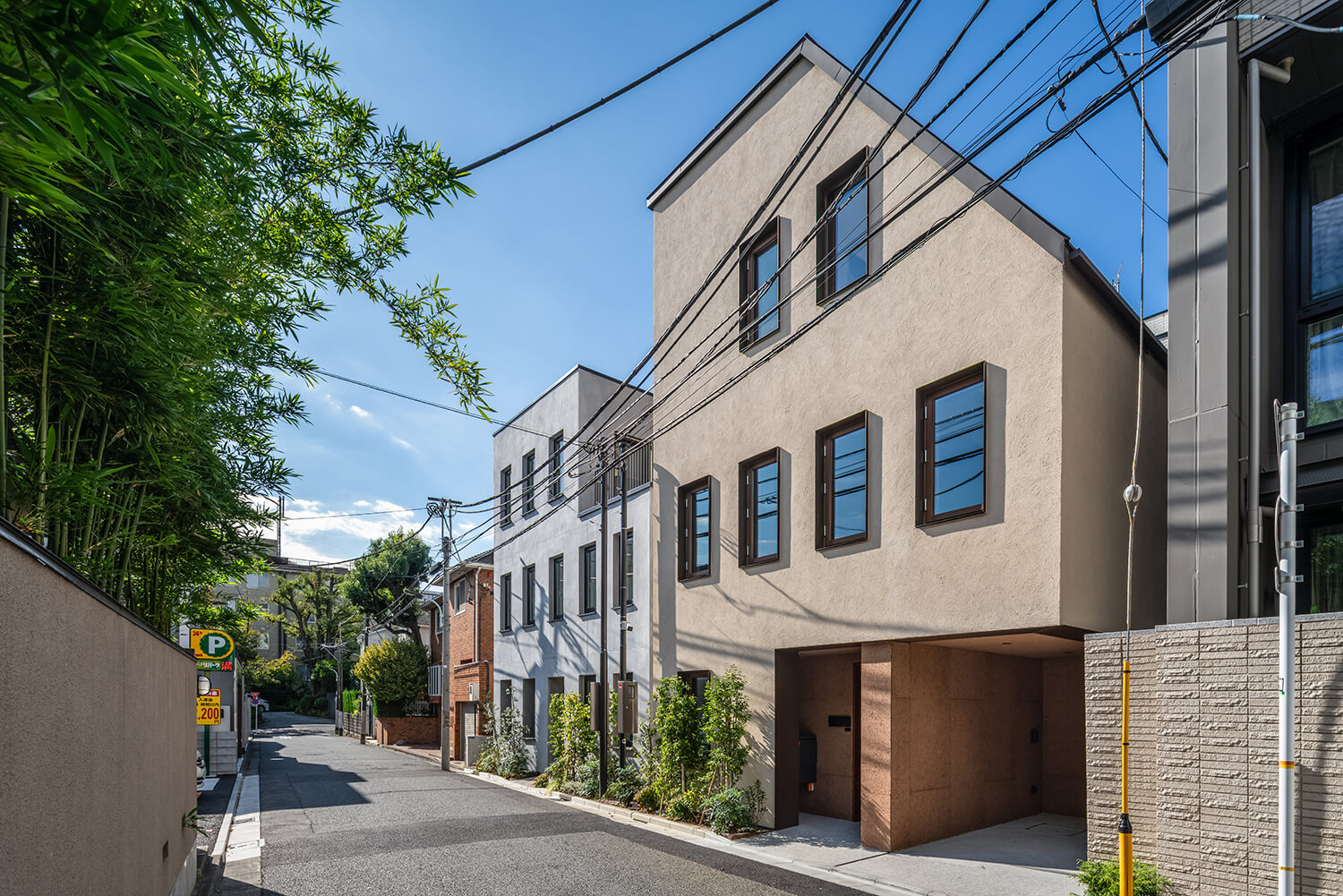 Of the three houses, the one closest to the street was designed by a different architect, while the house further back on the site is Azabu Perforated Facade House, previously designed by us. Positioned between these two neighbours, this house mediates their relationship both compositionally and materially.