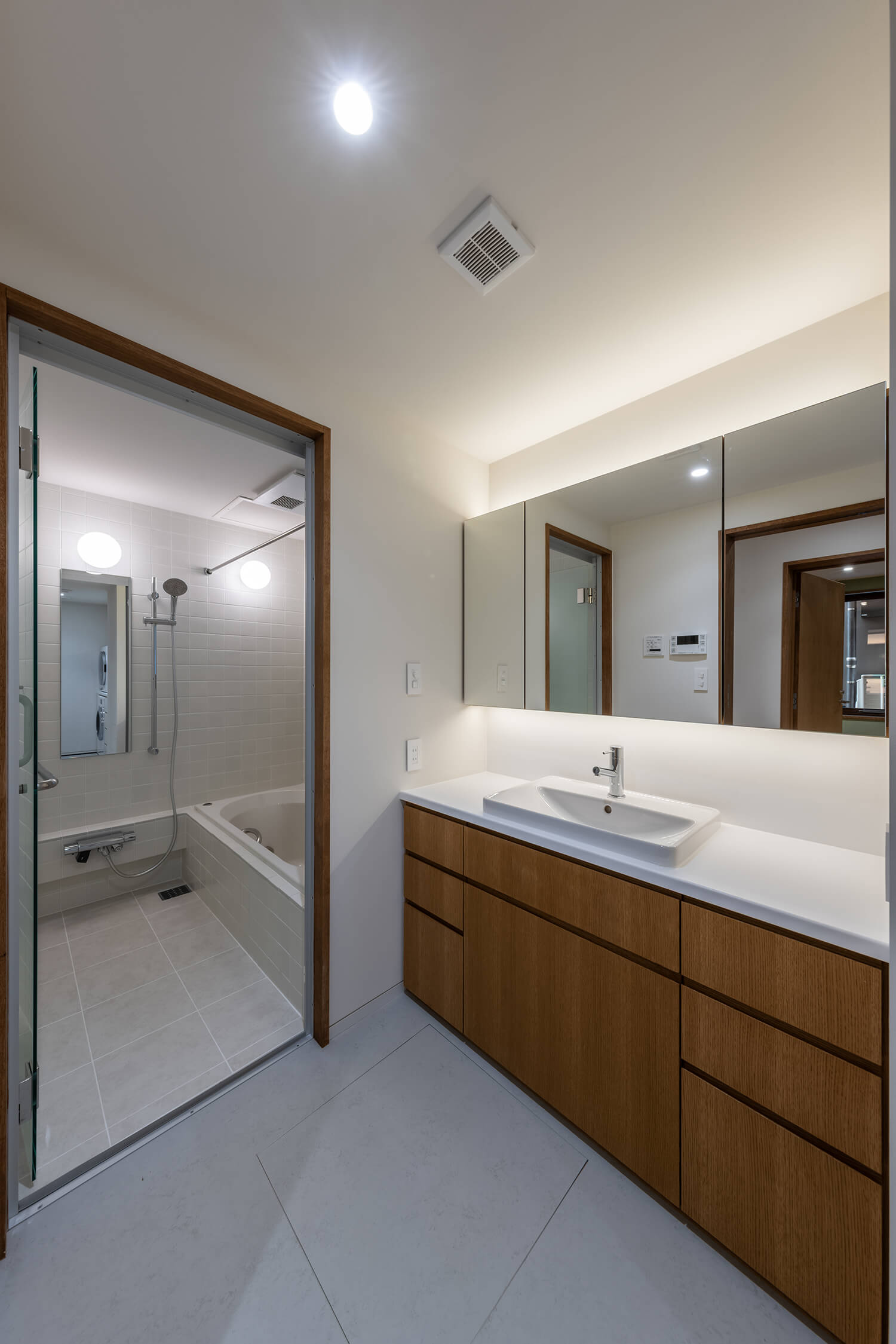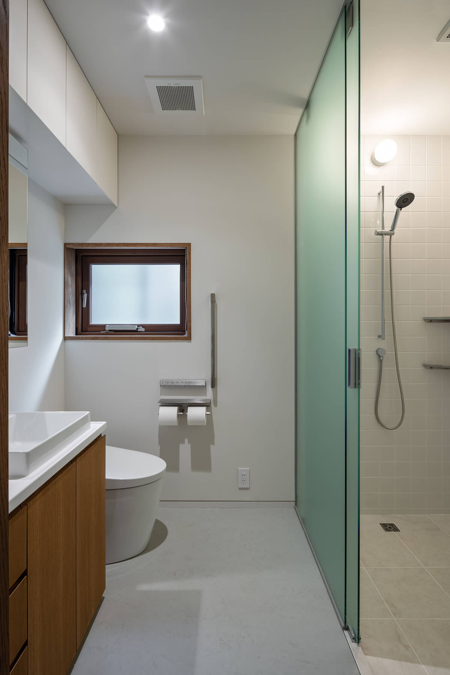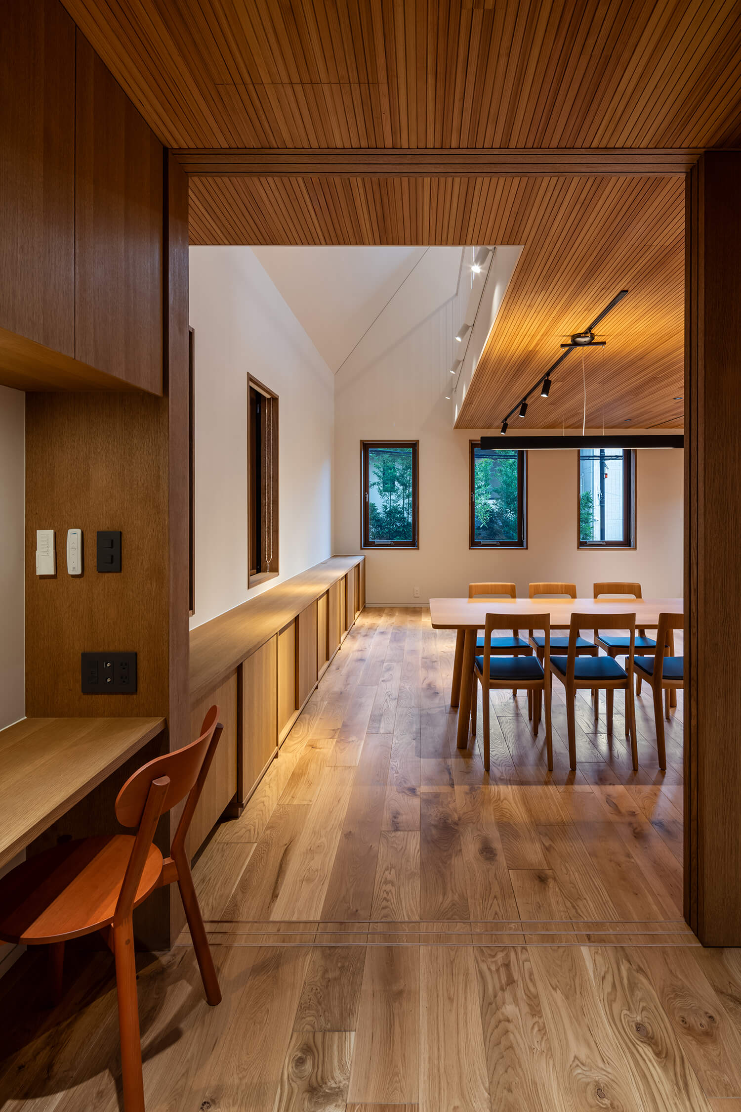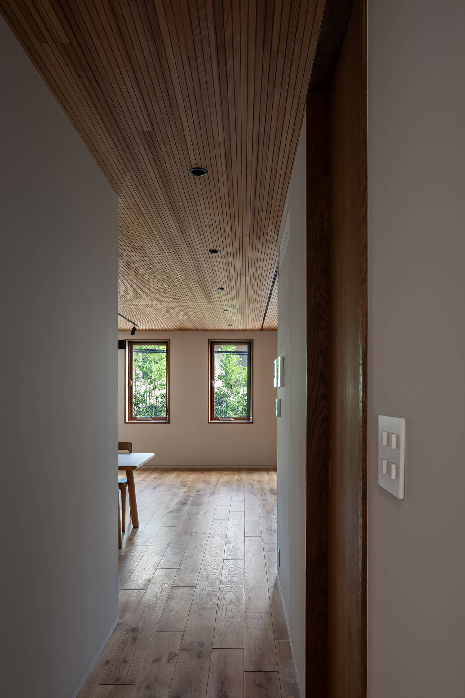 Around the entrance, dark brown wood-wool cement boards introduce a textural contrast with the warm exterior walls. The subdued tones lend calmness and familiarity to the building’s interface with the city. Planting accompanies the approach from the street, establishing a soft green margin along the site boundary — a feature shared by all three houses. Just as the bamboo grove on the neighbouring plot appears as borrowed scenery from the living room, the greenery of each house was conceived to become part of a shared landscape among them.