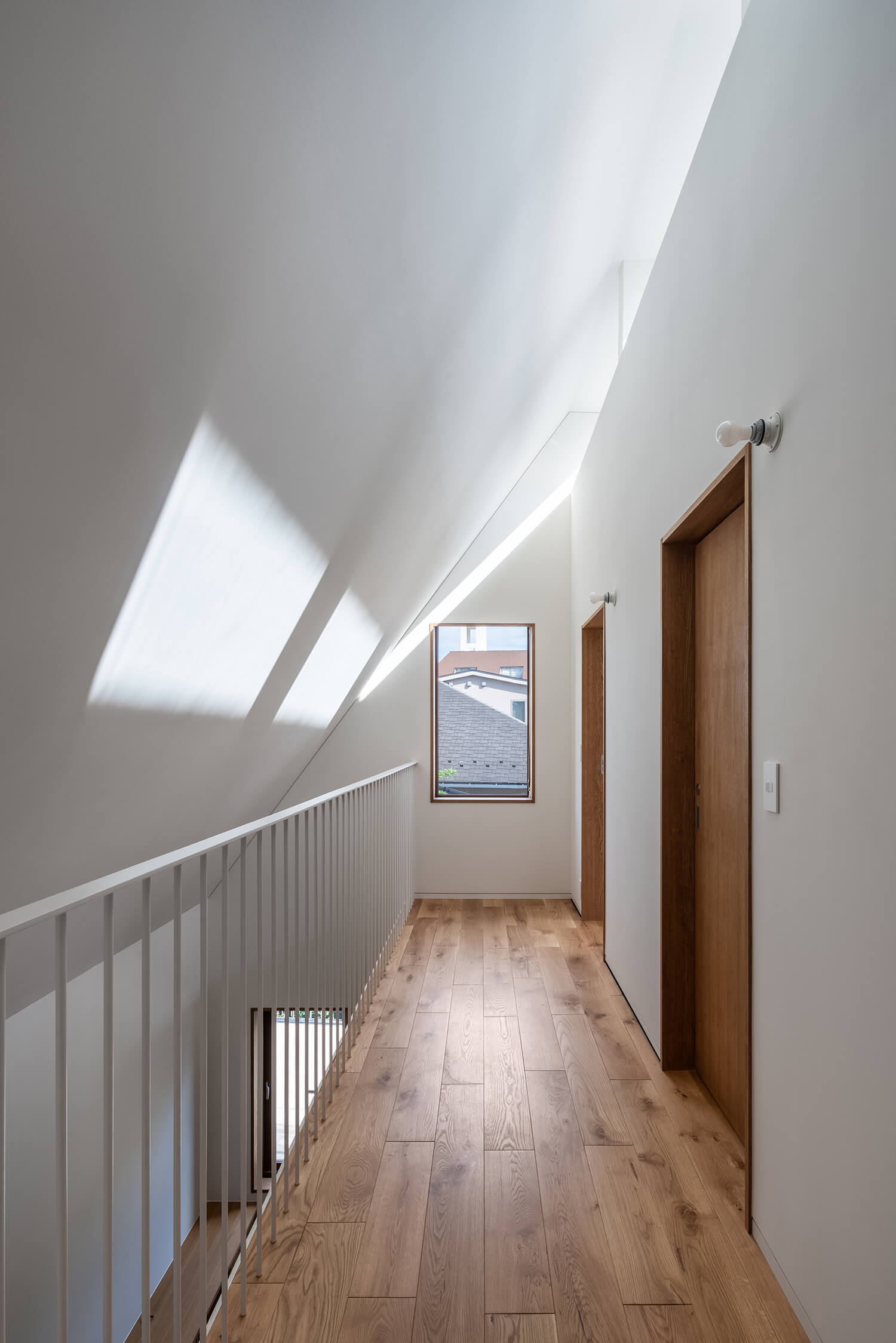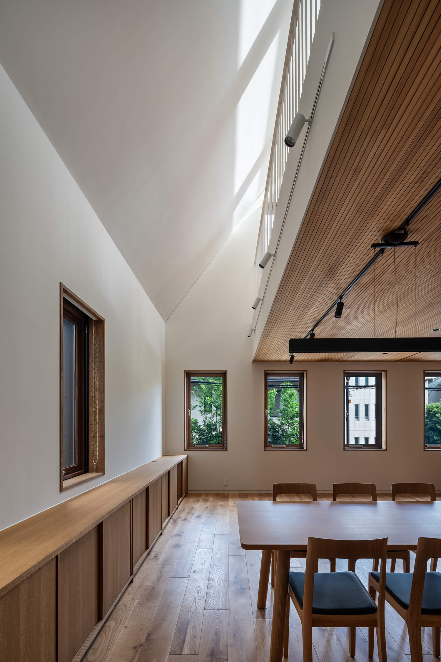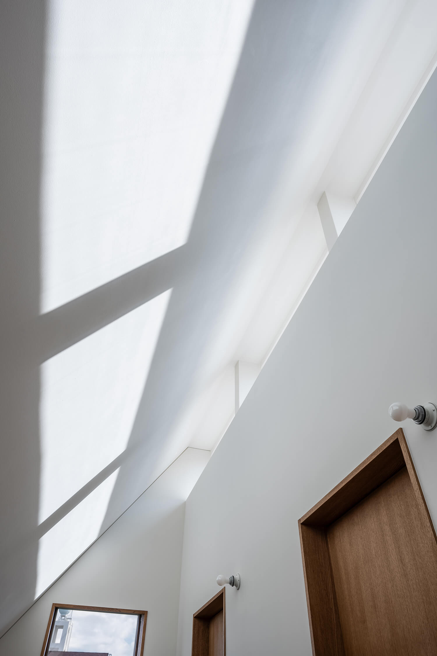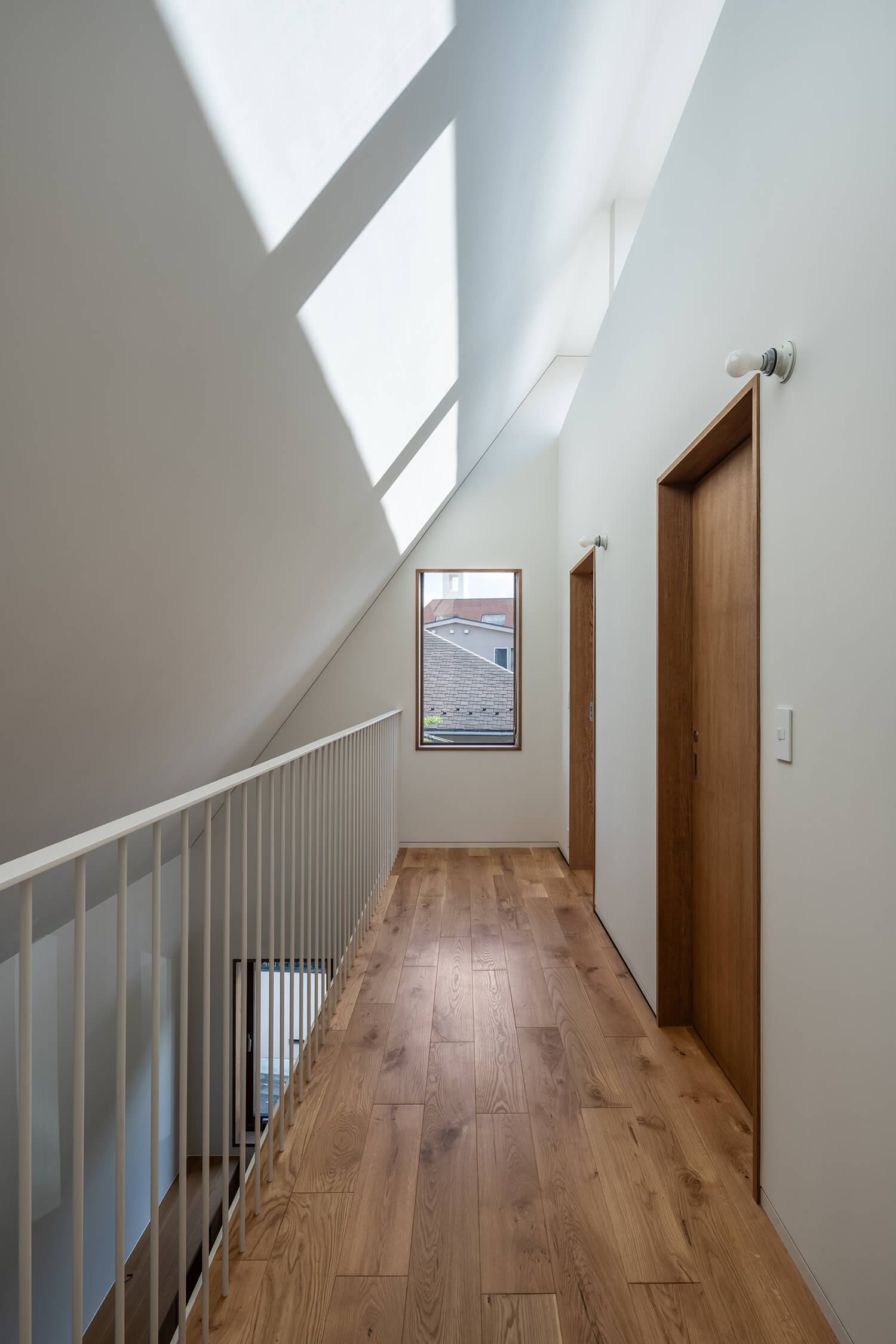 Unlike Azabu Perforated Facade House, where the living room occupies the third floor and the slant-affected portion becomes a terrace, this project places the principal living space on the second floor. Part of the third floor is opened into a void, allowing the inclined ceiling to function as a reflective plane that draws light down into the interior.