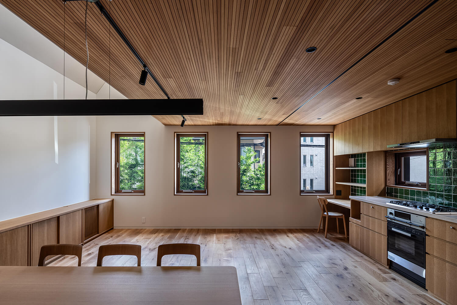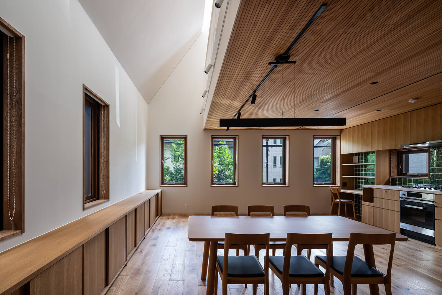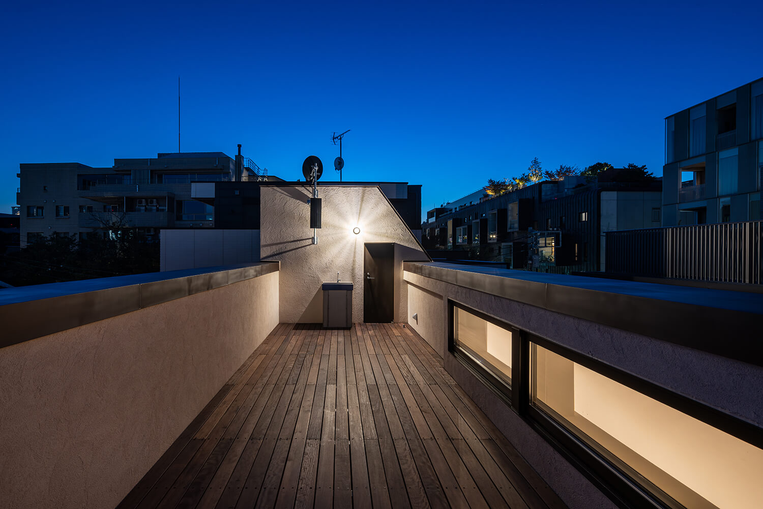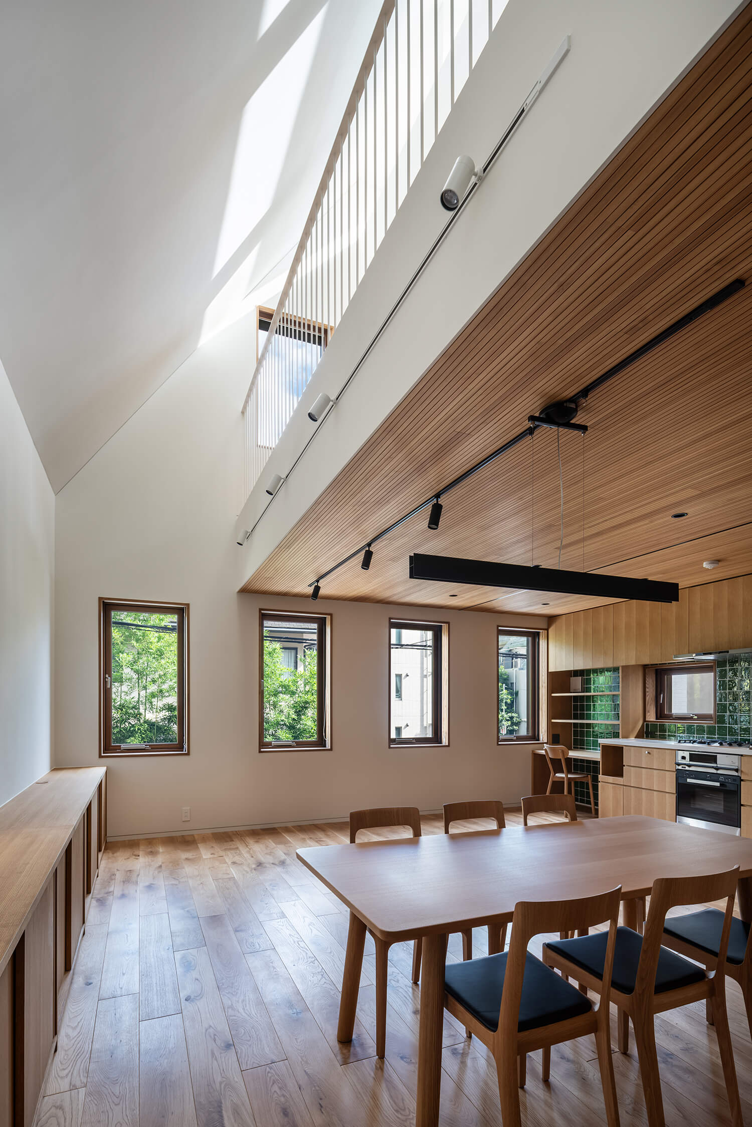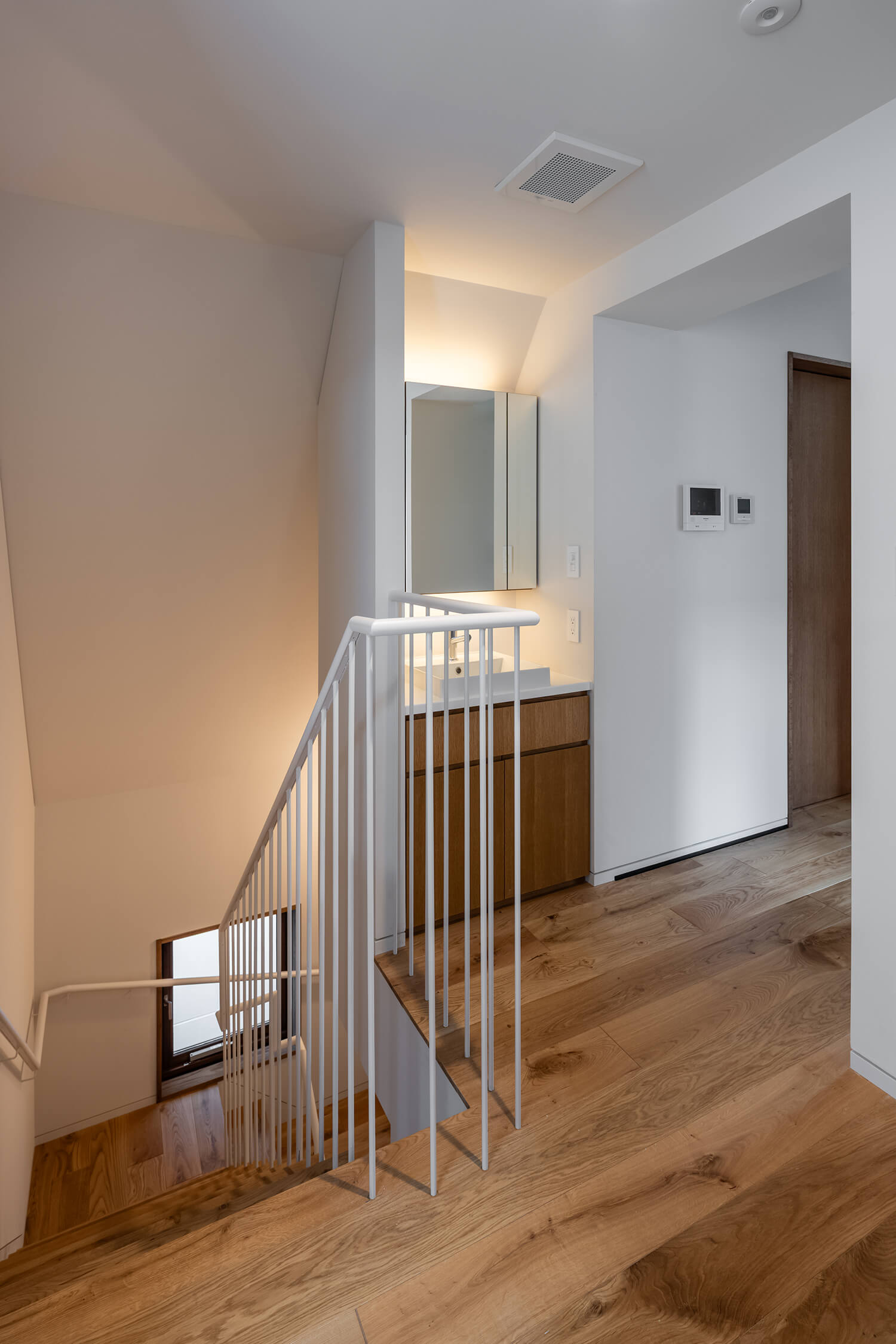 Unlike Azabu Perforated Facade House, where the living room occupies the third floor and the slant-affected portion becomes a terrace, this project places the principal living space on the second floor. Part of the third floor is opened into a void, allowing the inclined ceiling to function as a reflective plane that draws light down into the interior.