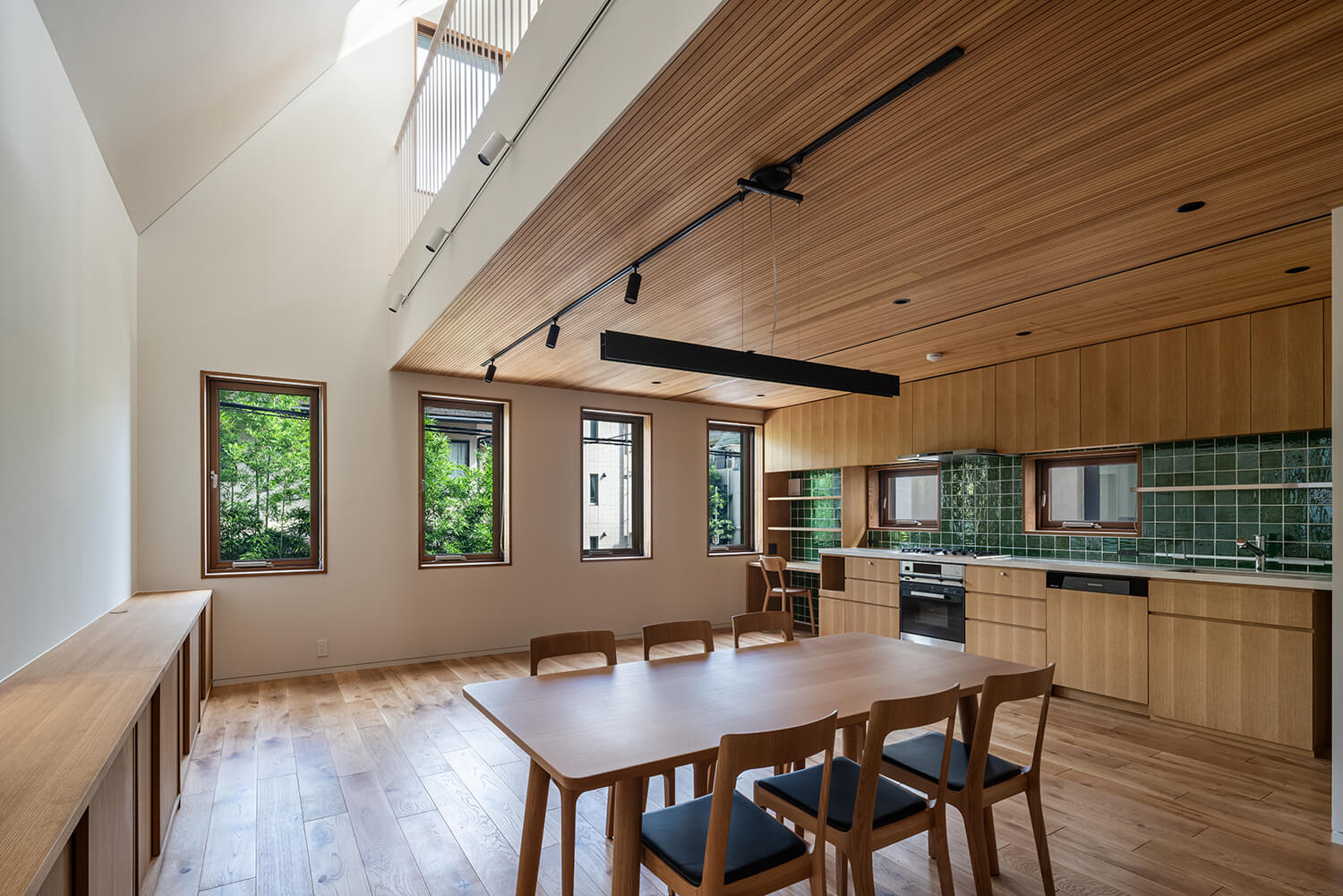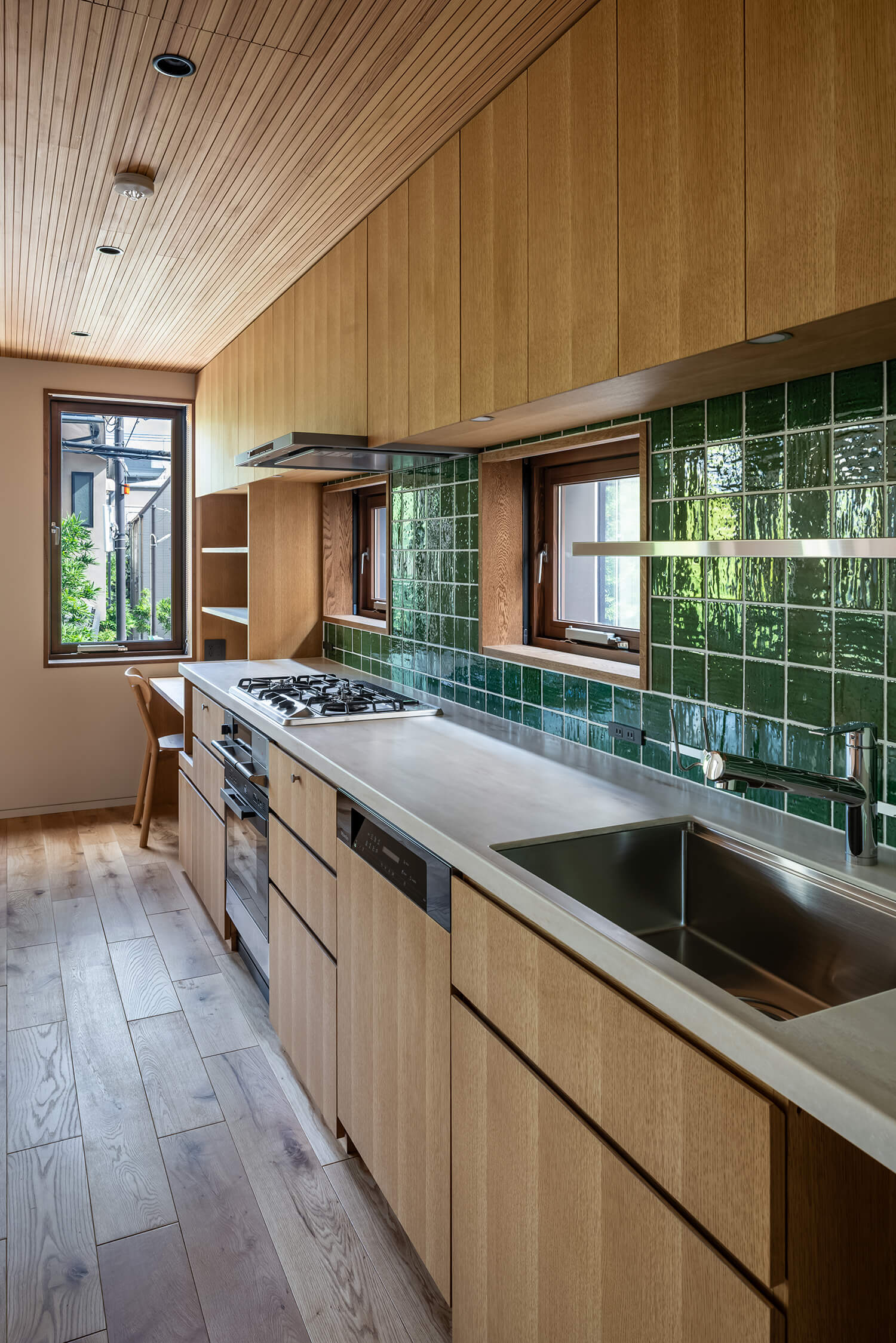 Interior materials include oak veneer furniture and joinery, timber window frames, a narrow-strip timber ceiling in the second-floor living room, and deep green tiles behind the kitchen. These materials acquire greater depth and character over time. Beyond their visual qualities, they provide tactile warmth and acoustic softness. Natural light animates their surfaces with shadow, enabling the family to experience the passage of time and develop a lasting attachment to the home.