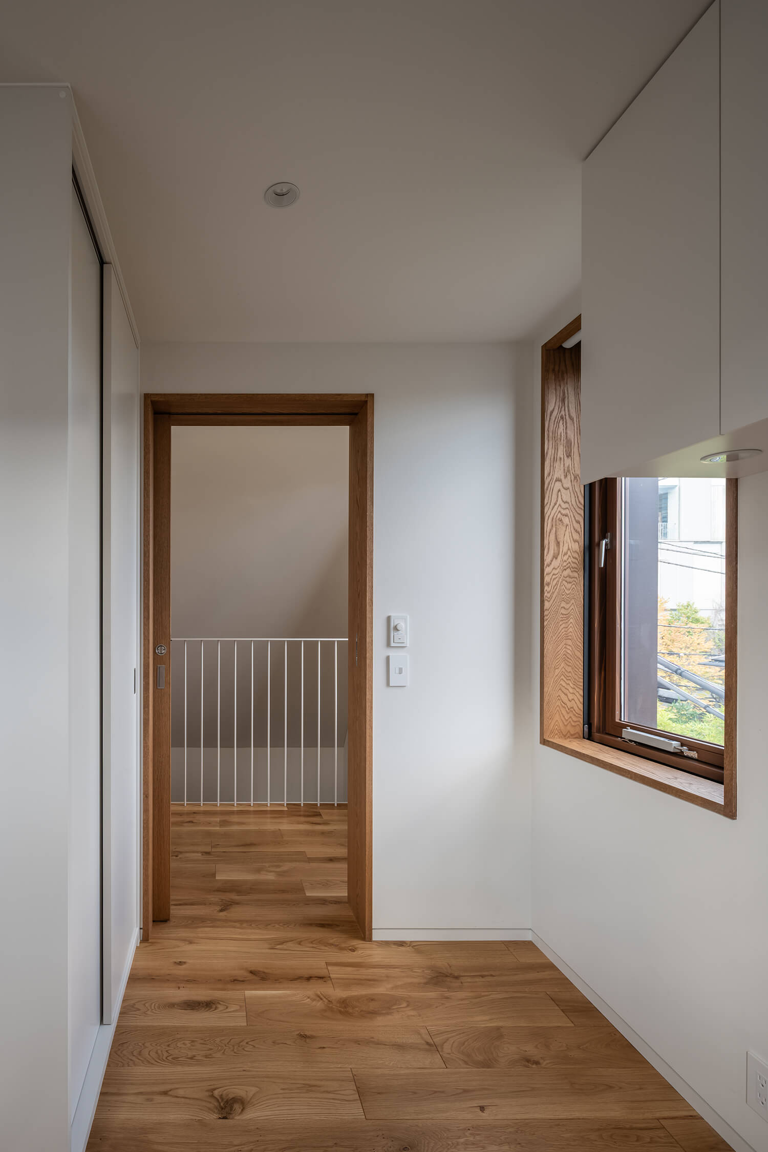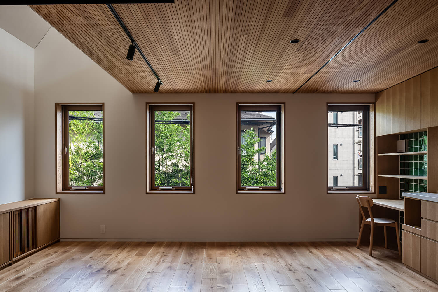 From the four windows of the second-floor living room facing the street, soft daylight enters while the bamboo grove of the house opposite unfolds as borrowed scenery. Ordinarily, the contrast between a bright exterior and interior shadow might make the room feel comparatively dark. Here, light from the high-side window supplements the frontal openings, producing an evenly lit interior in which the gaze extends naturally outward, enhancing the feeling of openness.