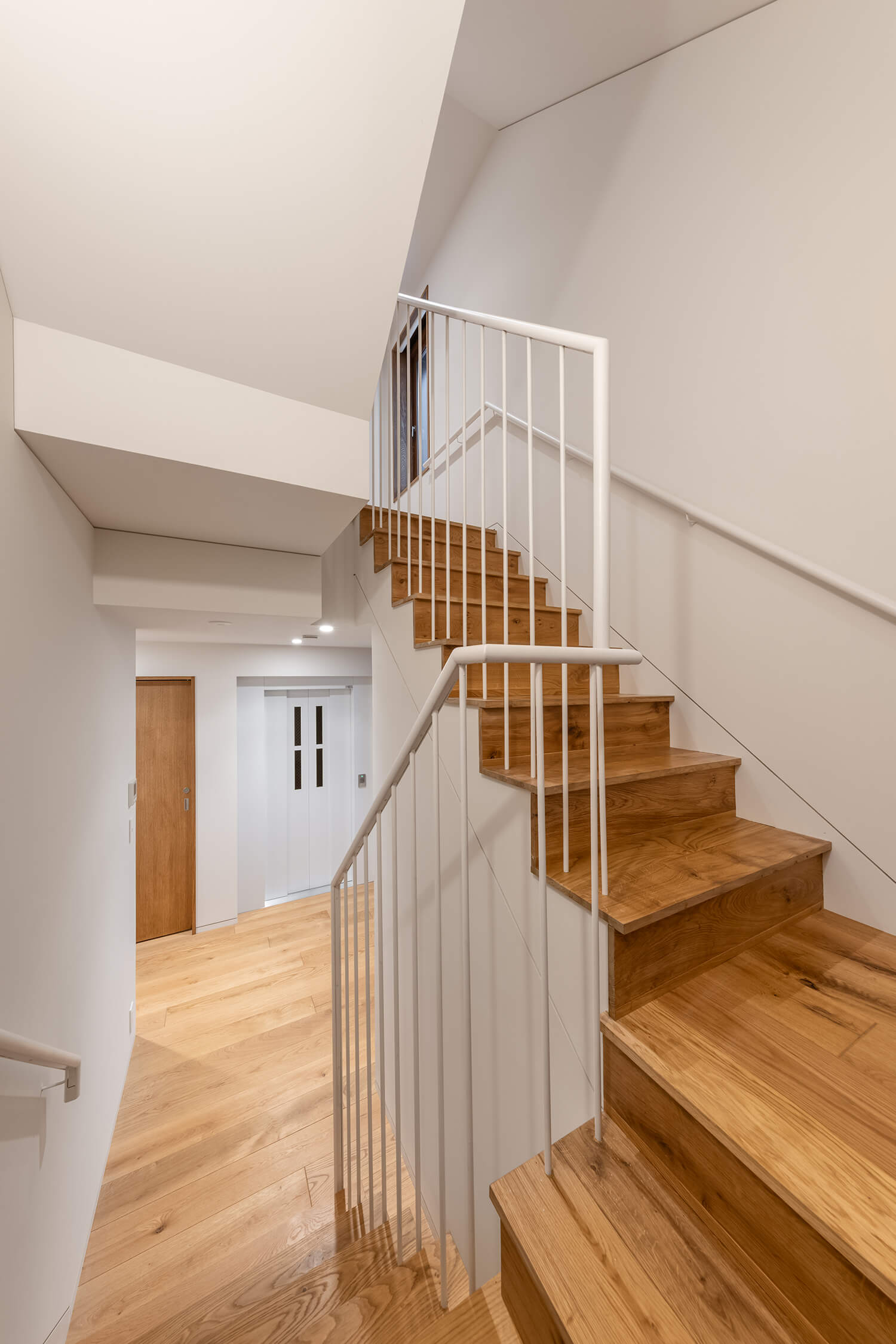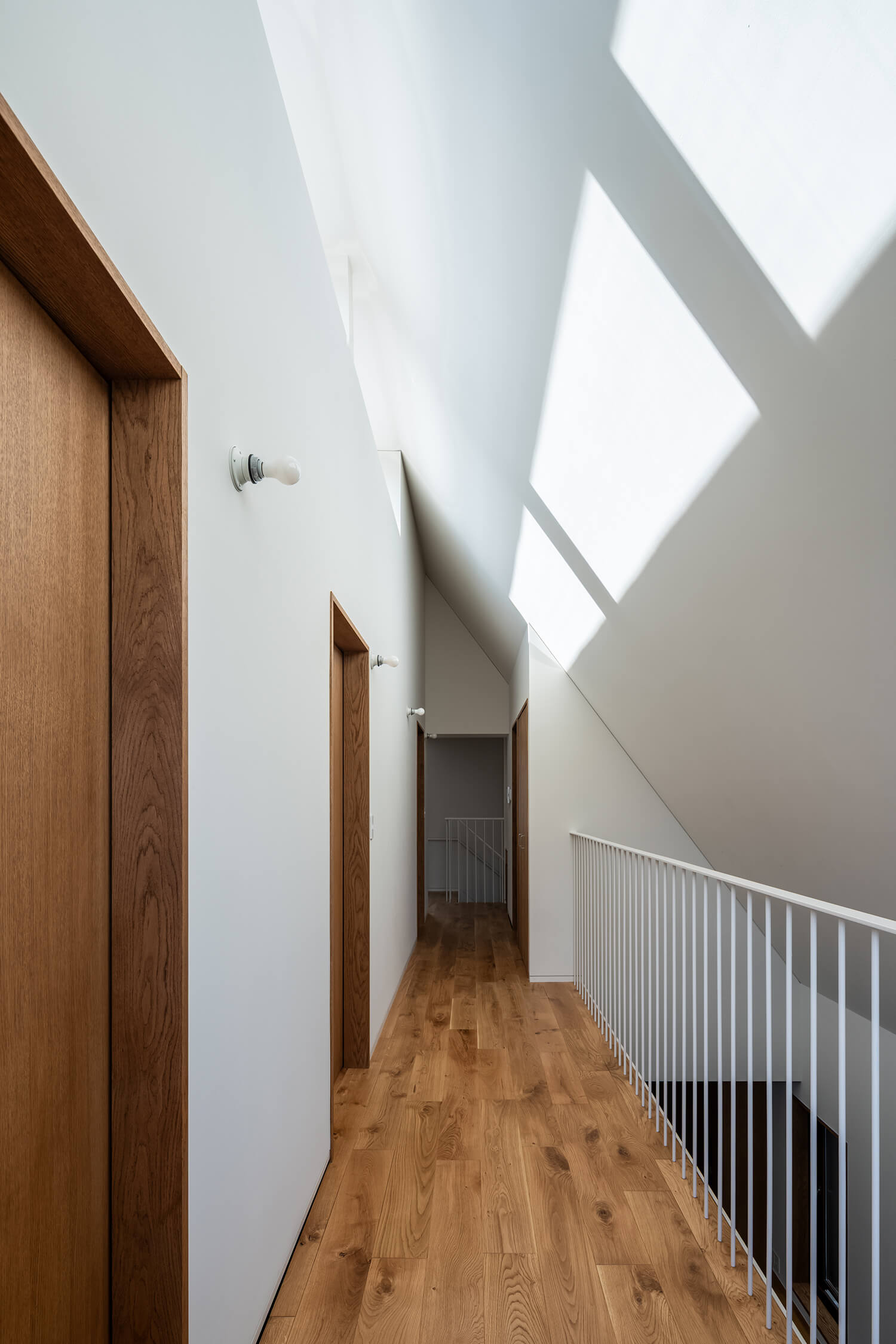 A corridor on the third floor wraps around the void, enabling the presence of family members to intersect vertically. Through the stairs and open volume, a sense of connection is maintained between levels, allowing inhabitants to remain aware of one another across floors.