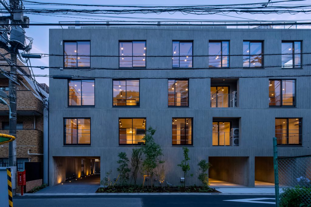 This characteristic facade is constructed with black sash and concrete panels. Corner entrance is finished with wooden mold concrete panel.