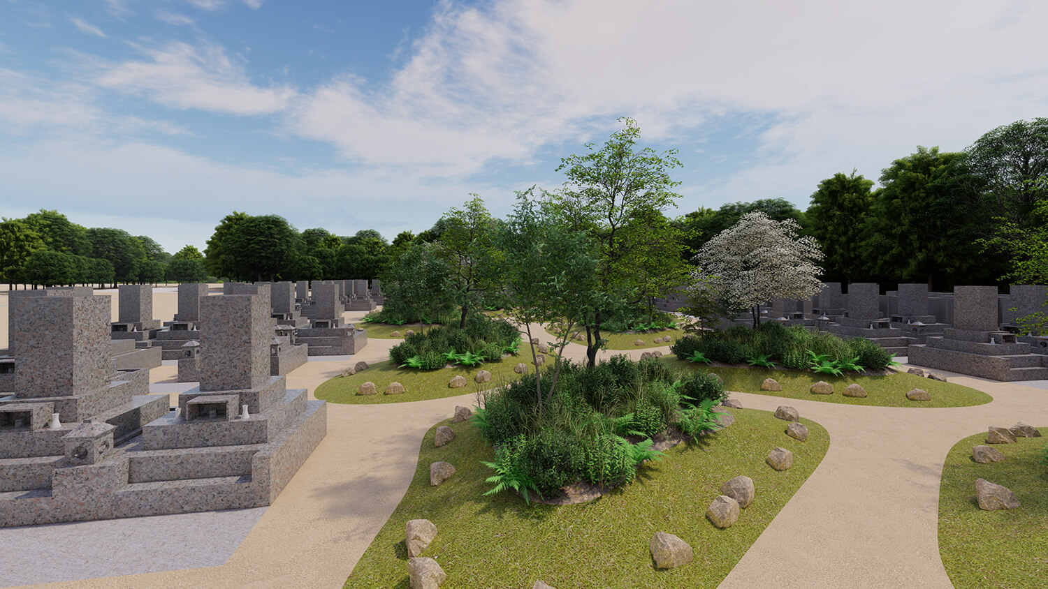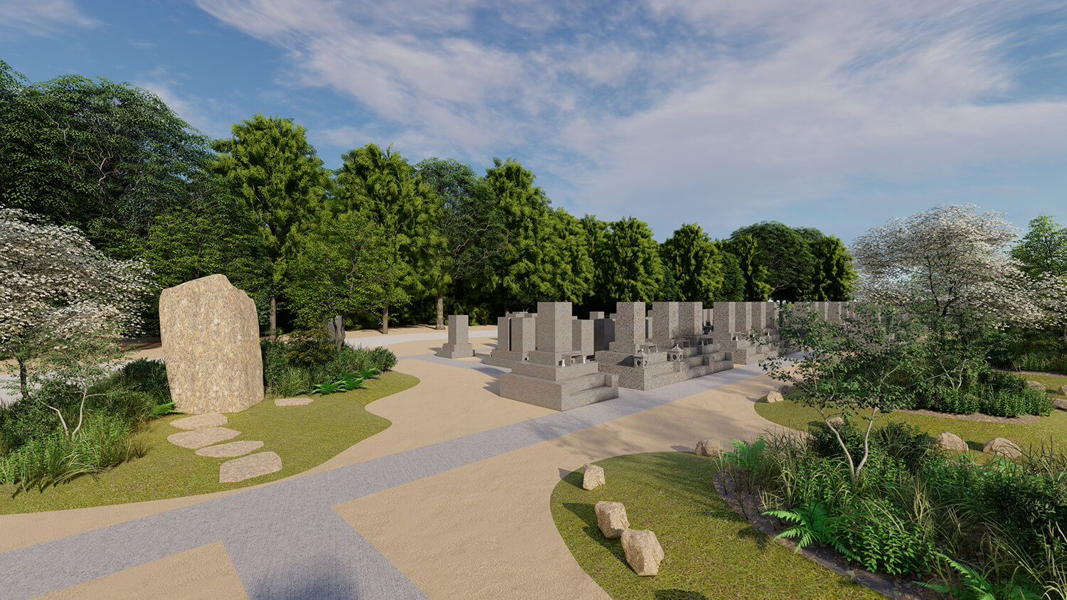 A tree-filled cemetery at Minamiyama Yasuragi Cemetery in Toyota City planned for 2021.