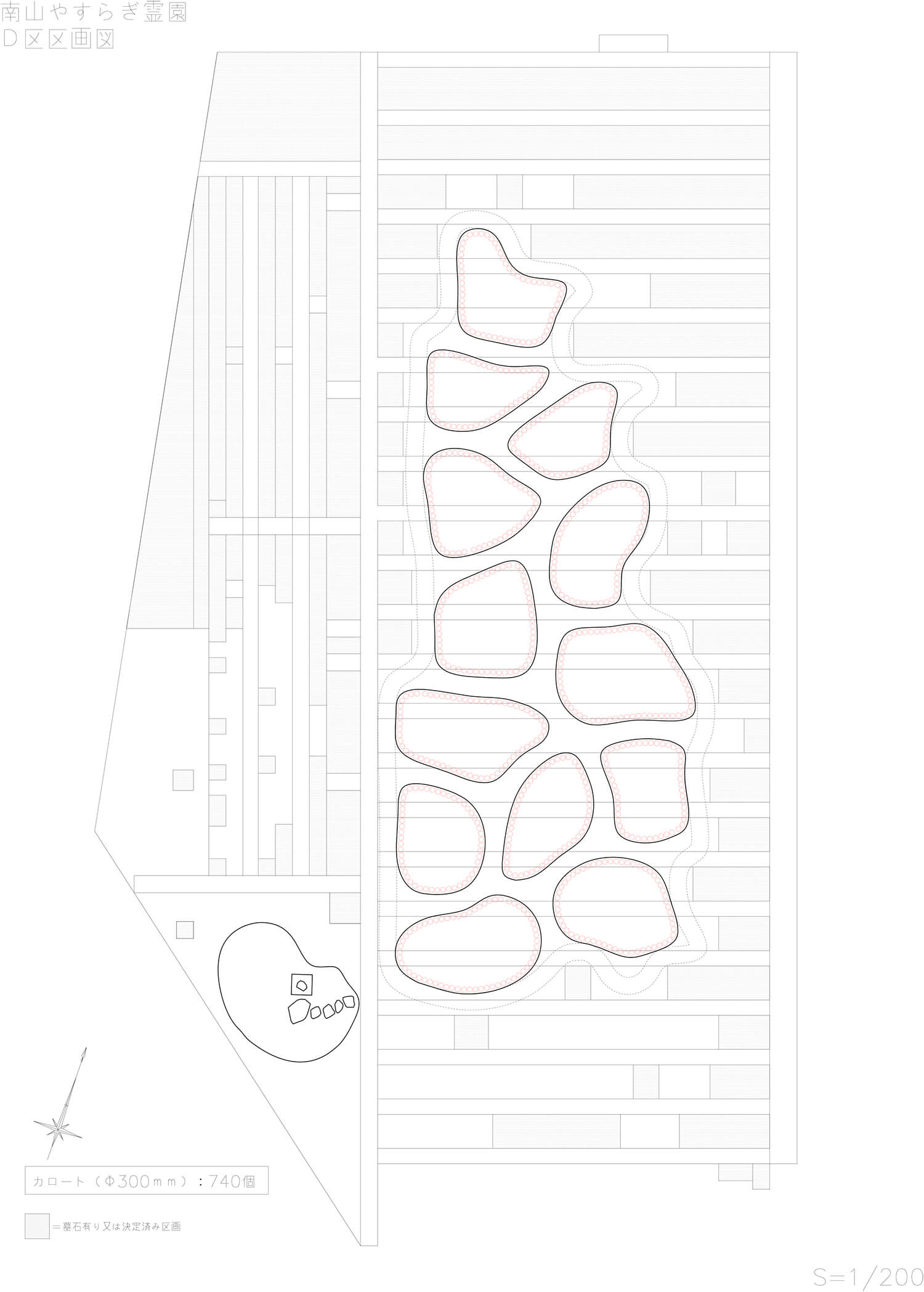 We planned to convert the cemetery into a tree-filled cemetery due to the increasing number of plots and returned cemeteries that could not be sold in the first place for general graves. The plan was to increase the number of island-like green spaces like an amoeba to accommodate the worm-eaten vacant sections. In the “graves that return to nature” proposed at Goshikidai Memorial Park and the Inagawa Cemetery’s tree-filled cemetery, no calotte is installed; instead, powdered remains are placed in hemp cloth and buried directly in the ground. The remains are biodegraded by microorganisms in the soil and turned into soil, which is then absorbed as nutrients by the surrounding trees, allowing the remains to “return to nature. Trees planted as grave markers grow, blooming, dropping their leaves, blooming again, and so on, and the souls of those buried in the ground coexist with this natural cycle.