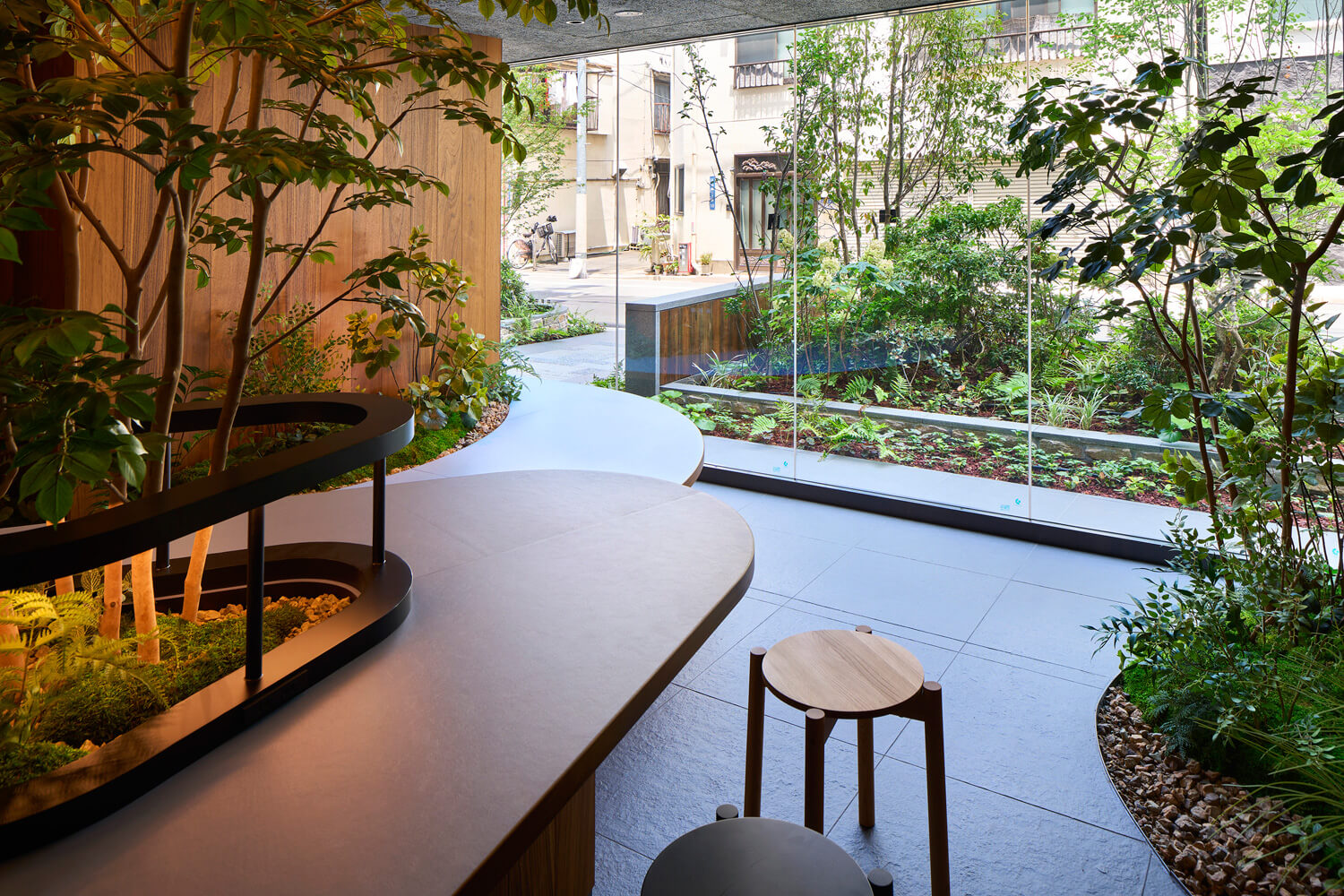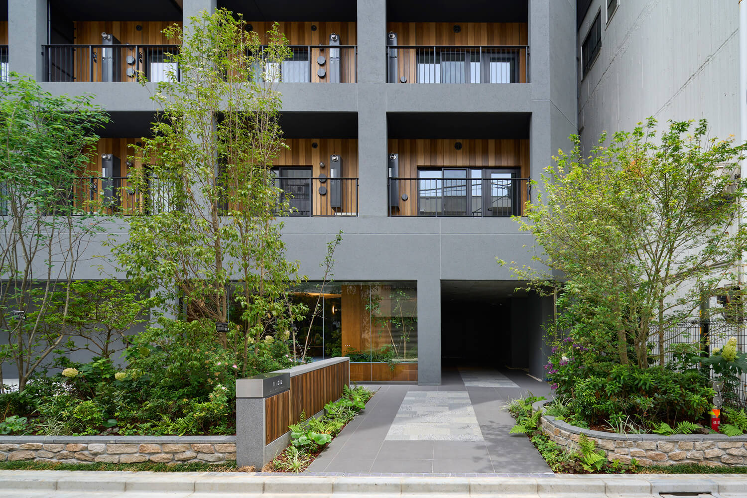 The materials used to support this spatial composition also incorporate thoughtful design elements to impart a gentle expression to the streetscape. The walls of the balconies and common corridors feature wood grain paint. This technique involves applying a light base colour to the concrete surface, then applying a darker colour before it dries, and finally using a wood-grain brush to scrape away the excess, creating a pattern resembling wooden planks. The pattern varies depending on the angle and pressure of the brush, making each one unique. This finish, which feels like handmade work despite being fake, adds warmth and individuality to the uniform urban space, serving as an element that stimulates the senses and memory, and reconnecting people with architecture in the city.