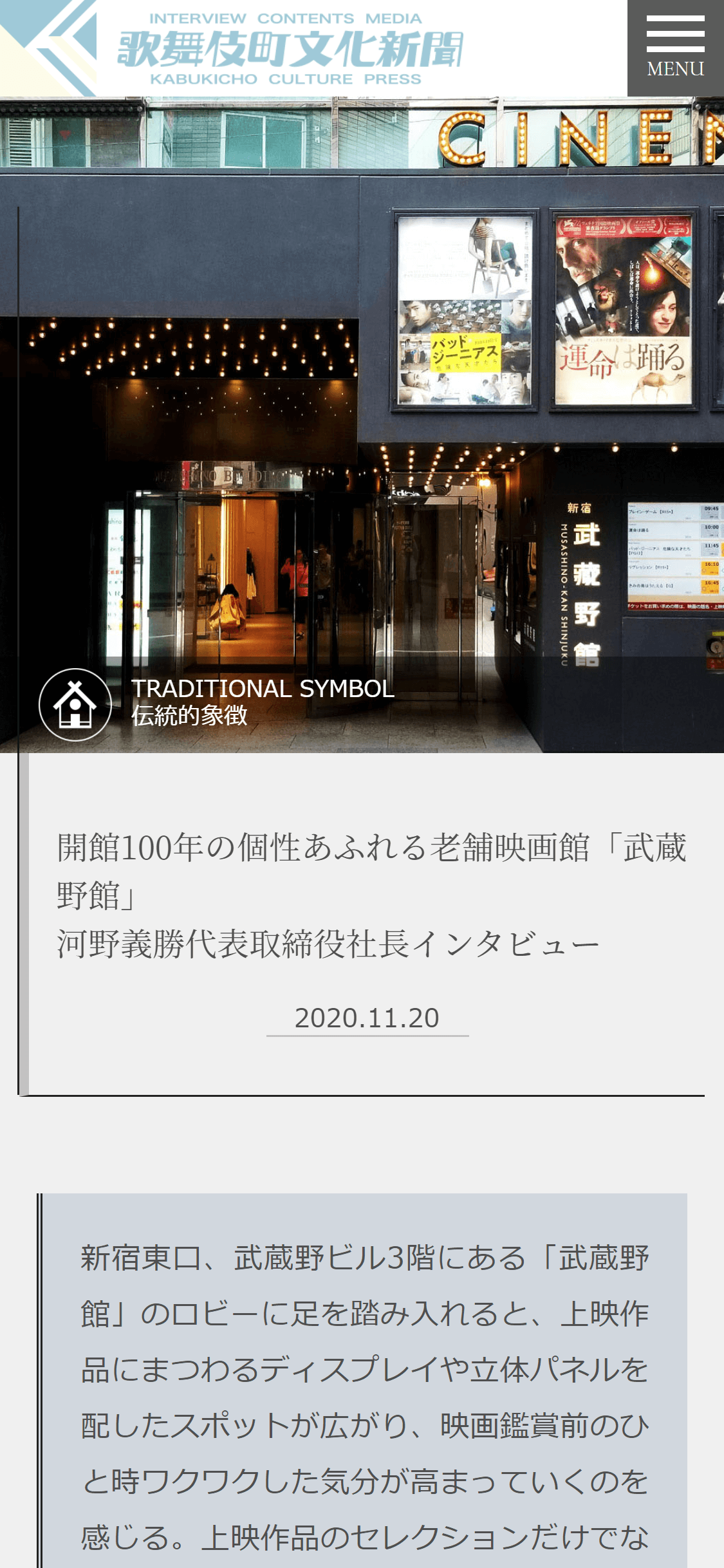...MORE改装設計をした映画館「新宿武蔵野館」が100周年を迎えました。 1920年からの様々なエピソードが河野社長のインタビュー記事で楽しめます。